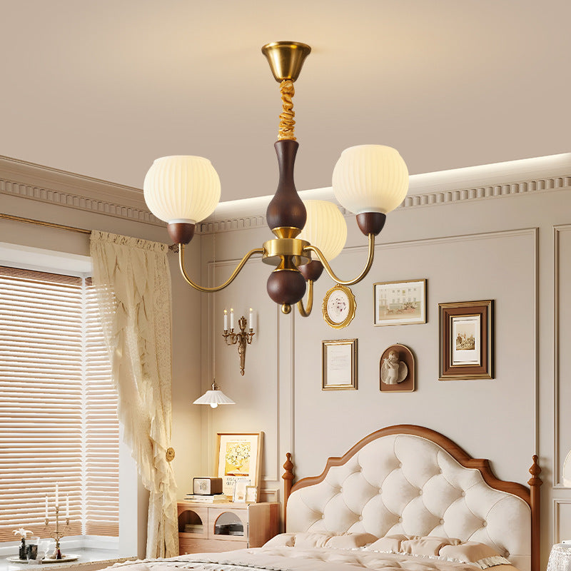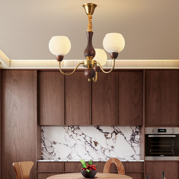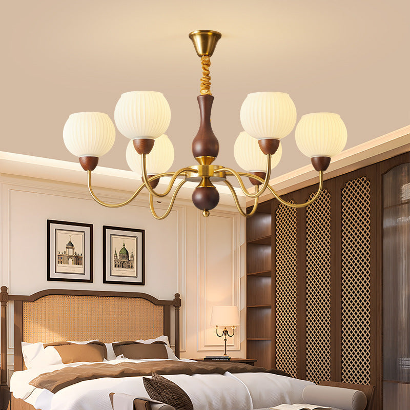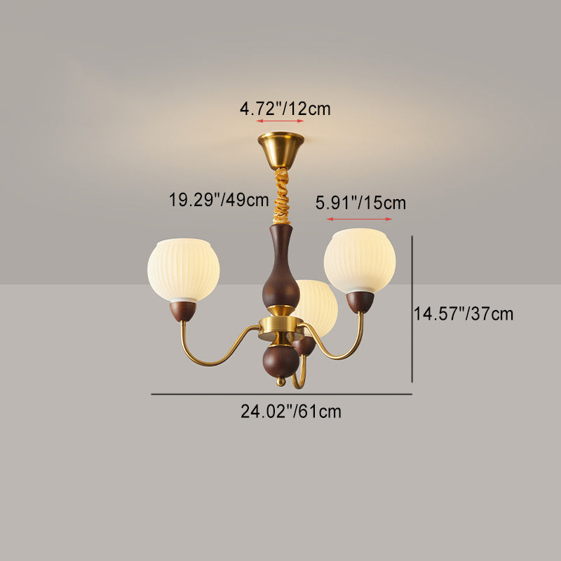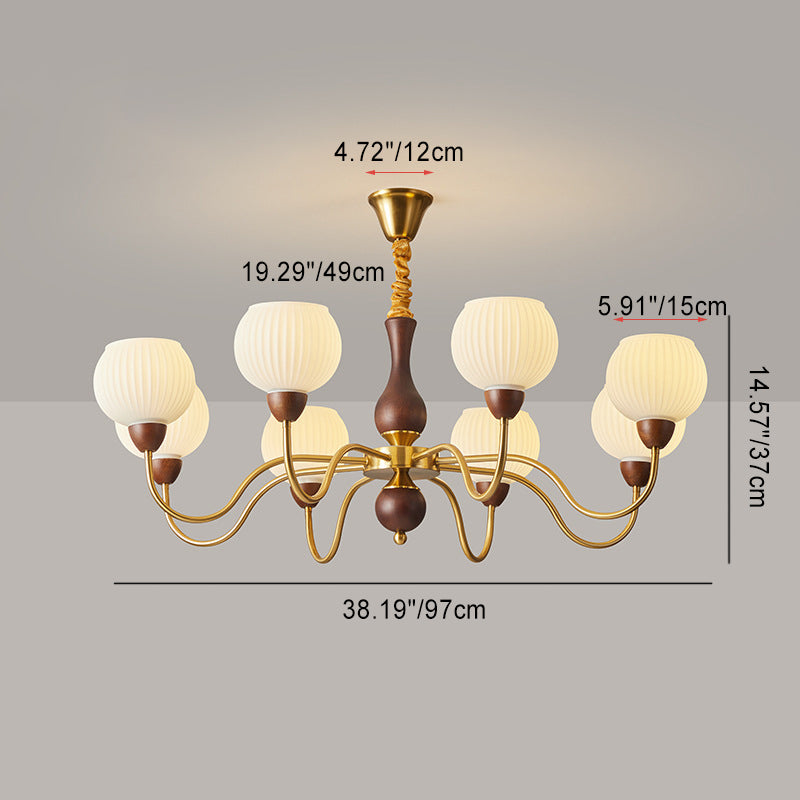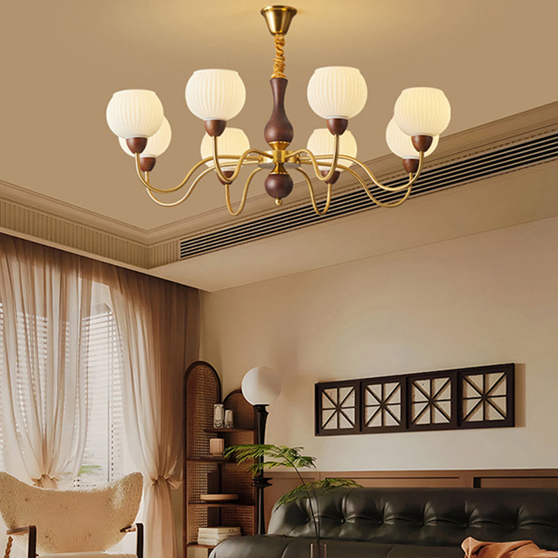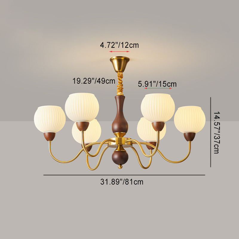 Contemporary Retro Curved Rod Round Cup Shape Iron Wood Frame Striped Glass Shade 3/6/8 Light Chandelier For Living Room