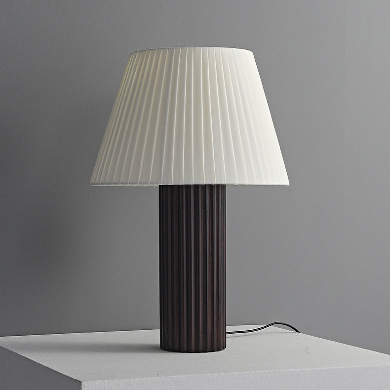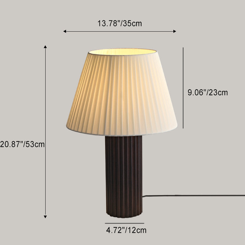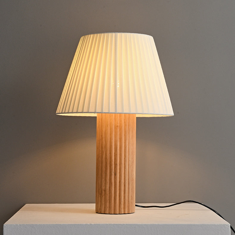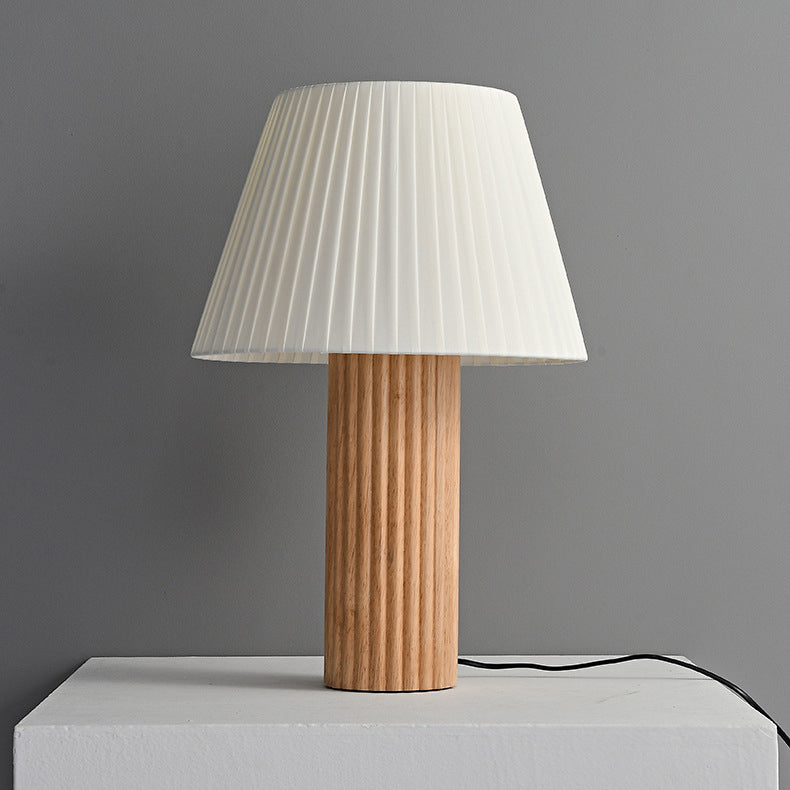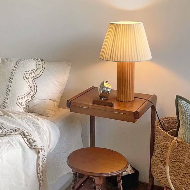 Contemporary Retro Cylinder Pleated Wood Fabric Brass 1-Light Table Lamp For Bedside