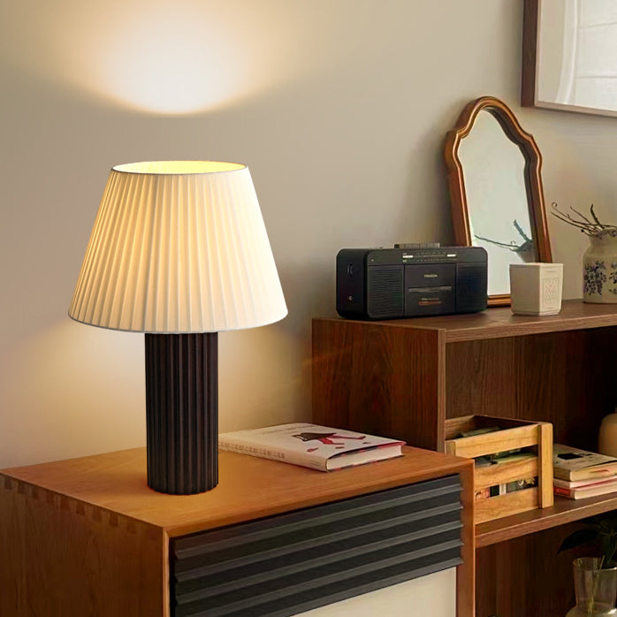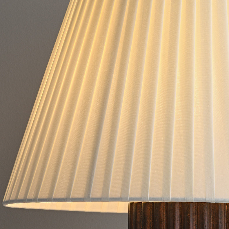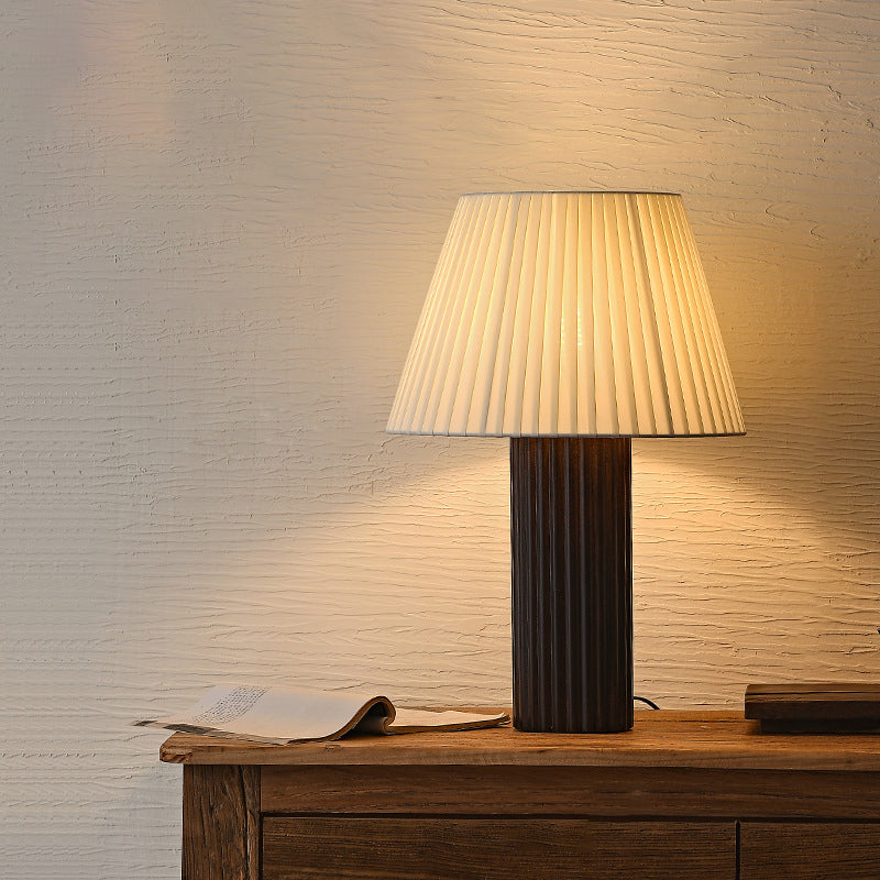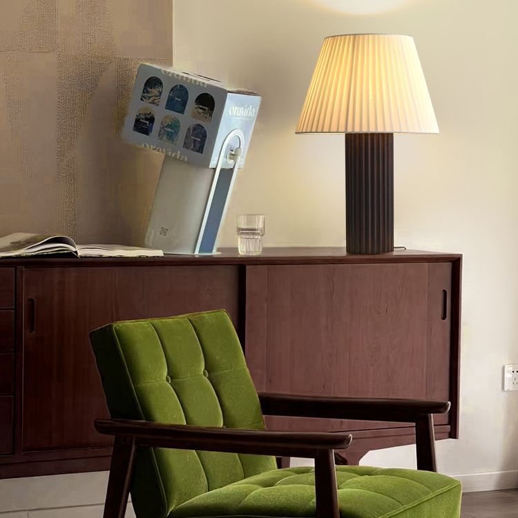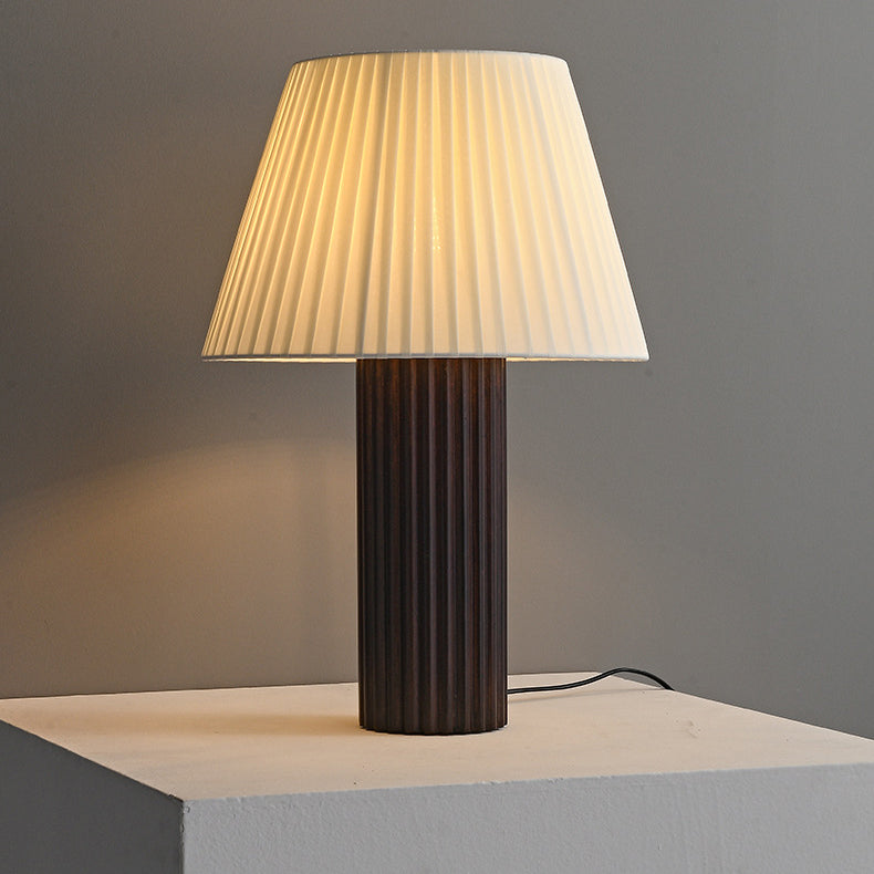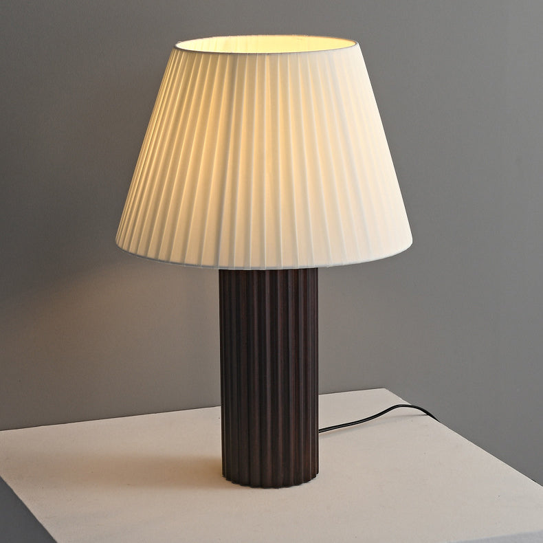 Contemporary Retro Cylinder Pleated Wood Fabric Brass 1-Light Table Lamp For Bedside