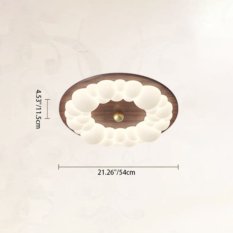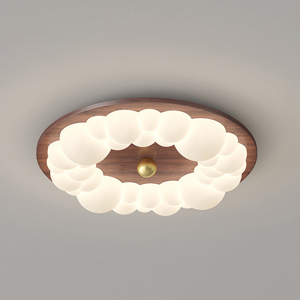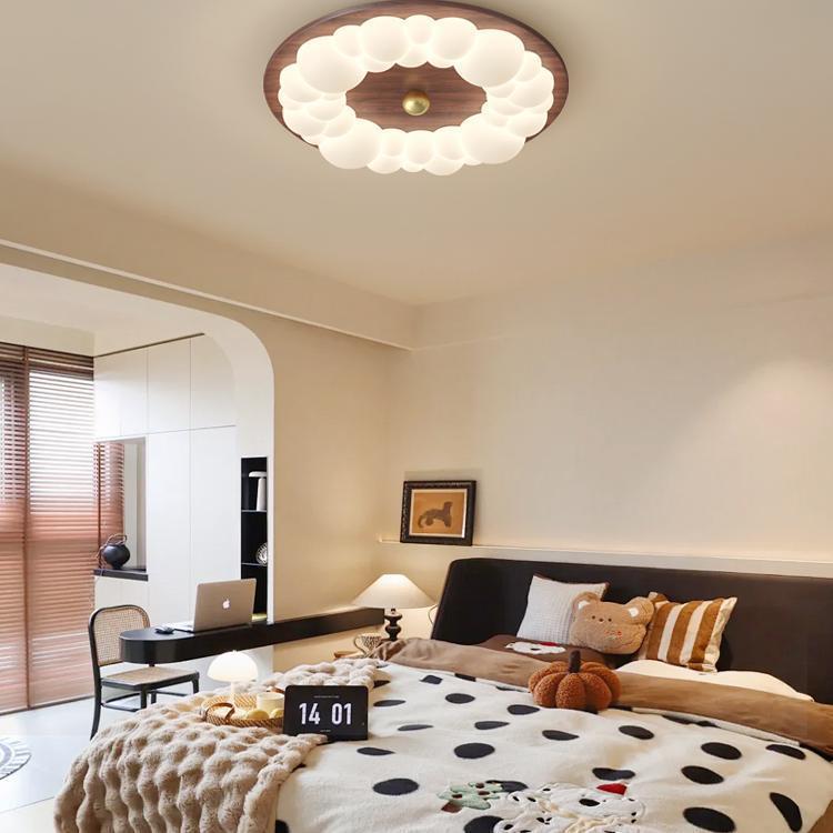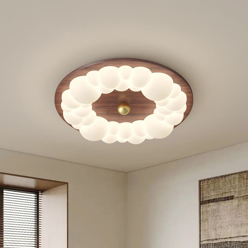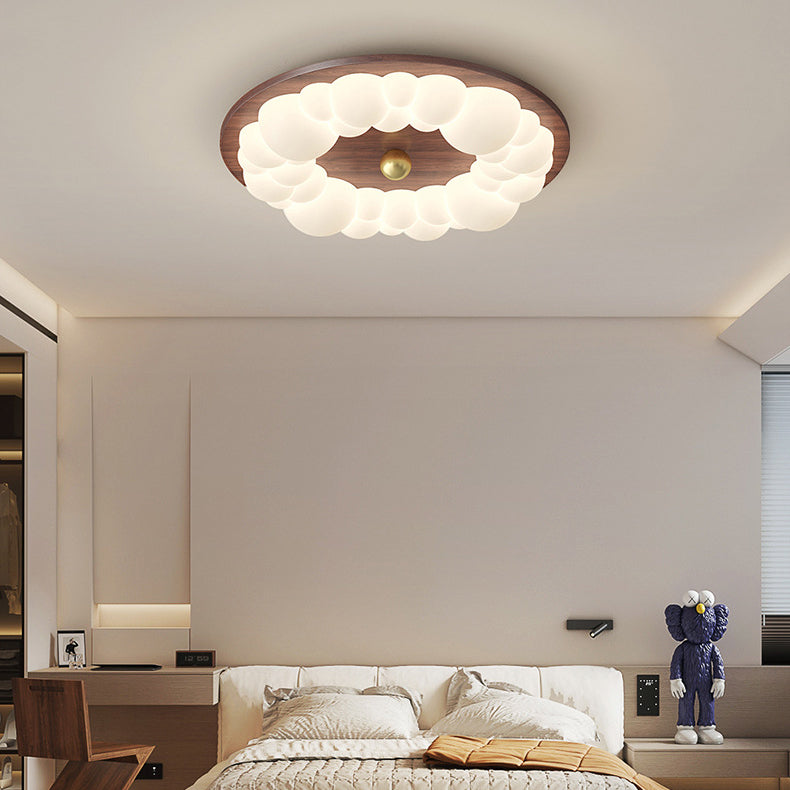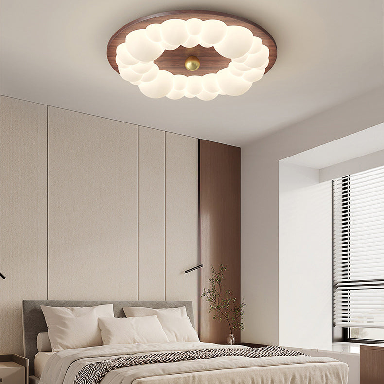 Contemporary Retro Iron PE Ash Wood Round Bubble LED Flush Mount Ceiling Light For Bedroom