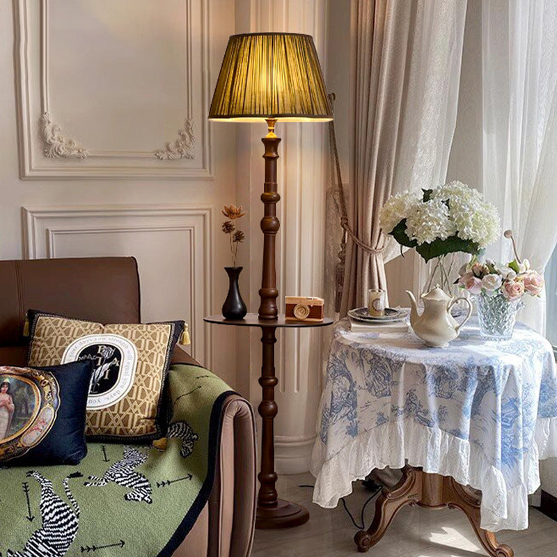 Contemporary Retro Pleated Fabric Shade Wooden Pole Base 1-Light Standing Floor Lamp For Home Office