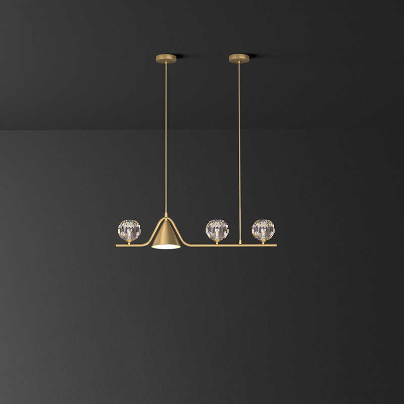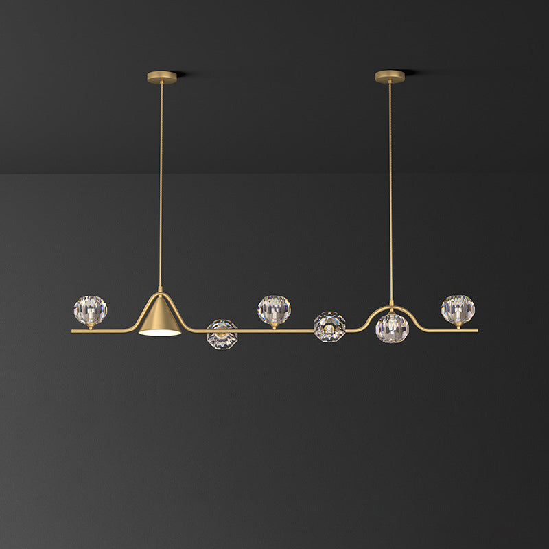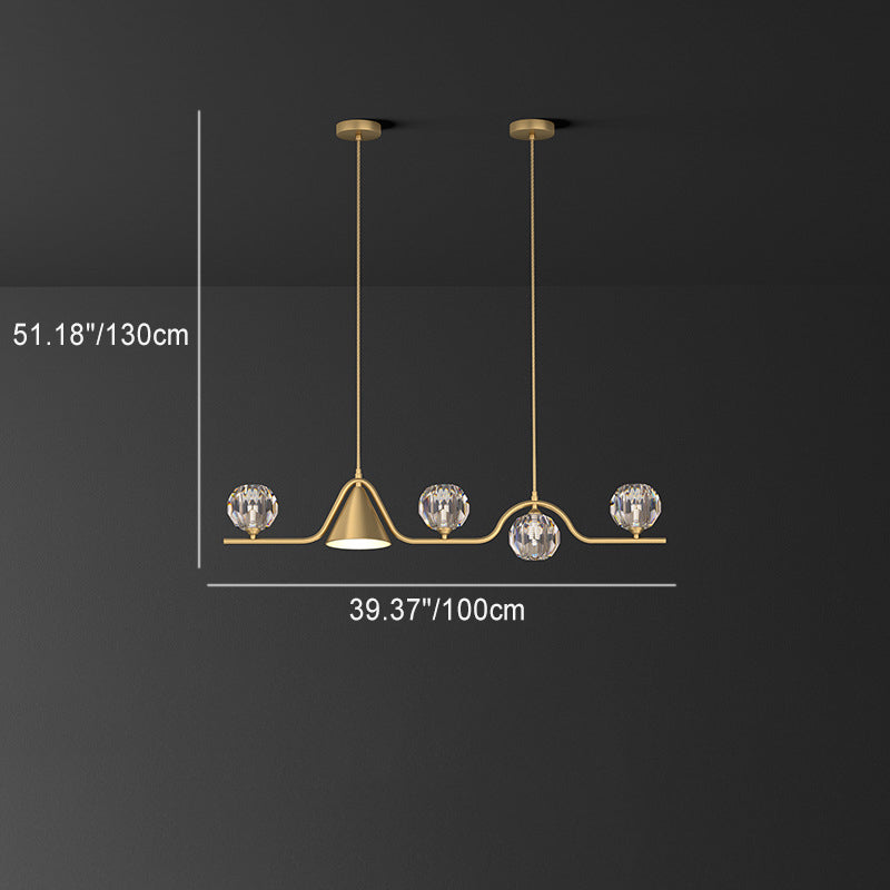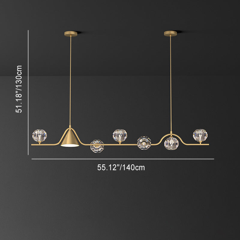 Crafted with high-transparency crystal shades and a corrosion-resistant brass body, this gold linear LED chandelier brings refined elegance to modern dining spaces. Its sleek conical design makes it ideal as an island light or dining table centerpiece.