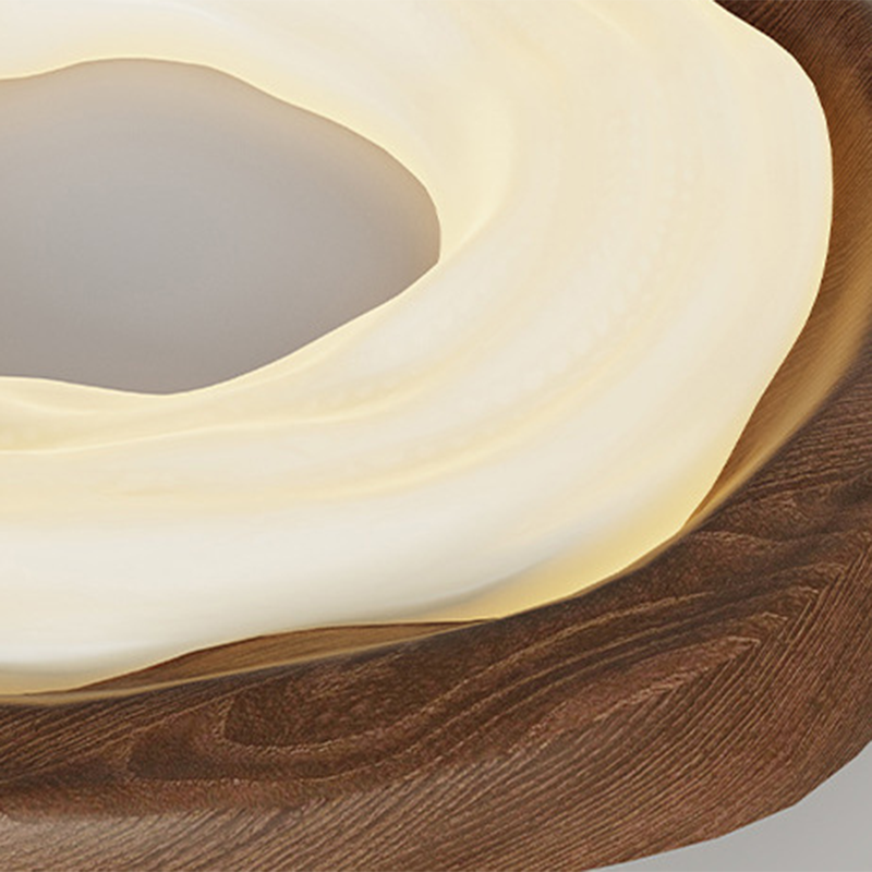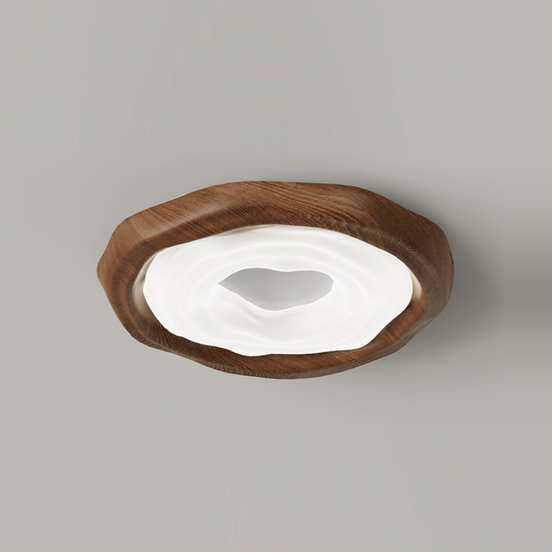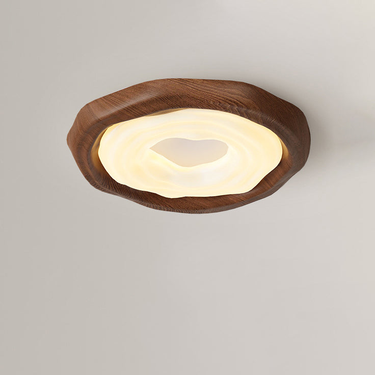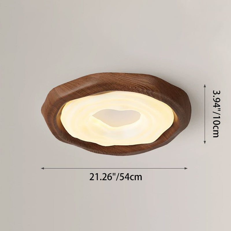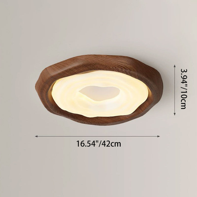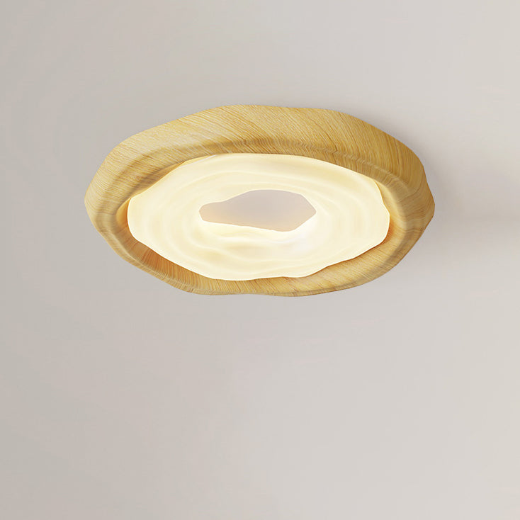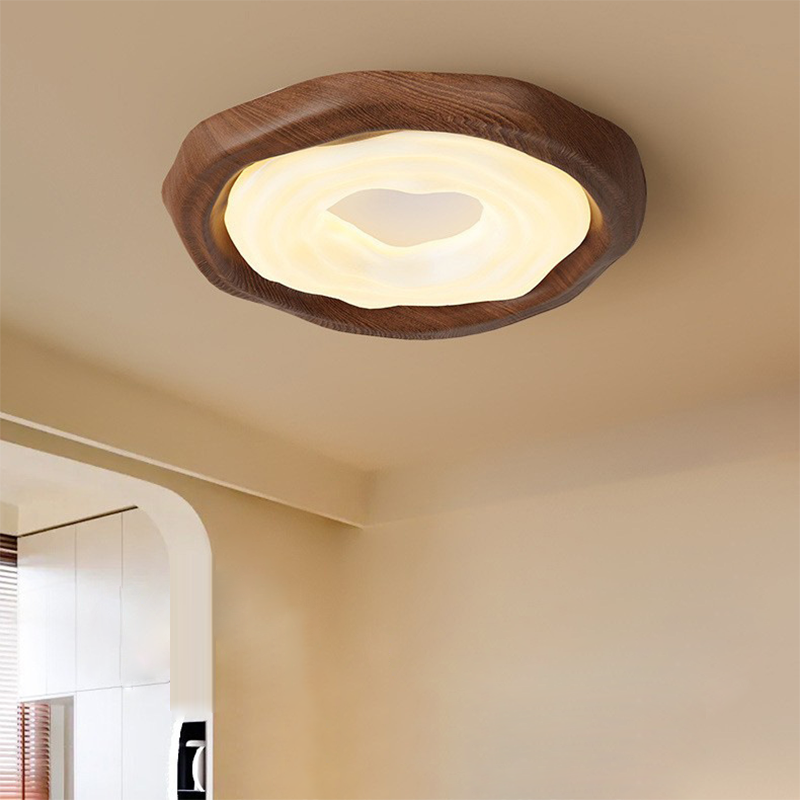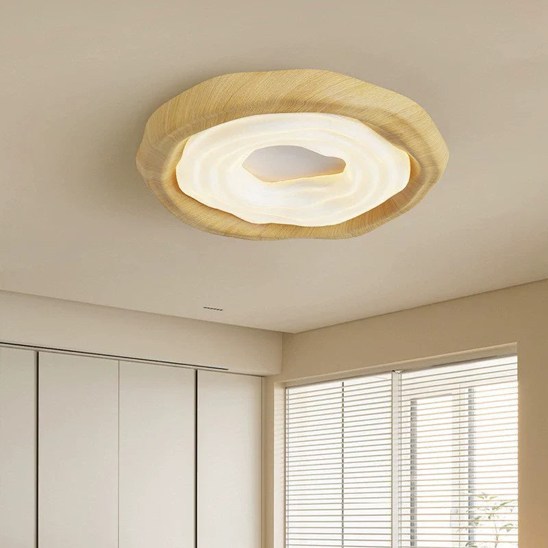 Contemporary Scandinavian Iron PE Round Imitation Cookie Wood Grain LED Flush Mount Ceiling Light For Bedroom