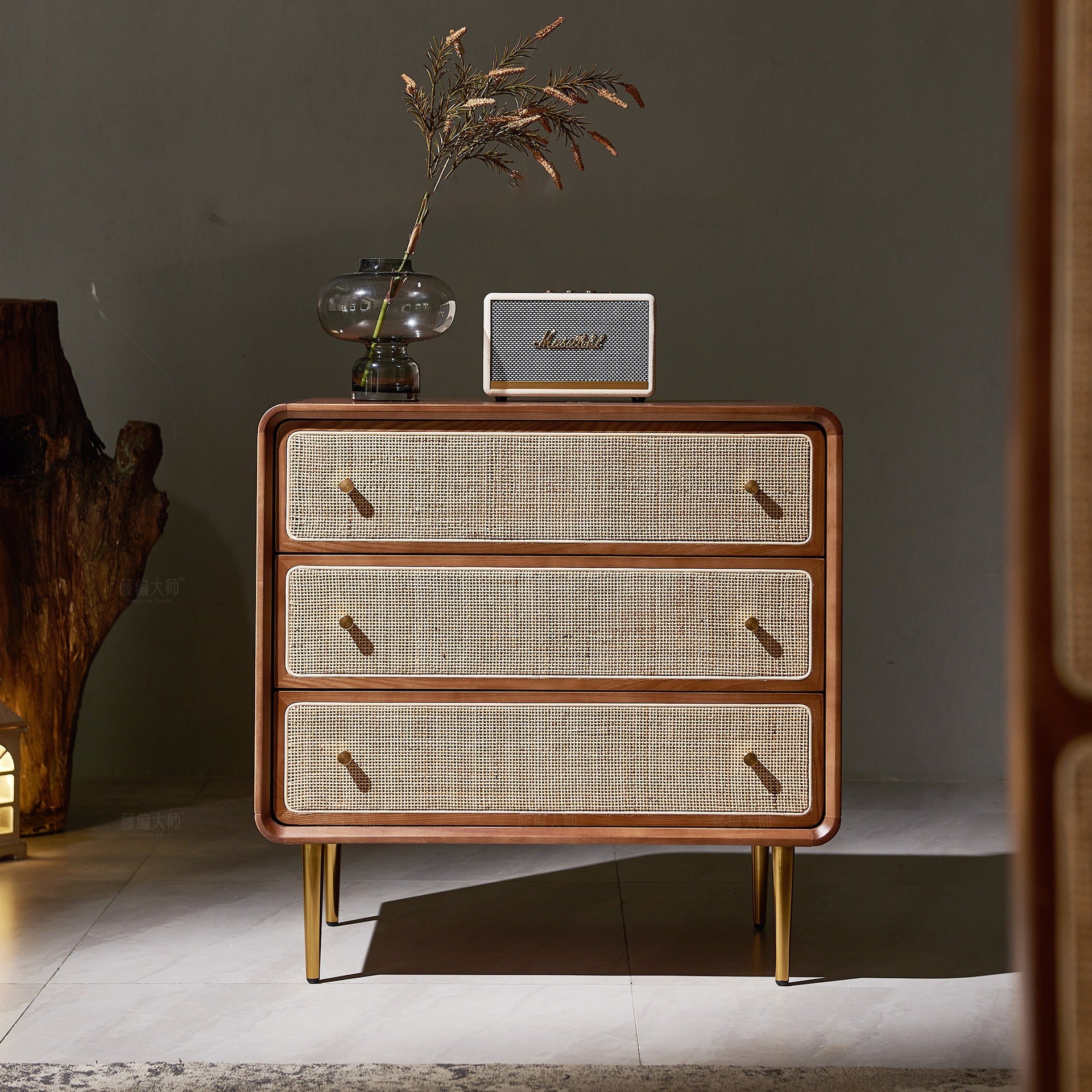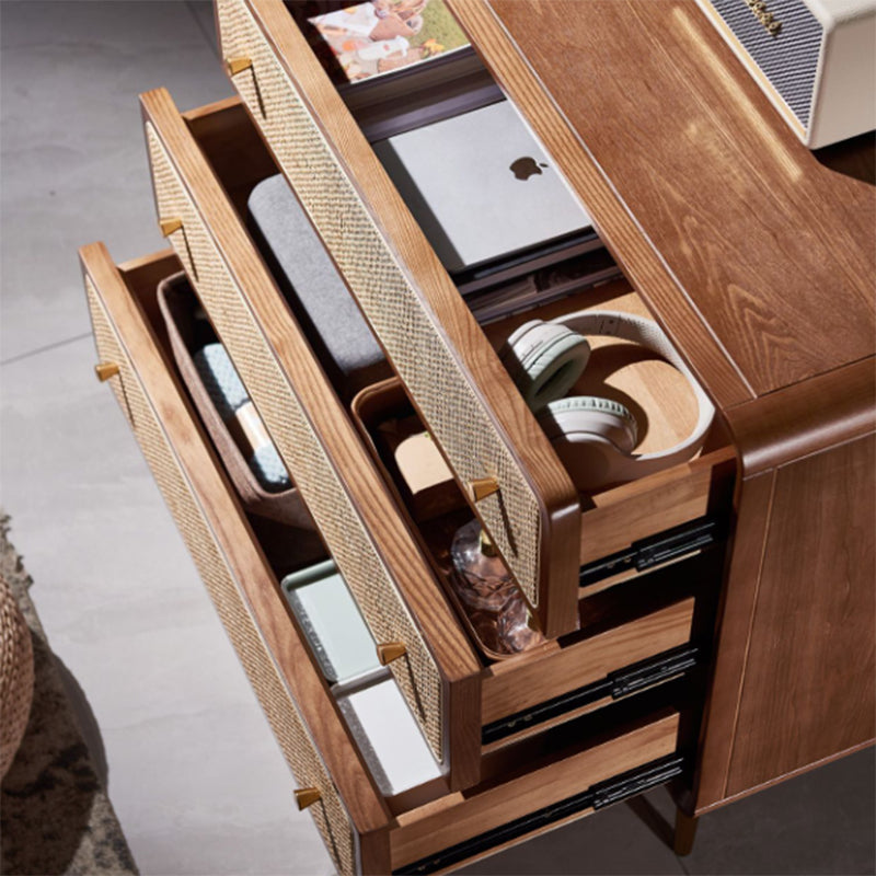 Contemporary Scandinavian Large Capacity Rectangular Ash Wood Solid Wood Multi-Layer Board Rattan Weaving Storage Cabinet 3-Drawer For Bedroom