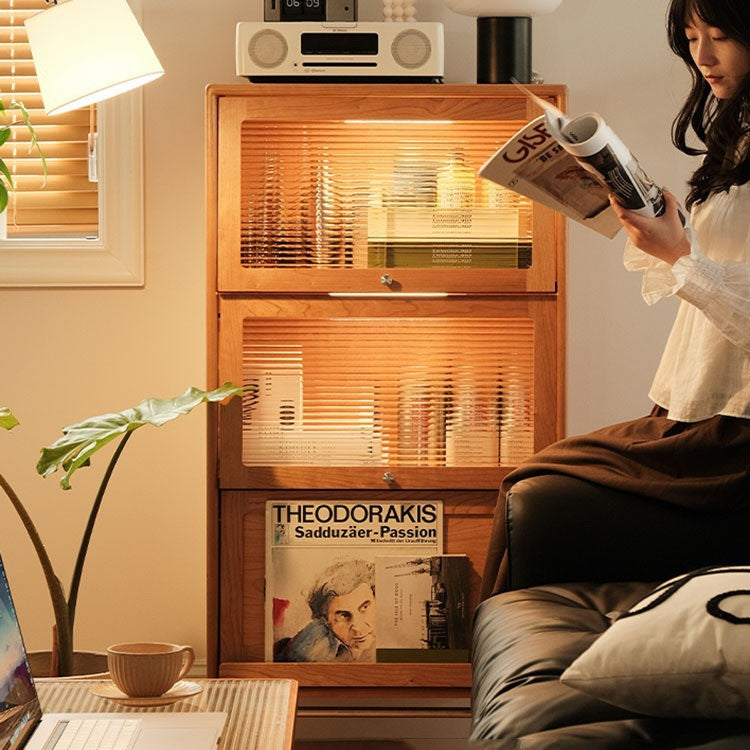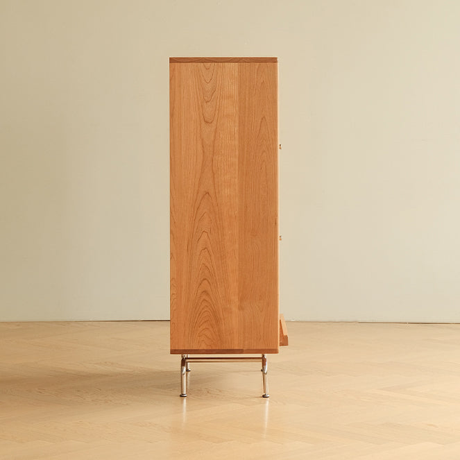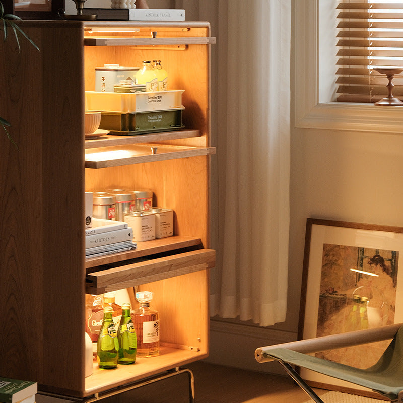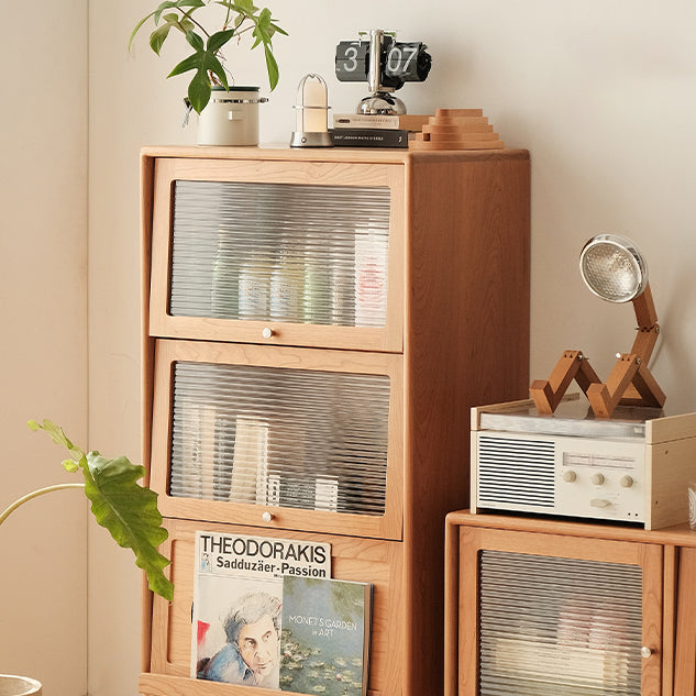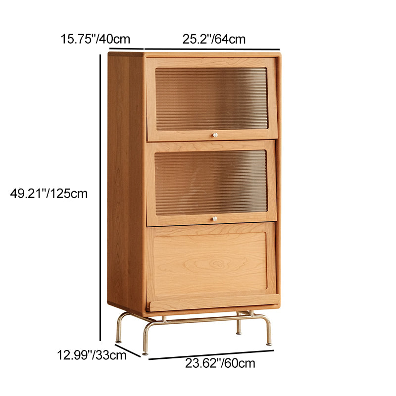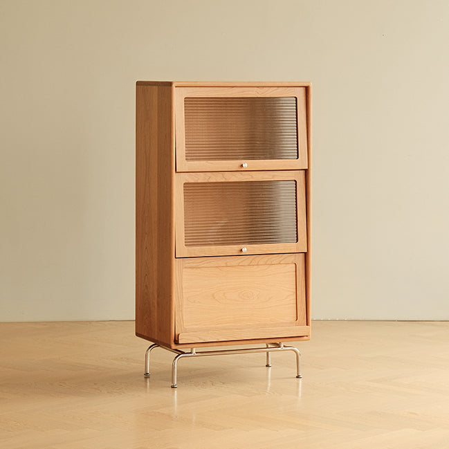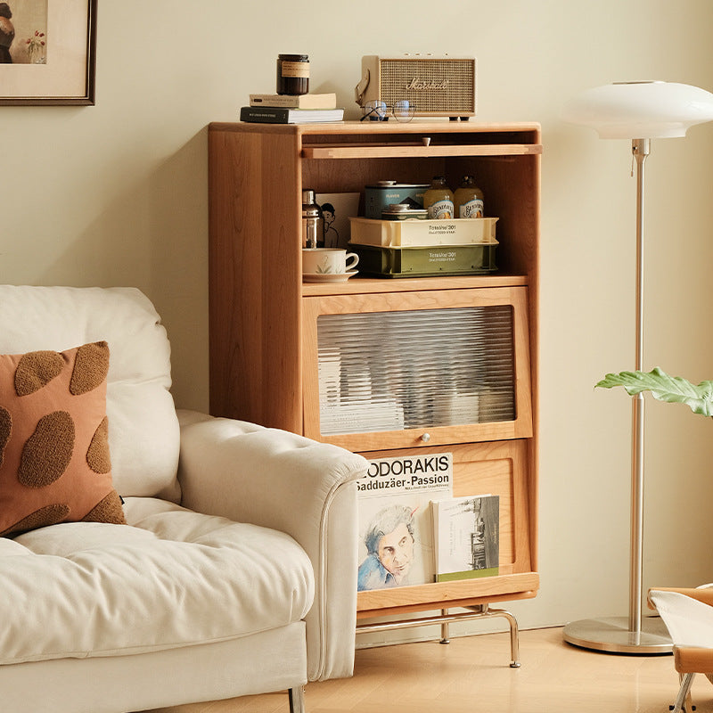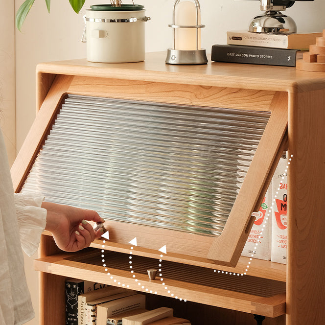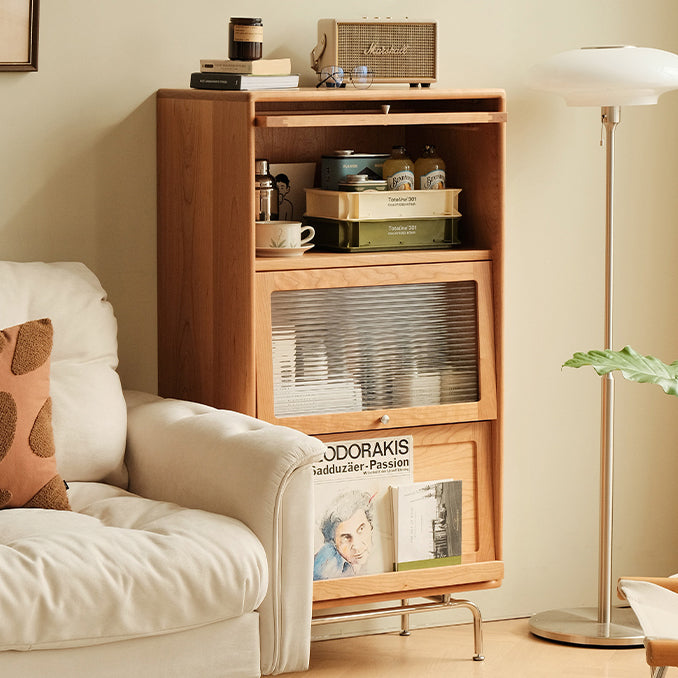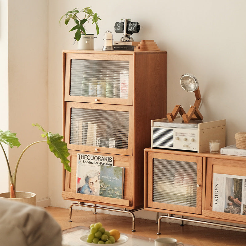 Made from solid pine, tempered glass, stainless steel, and durable metal, this contemporary Scandinavian side cabinet features 3 storage layers and a smooth curved rectangular shape. The natural wood finish, categorized compartments, and open-top surface provide both style and functionality for living room or dining room storage needs.