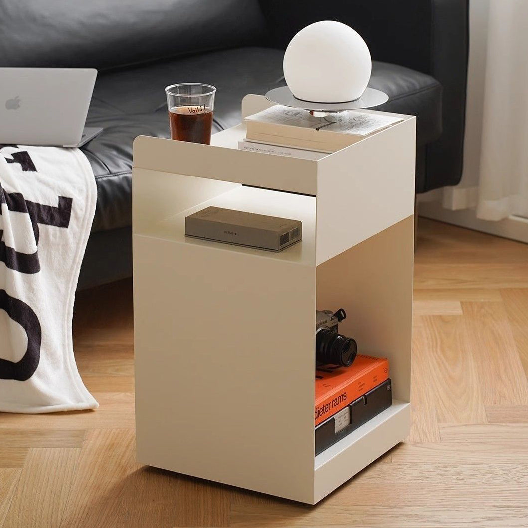 This modern 3-tier side table features a sleek irregular rectangular design crafted from wood and metal, offering both mobility and storage. Available in cream white, black, and red with a smooth tabletop—perfect for adding function and flair to bedrooms or living rooms.