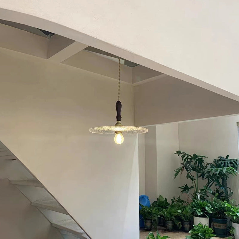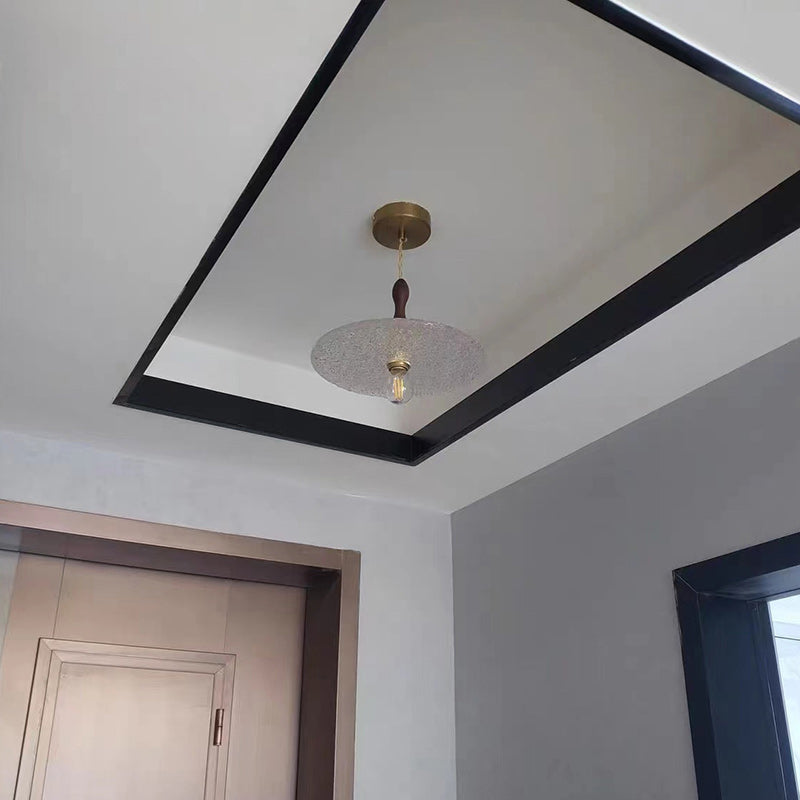 Contemporary Vintage Round Disc Copper Wood Glass 1-Light Pendant Light For Living Room
