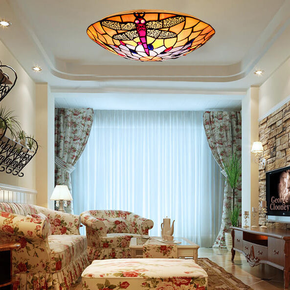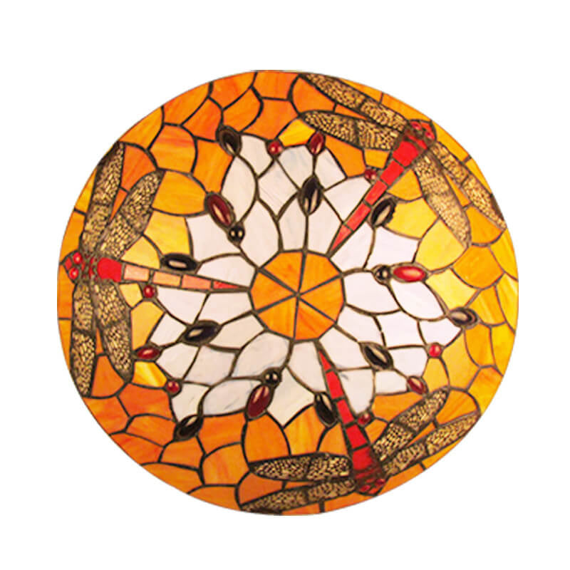 European Tiffany Orange Dragonfly Glass 2/3 Light Flush Mount Ceiling Light