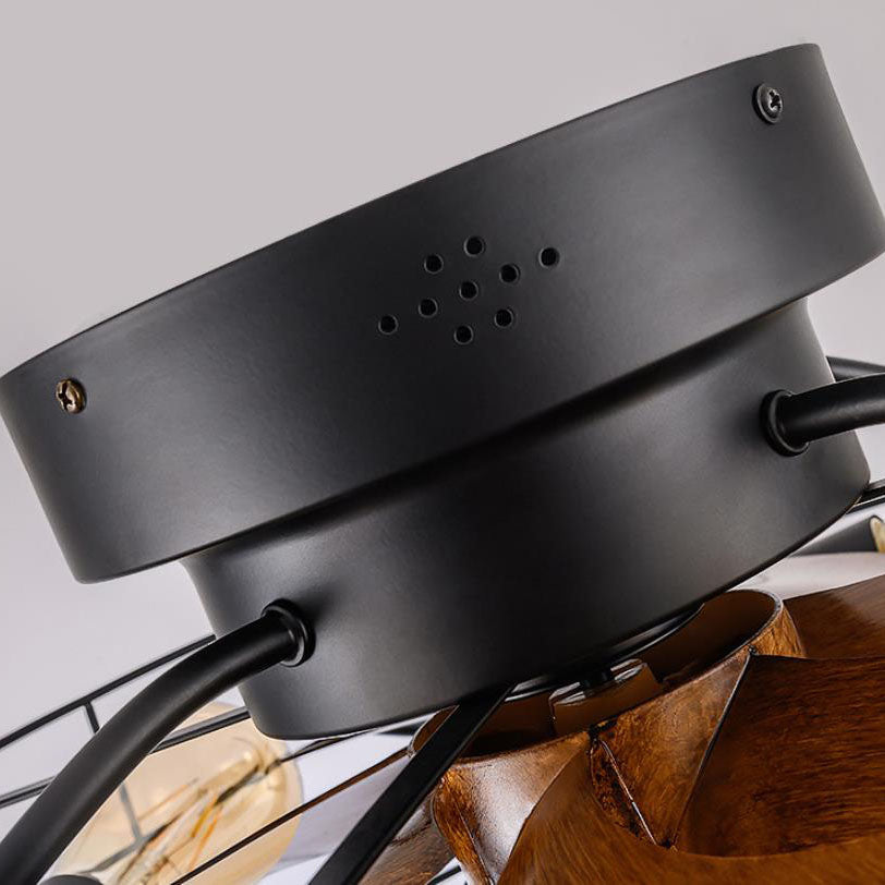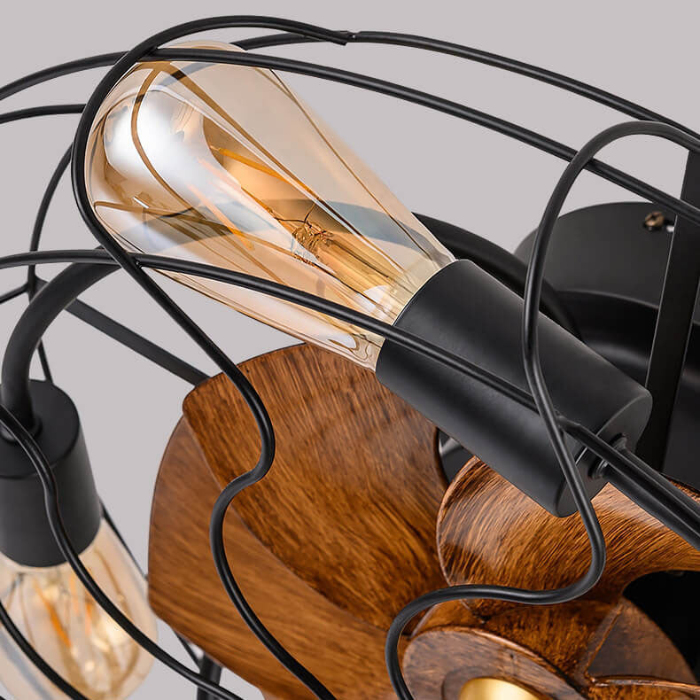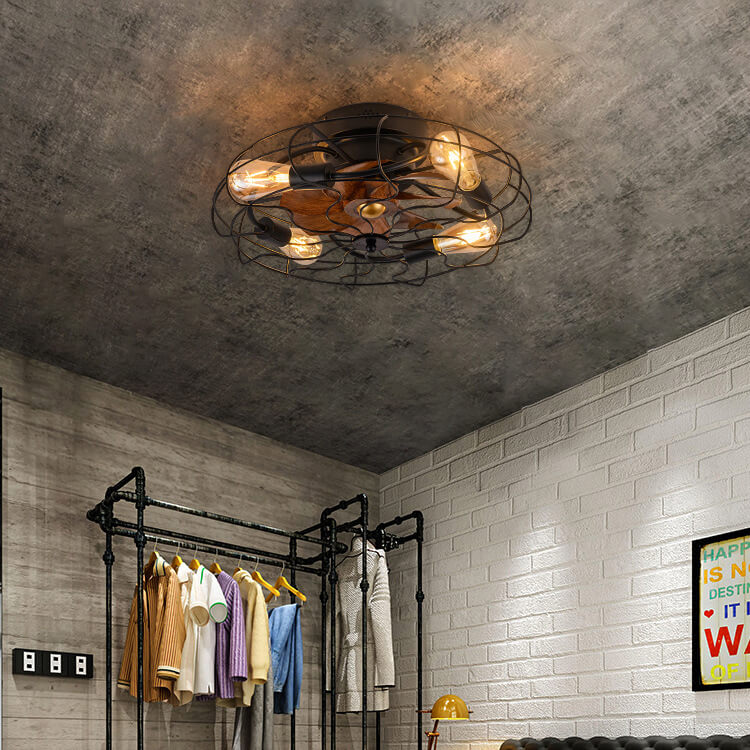 Industrial Vintage Wood Grain Drum Cage Design 3-Light Flush Mount Ceiling Fan Light