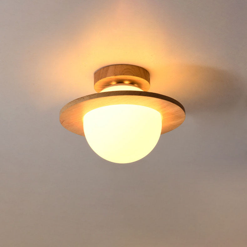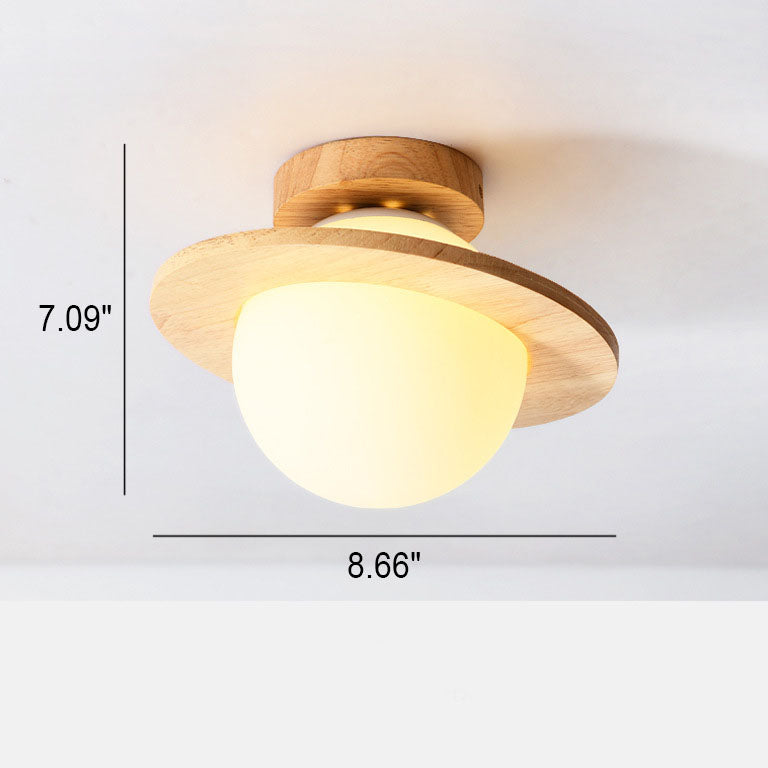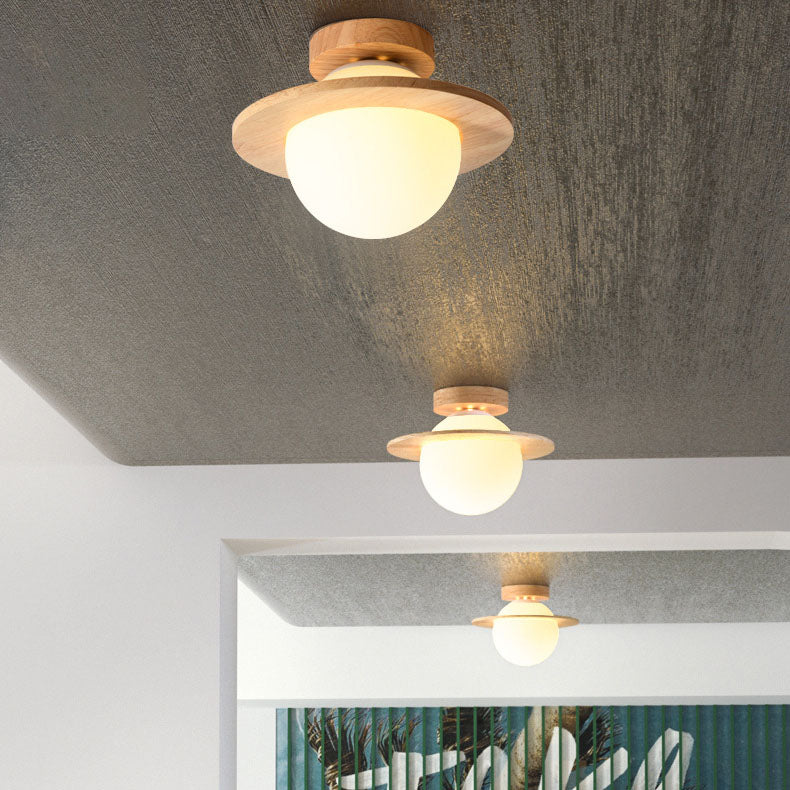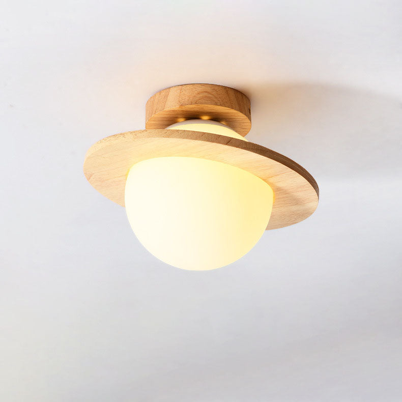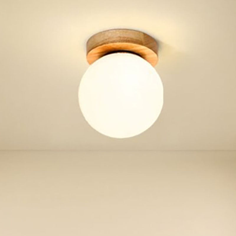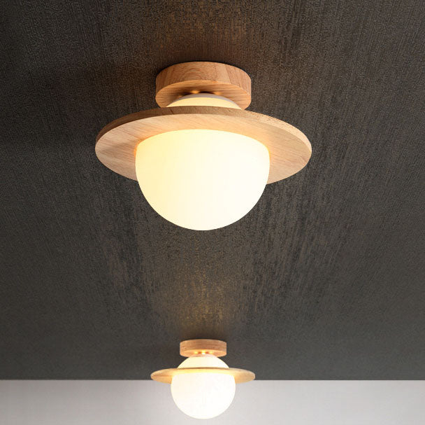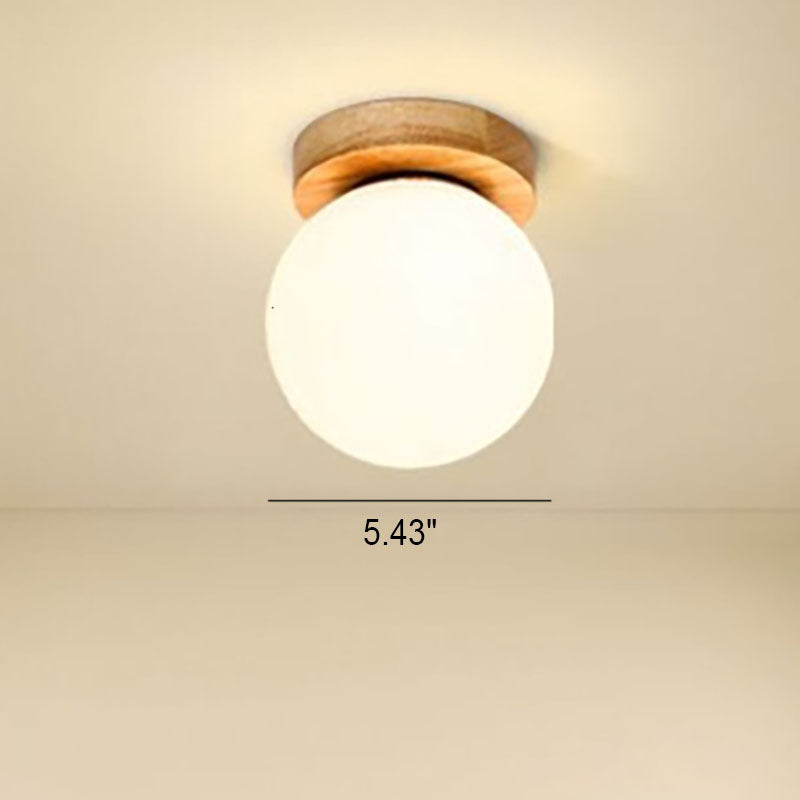 Japanese Minimalist Round Ball Wooden Glass 1-Light Semi-Flush Mount Light