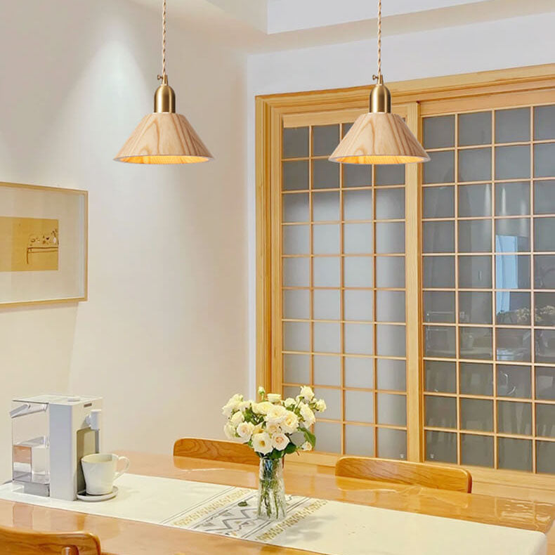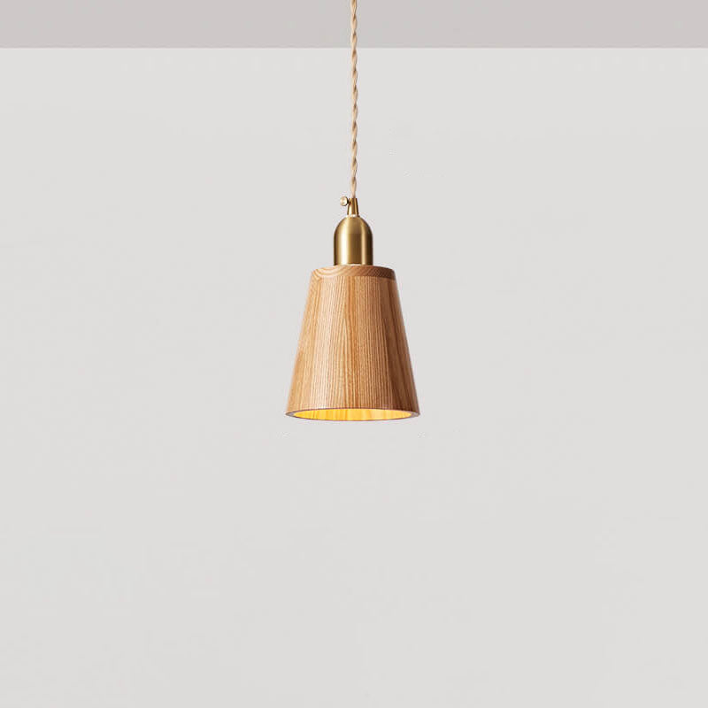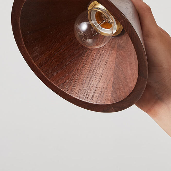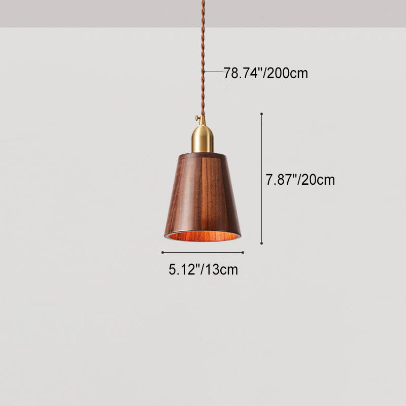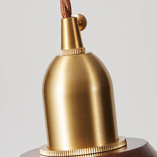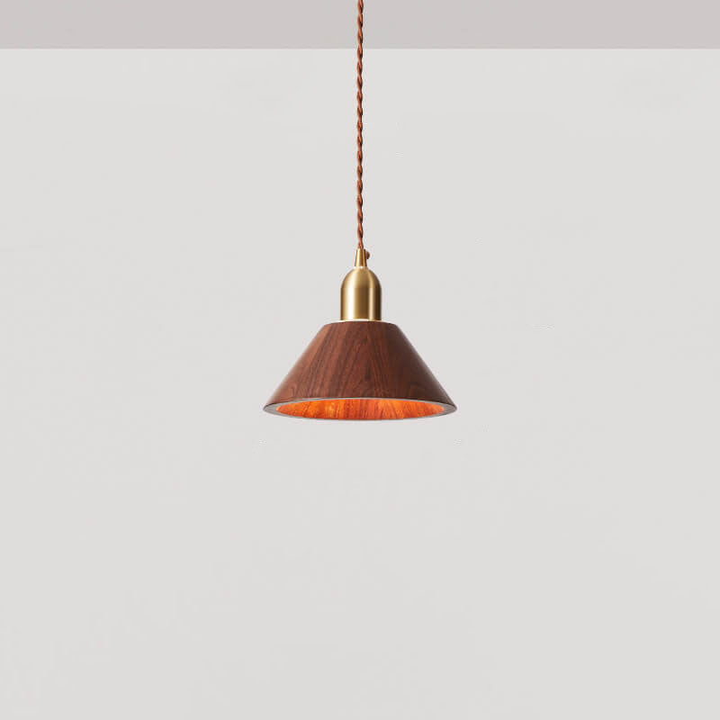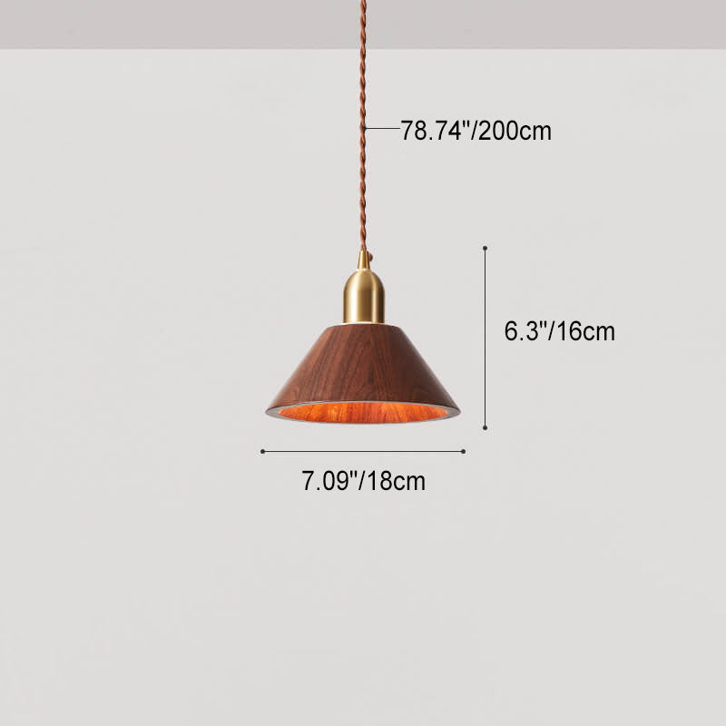 Japanese Vintage Walnut Geometric Round Cone Brass 1-Light Pendant Light