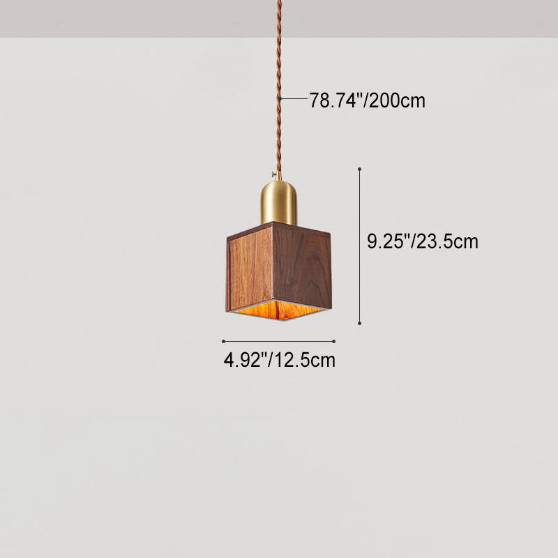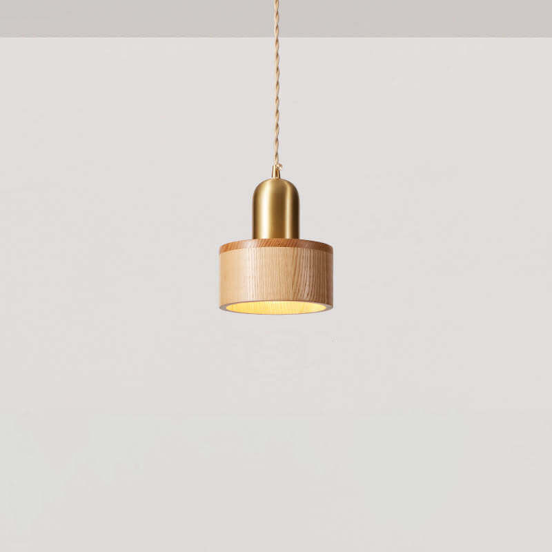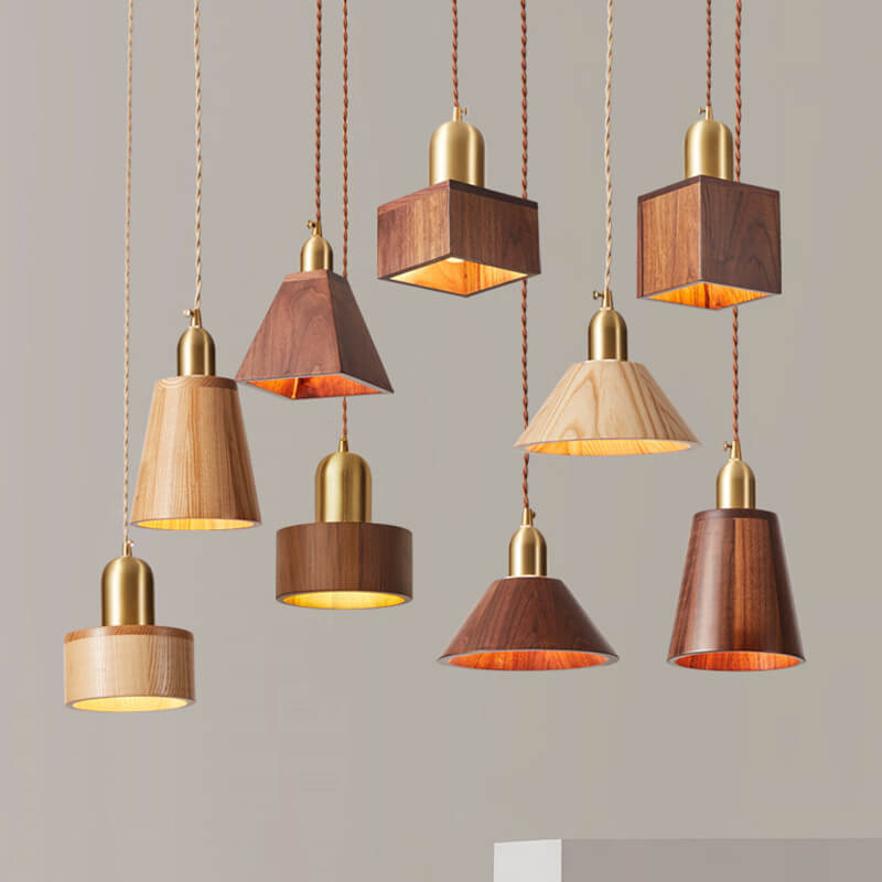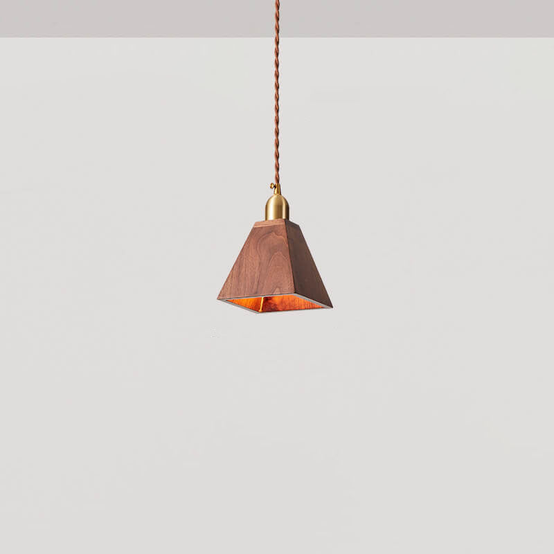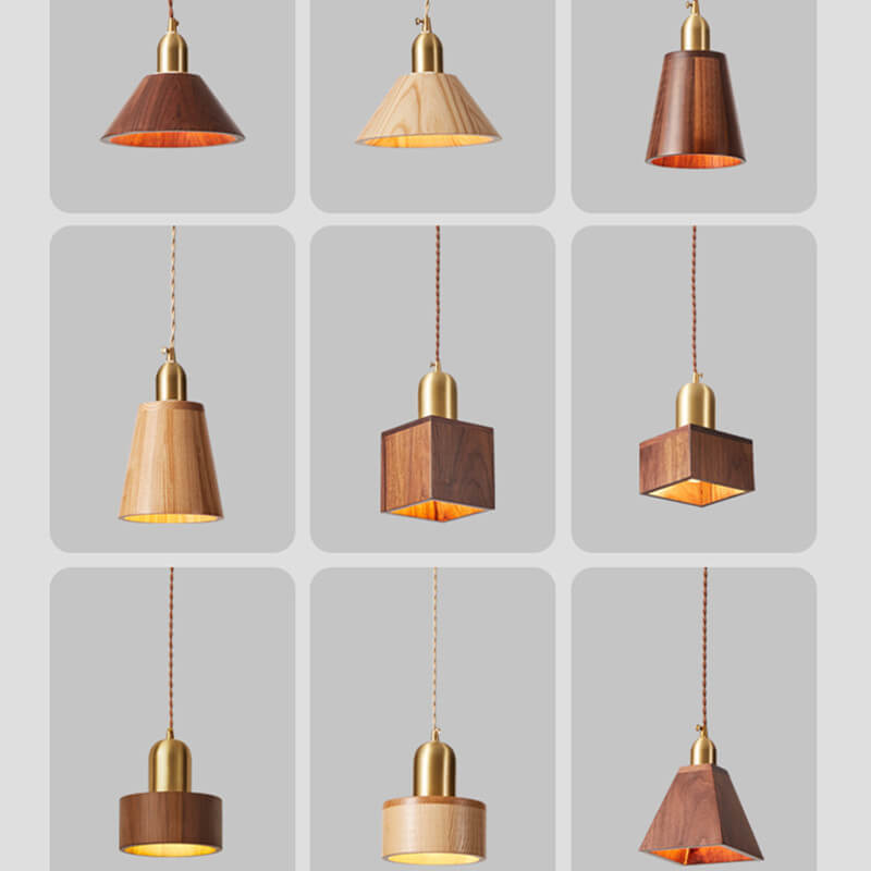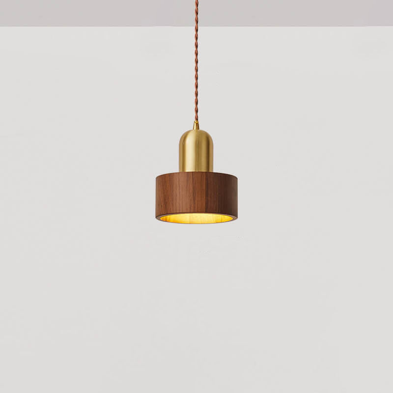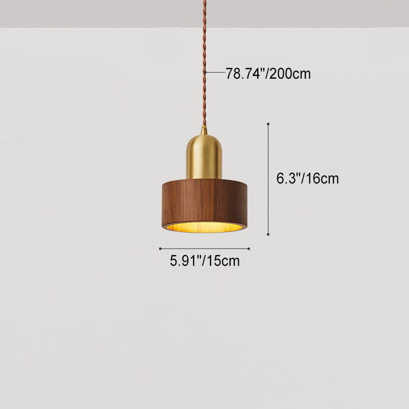 Japanese Vintage Walnut Geometric Round Cone Brass 1-Light Pendant Light