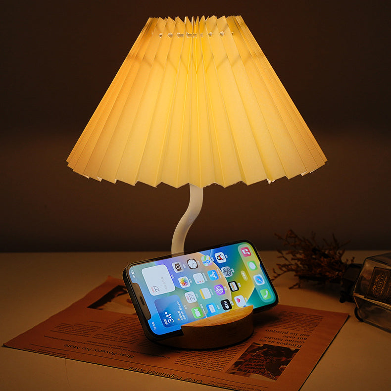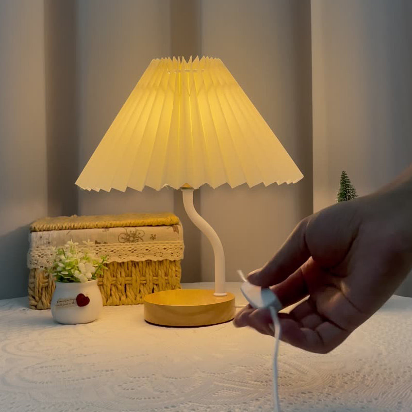 Modern Art Deco Pleated Floral Print Conical Fabric Shade Solid Wood Built-In Shelf Base LED Table Lamp Night Light For Bedroom