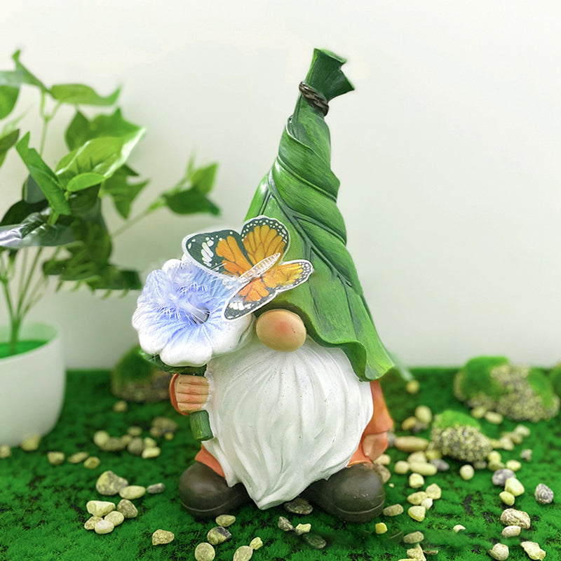 Add a playful touch to your garden with this modern decorative resin gnome statue, featuring flowers, a butterfly, and vibrant green, white, and red colors. This solar-powered, waterproof LED outdoor light automatically turns on at dusk, combining whimsical charm with functional lighting for your yard or patio.