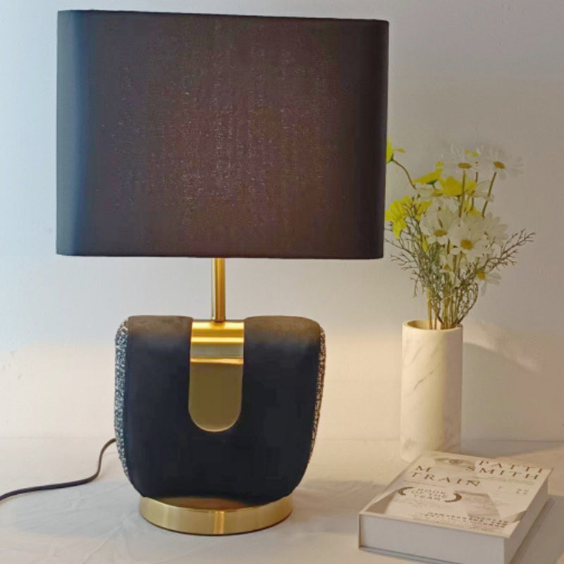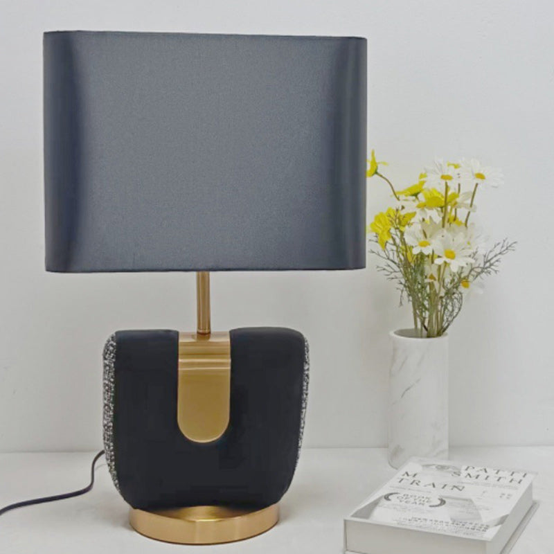 Modern Eclectic Fabric Square Shade Leather Iron 1-Light Table Lamp For Bedroom