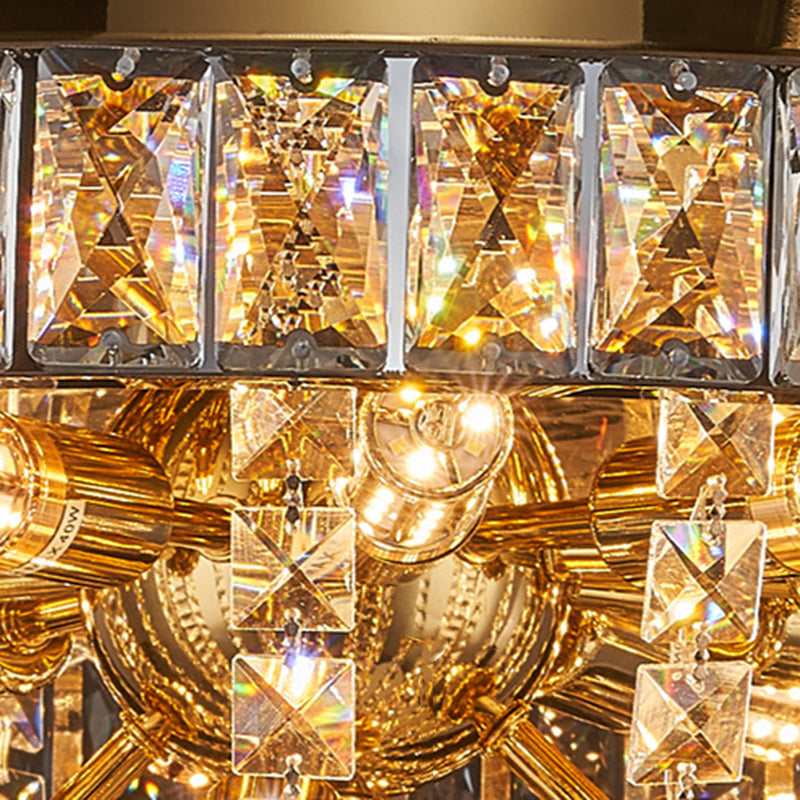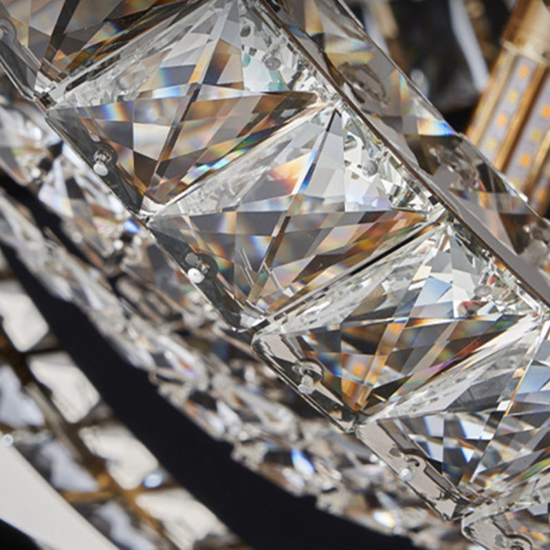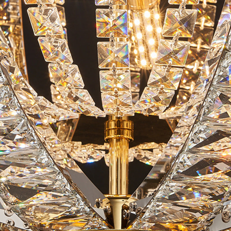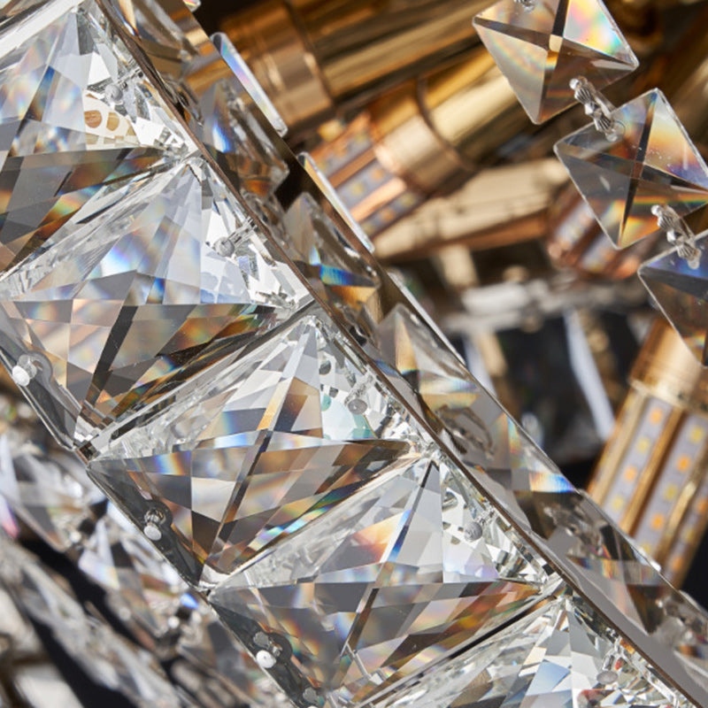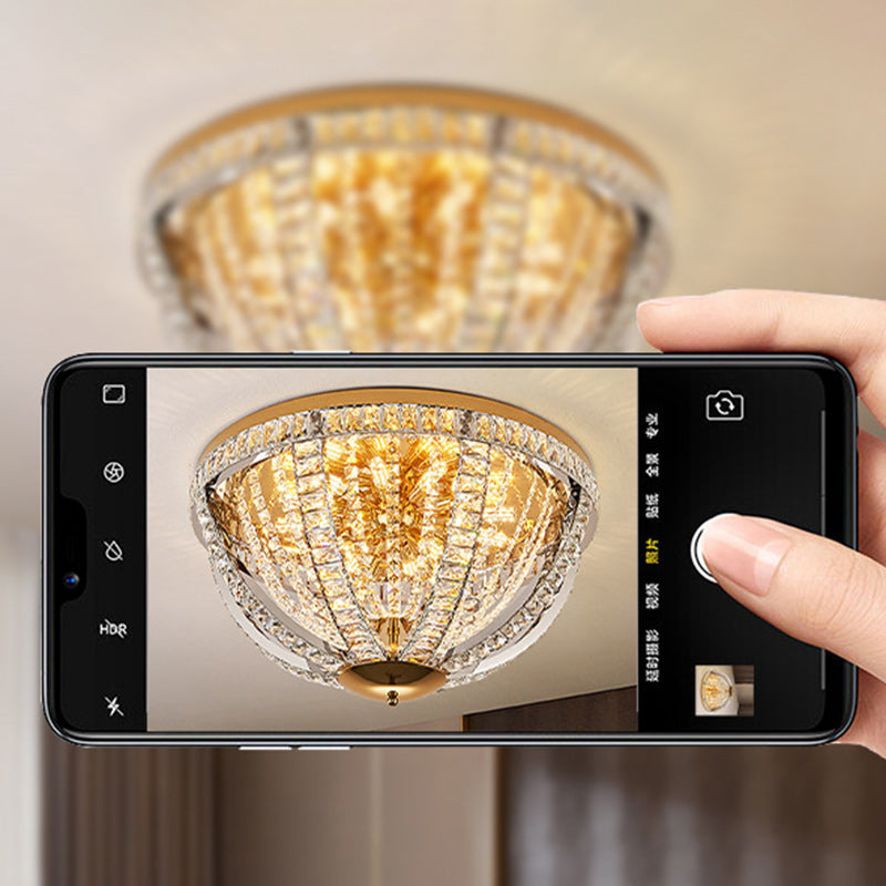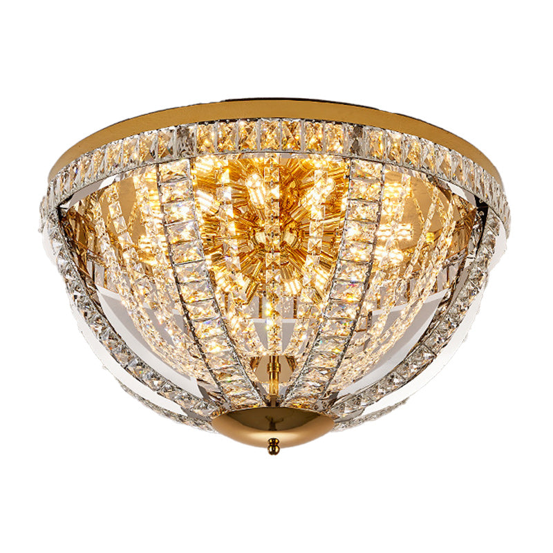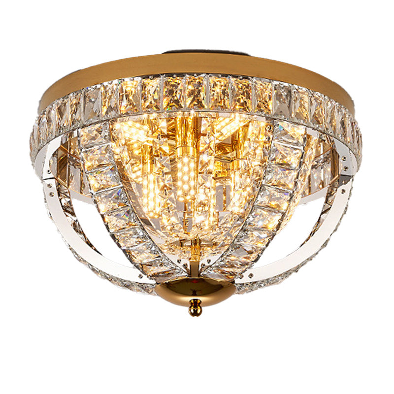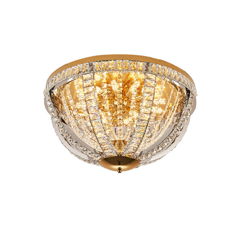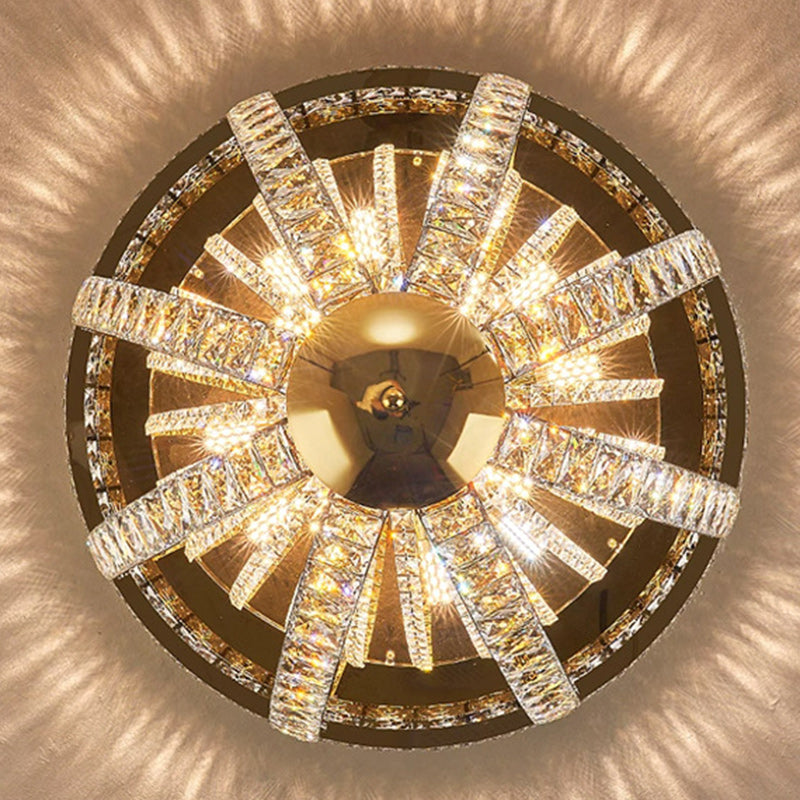 Add elegance to your space with this modern luxury semi-flush mount ceiling light, featuring a round stainless steel frame and dazzling K9 crystal accents. The 8/9/16-light design creates stunning light refraction through diamond-cut crystals, casting brilliant patterns across your living room or bedroom. Finished in glamorous gold, this ceiling fixture blends premium materials with striking visual impact—perfect for upscale interiors.