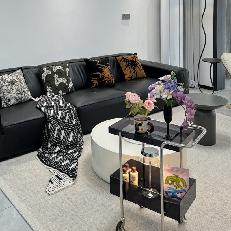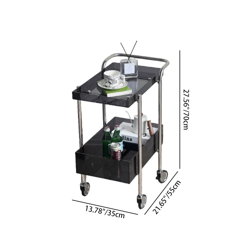 This modern 2-tier acrylic and metal side table features a sleek rectangular design and smooth-rolling wheels for easy mobility. Available in elegant gray and amber tones, it’s perfect for compact spaces needing stylish storage or a functional accent piece.