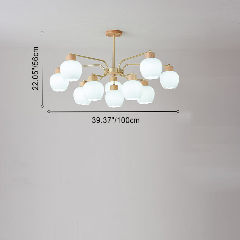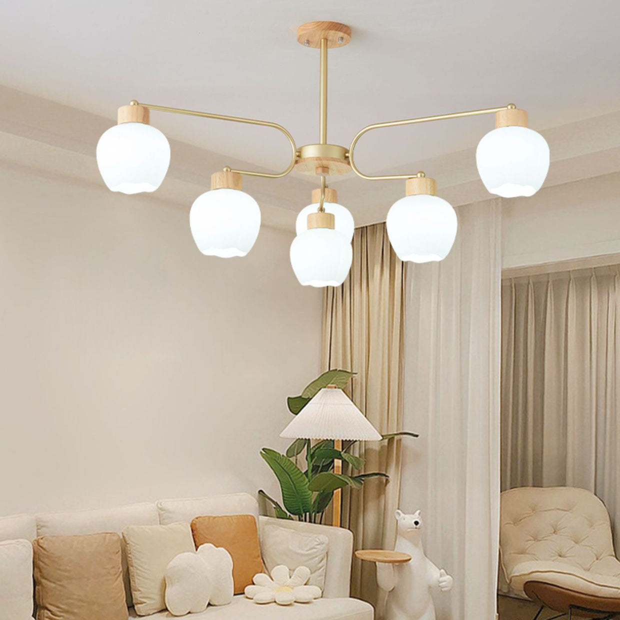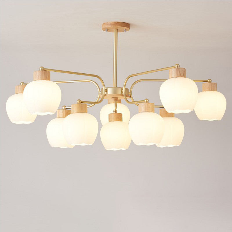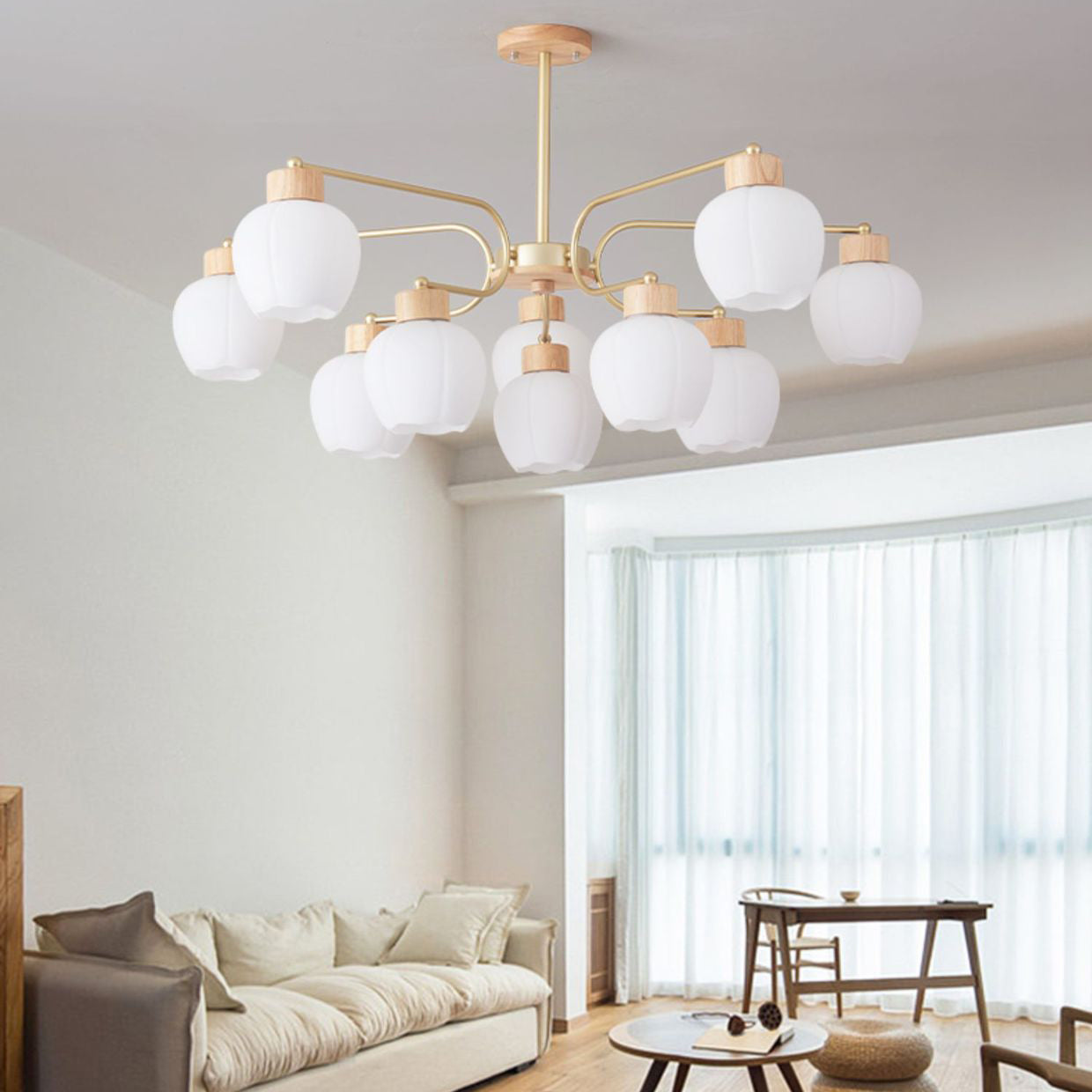 Modern Minimalist Curved Pole White Bellflower Hardware Wood Glass 6/10 Light Chandelier For Living Room