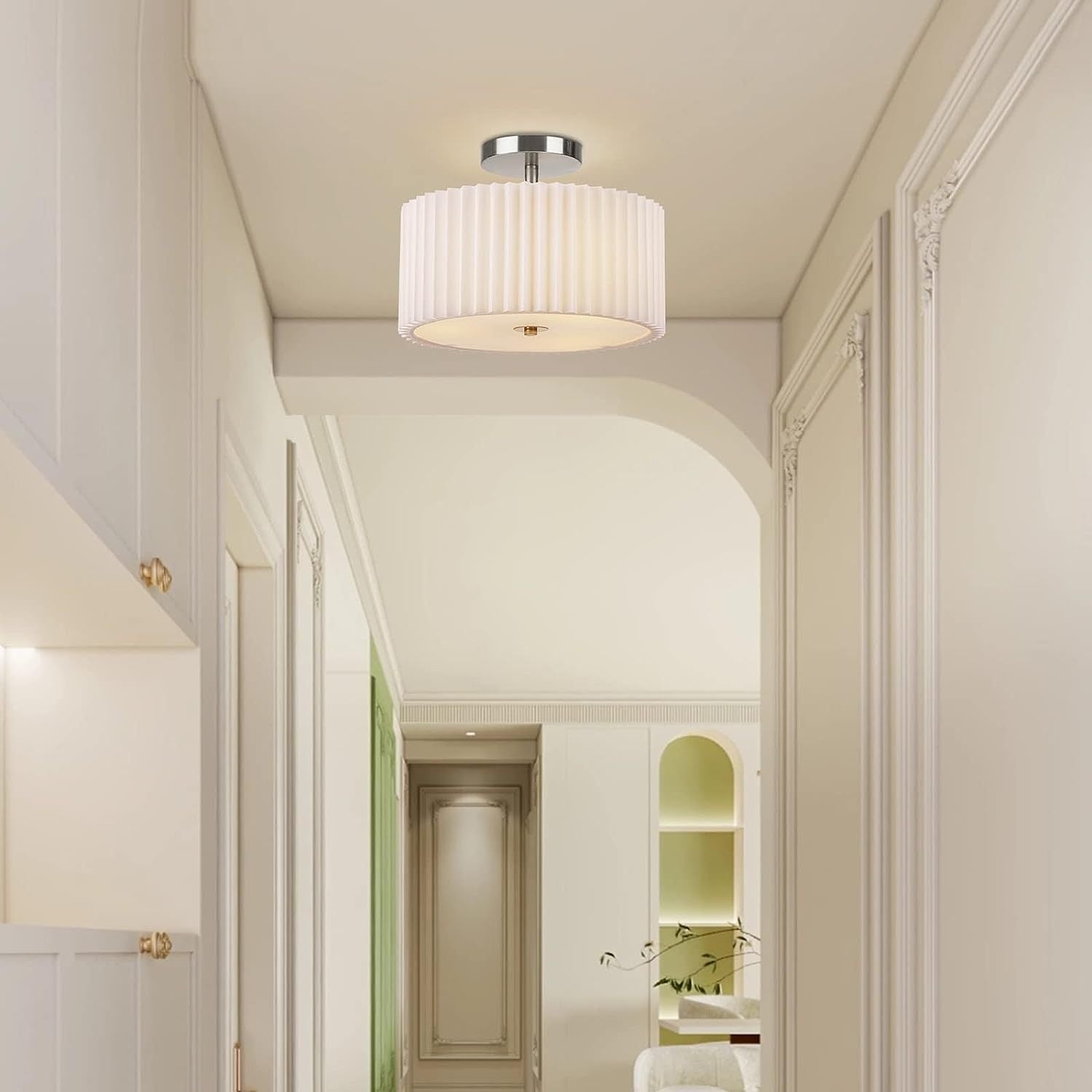 Modern Minimalist Pleated Round Cylinder Metal Fabric Acrylic 3-Light Semi-Flush Mount Ceiling Light For Bedroom