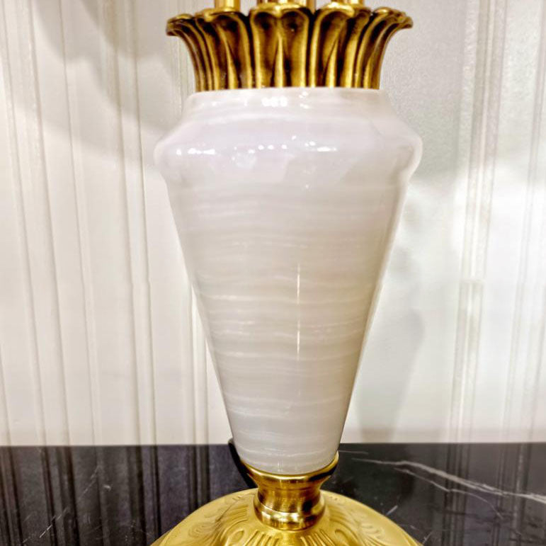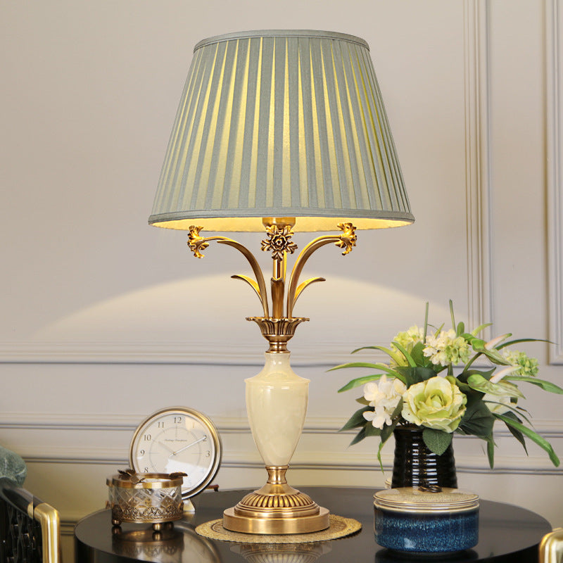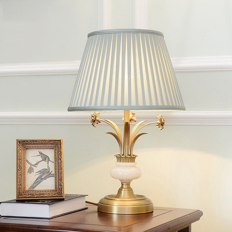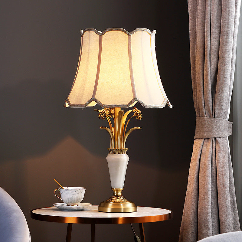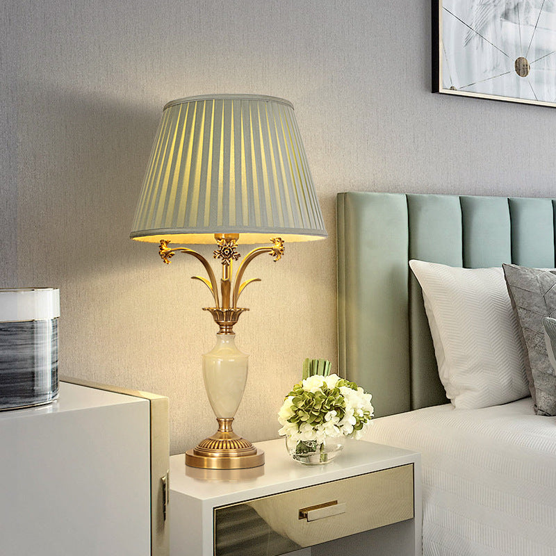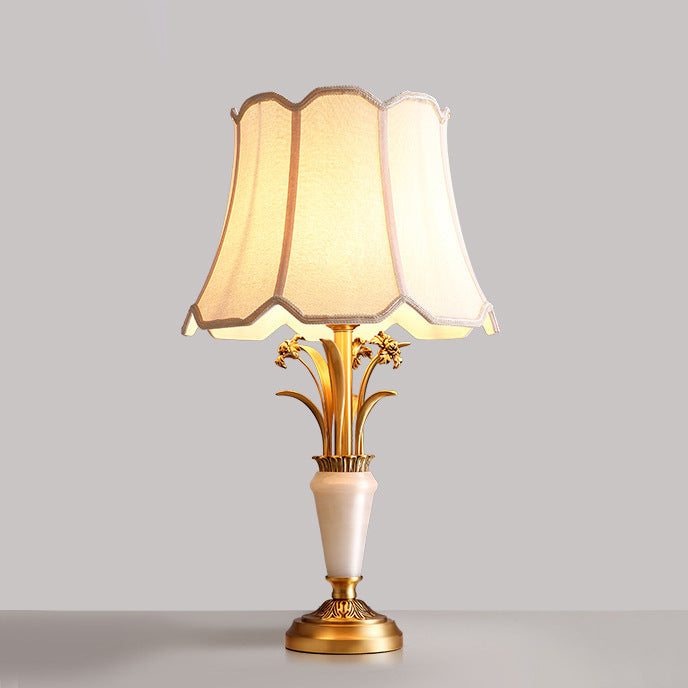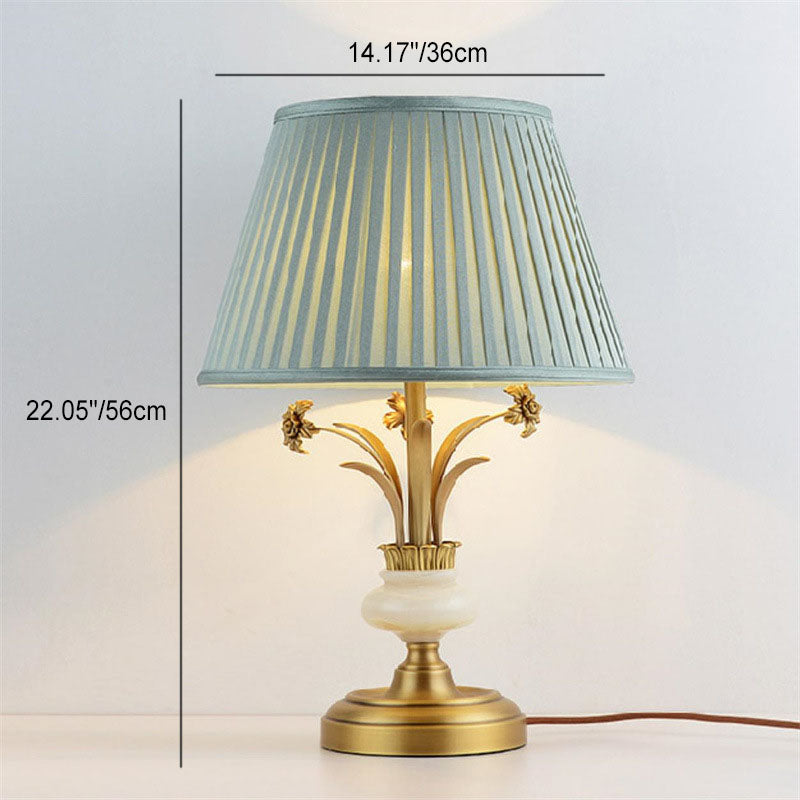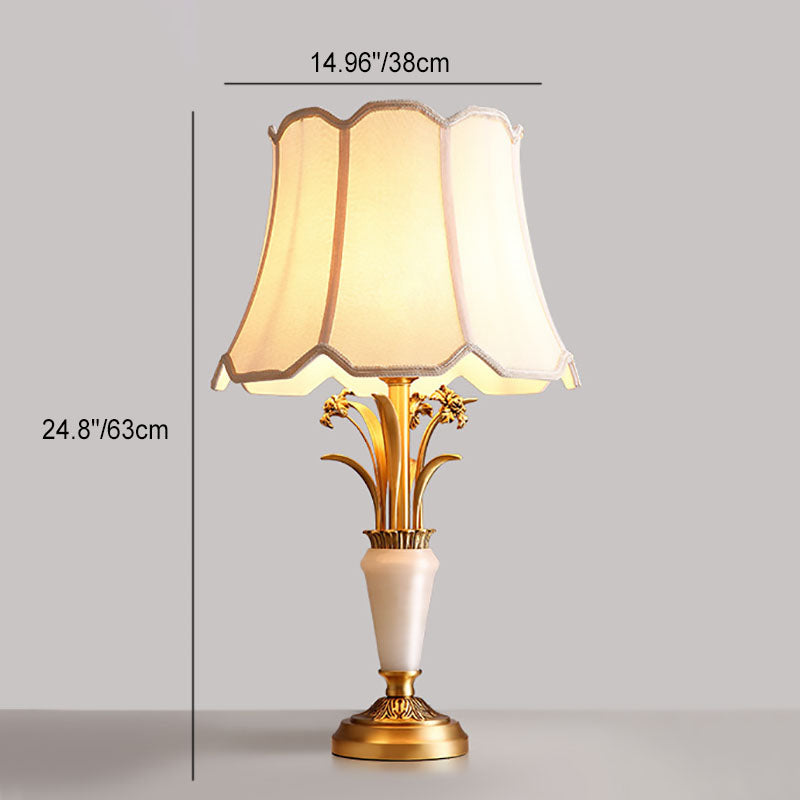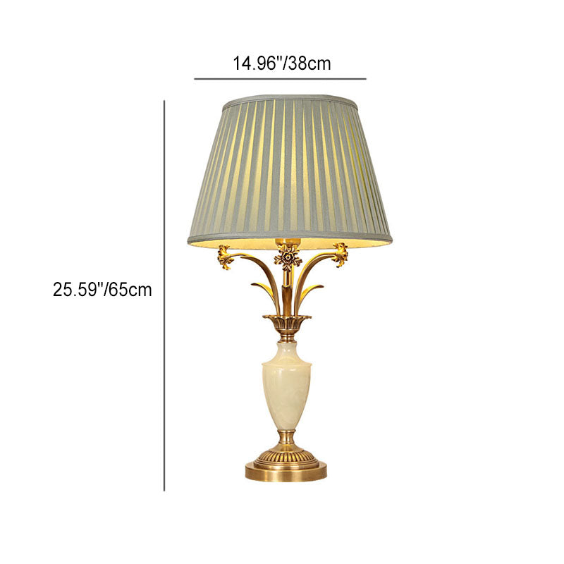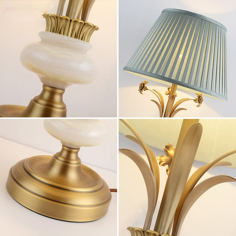 Modern Minimalist Round Trapezoidal Flower Leaf Base Brass Jade Fabric 1-Light Table Lamp For Bedroom