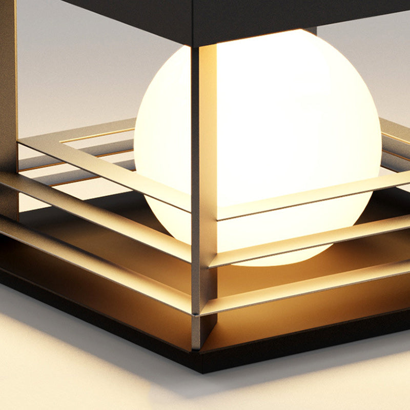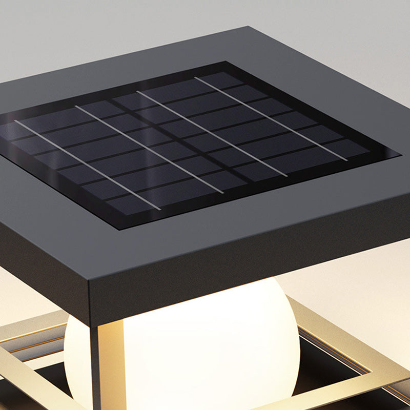 This black solar-powered LED post light combines a cuboid base with a globe top, crafted from durable PC and stainless steel. Ideal for patios and garden pillars, it features waterproof protection and energy-saving solar functionality for long-lasting outdoor illumination.