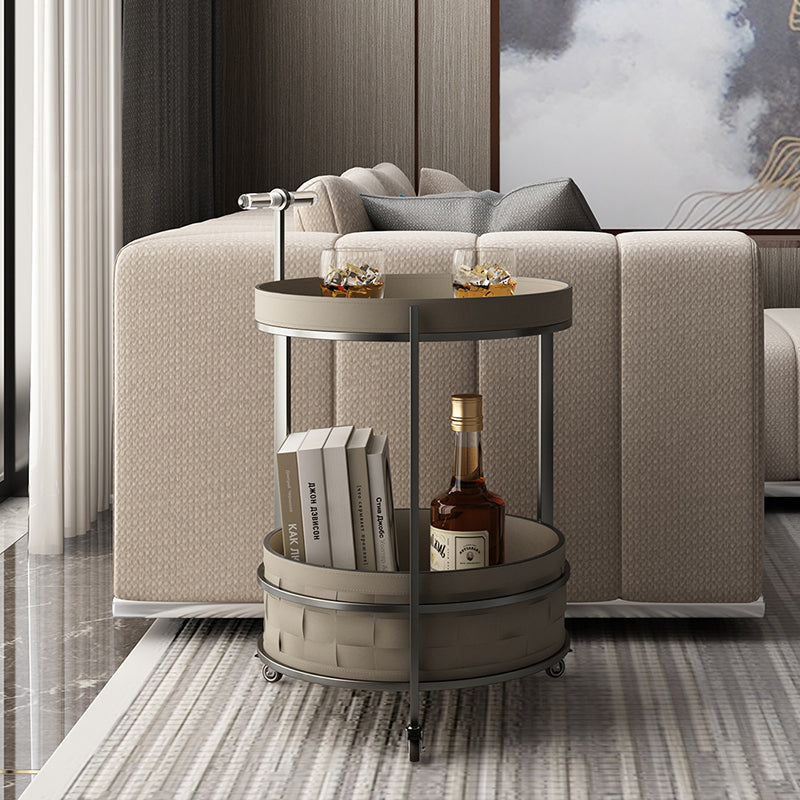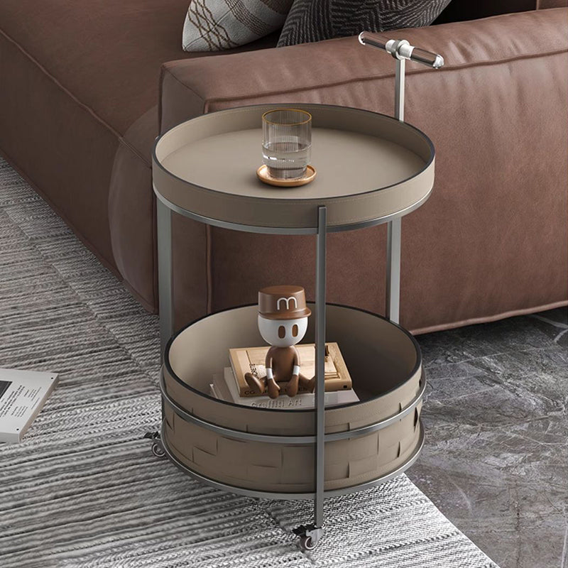 Blending mobility with refined materials, this rolling side table elevates everyday storage with its smart, dual-tier circular design. The upper shallow tray is ideal for daily essentials or decorative displays, while the lower compartment offers deeper storage wrapped in saddle leather with elegant basket-weave detailing.