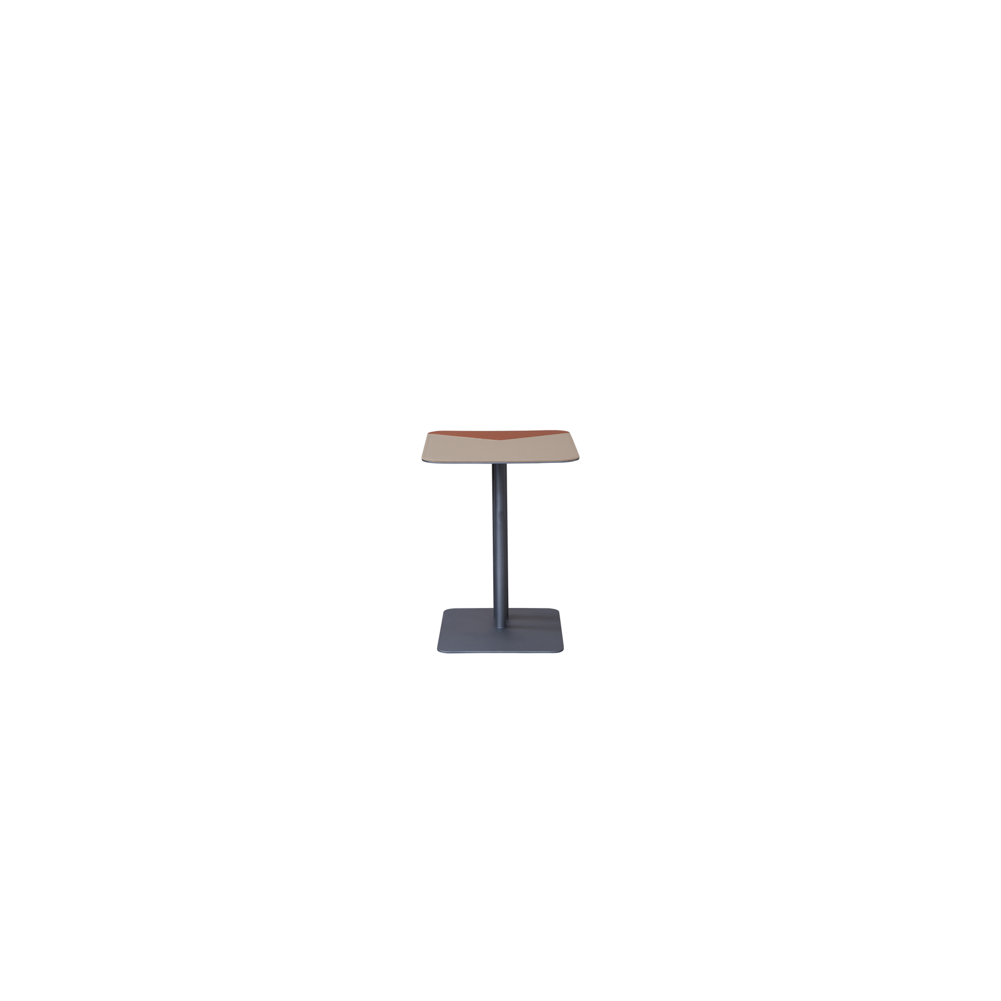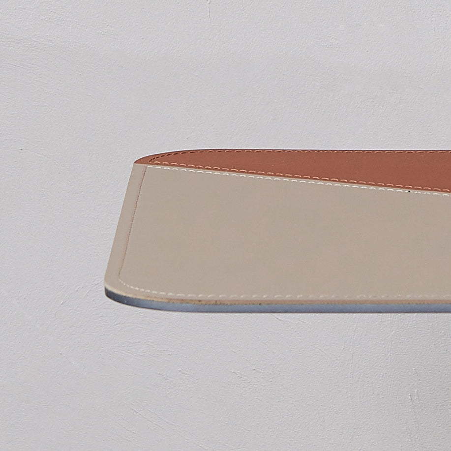 This sleek side table balances function and form with a minimalist square top softened by rounded corners. Wrapped in premium saddle leather, the tabletop combines a soft beige tone with a bold orange-brown patch in an asymmetrical arrow-like shape. The clean visual contrast and fine stitching enhance the handcrafted appeal while adding a geometric pop to any room.