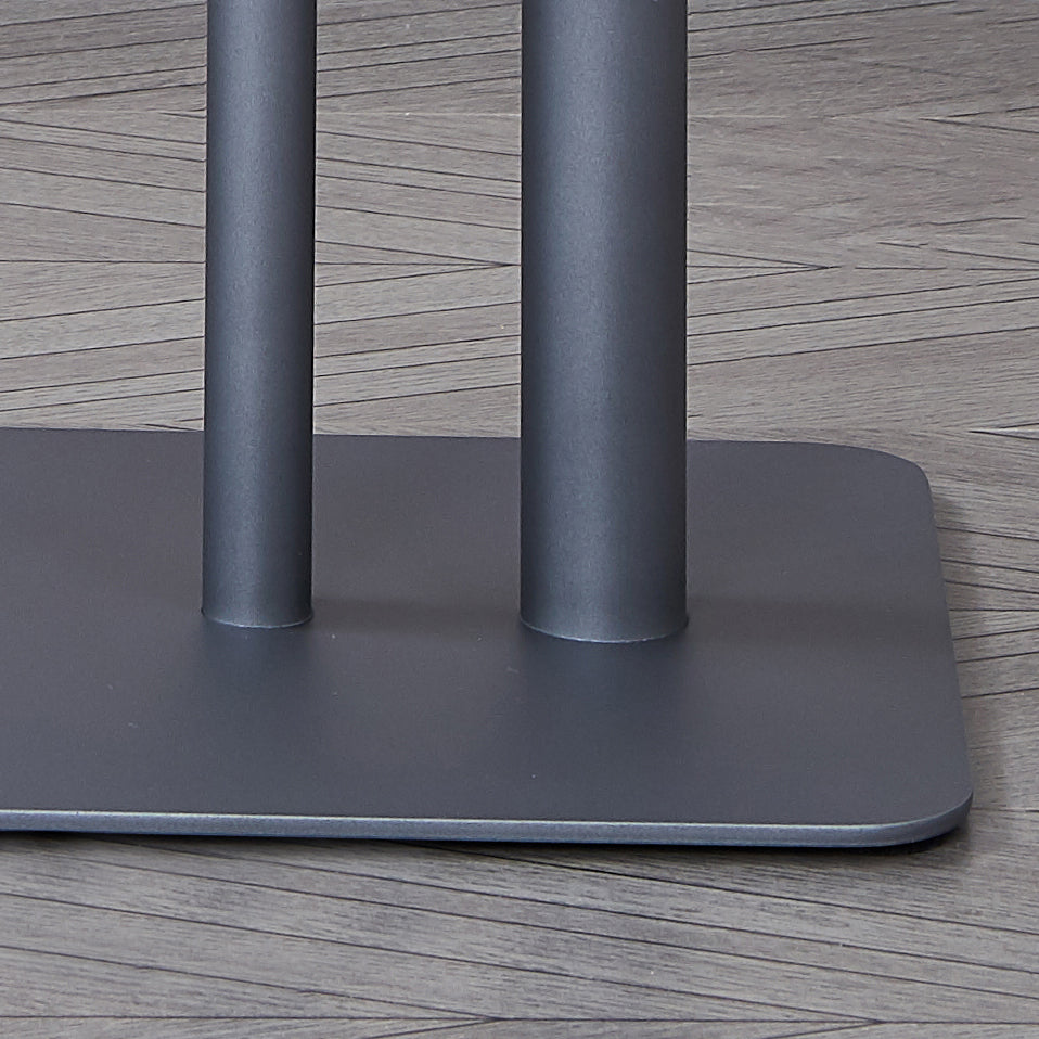 Supporting the tabletop is a sturdy twin-column structure in matte charcoal gray, linked by a horizontal bar for added stability. The matching metal base features a low-profile rectangular design that grounds the table with a balanced, low center of gravity—perfect for use next to a sofa, armchair, or bed.