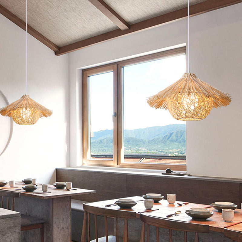 Add warm, artisanal charm to your restaurant or tea room with this traditional Chinese 1-Light bamboo pendant. Featuring a cone-shaped, hat-style silhouette in a natural wood finish, it offers adjustable hanging length and handcrafted bamboo detailing—perfect for cozy, cultural dining spaces.