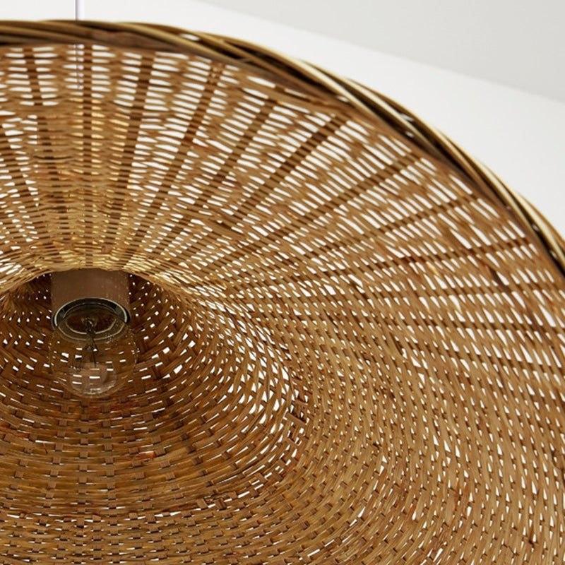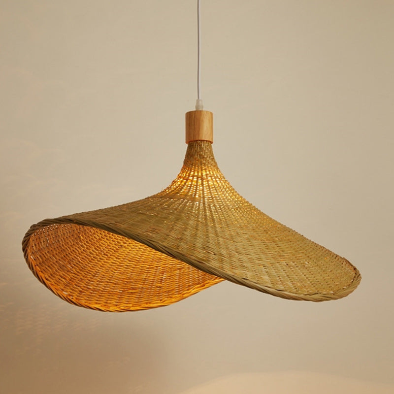 This handcrafted bamboo pendant light features a unique straw hat design, bringing a touch of traditional Chinese and Southeast Asian charm to any space. Made from natural bamboo with an adjustable hanging cord, it offers warm, moisture-resistant lighting, perfect for bedrooms, tea rooms, and living areas.