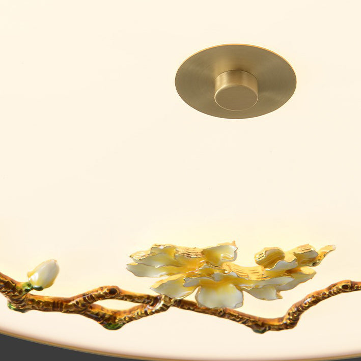 Traditional Chinese Brass Ceramic Plum Blossom Drum Shape Acrylic LED Flush Mount Ceiling Light For Living Room