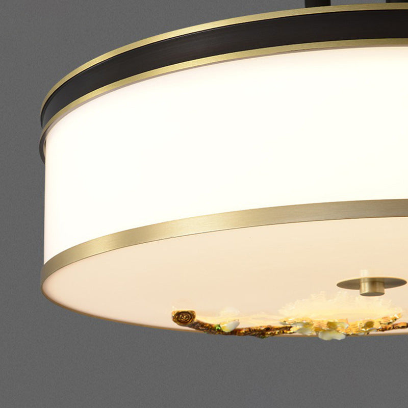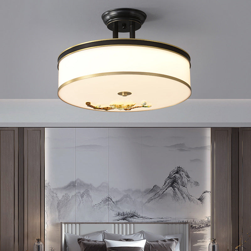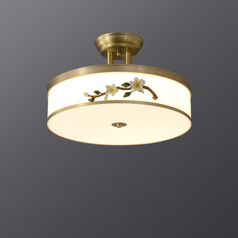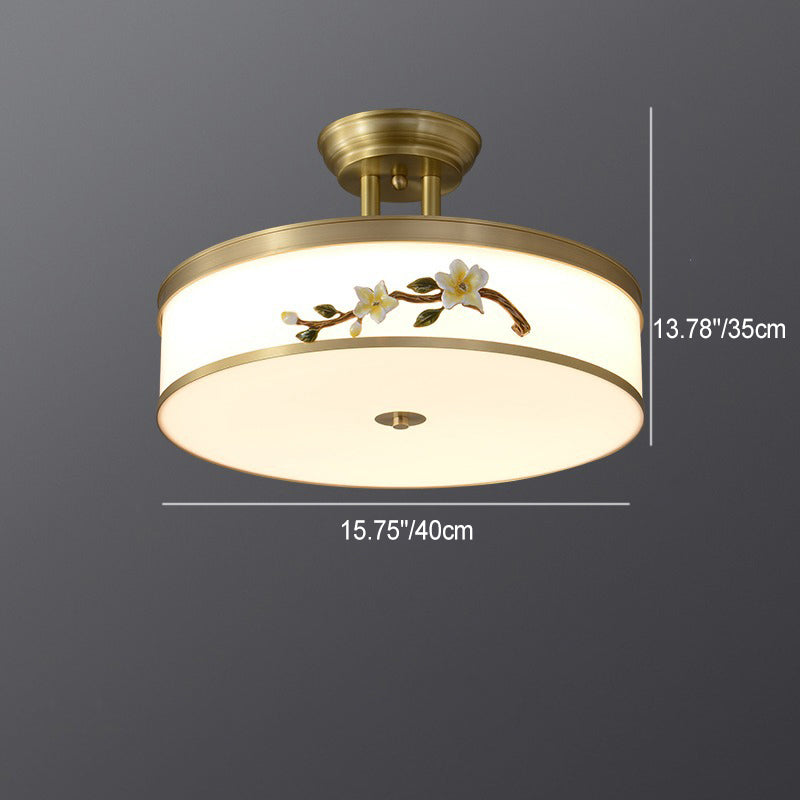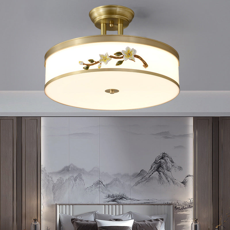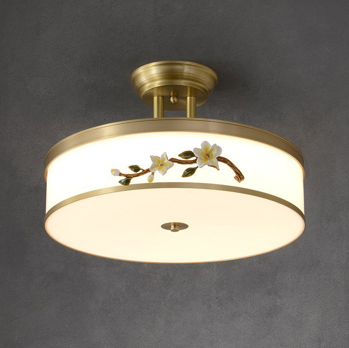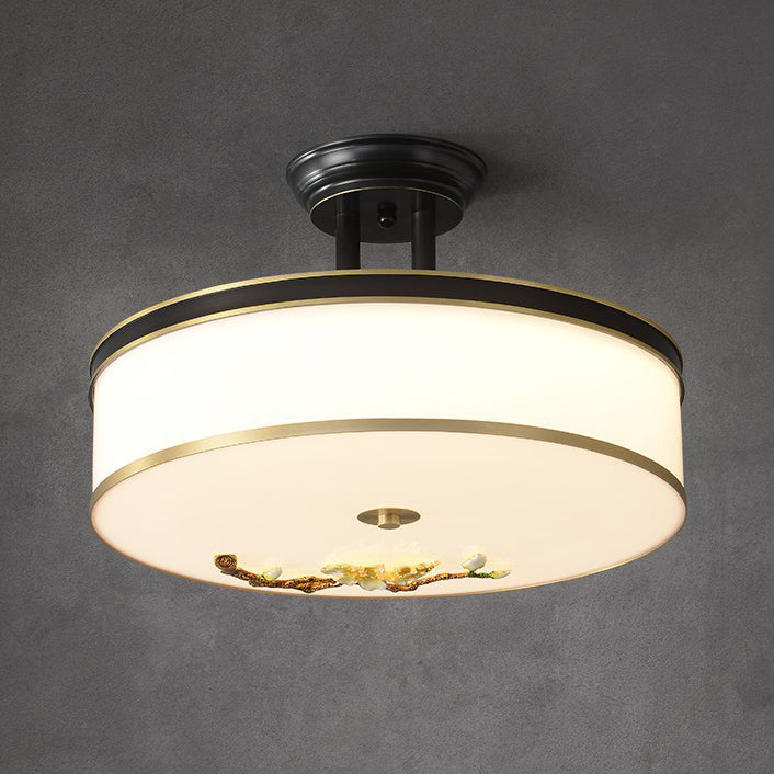 Traditional Chinese Brass Ceramic Plum Blossom Drum Shape Acrylic LED Semi-Flush Mount Ceiling Light For Bedroom