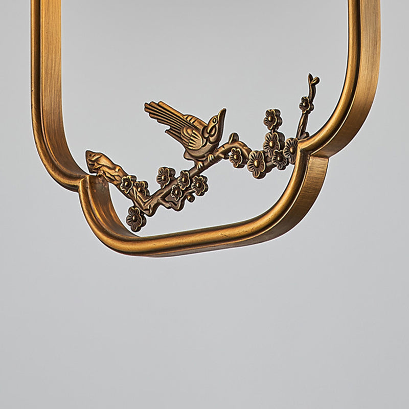Traditional Chinese Brass Glass Alabaster Cylindrical Bird 1-Light Pendant Light For Living Room