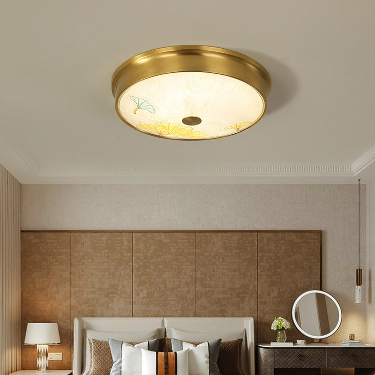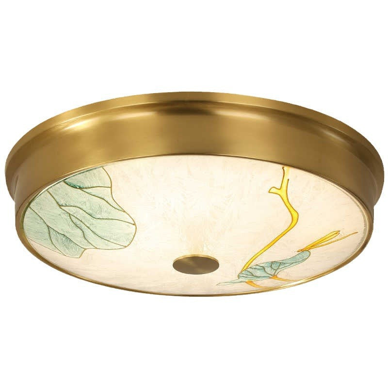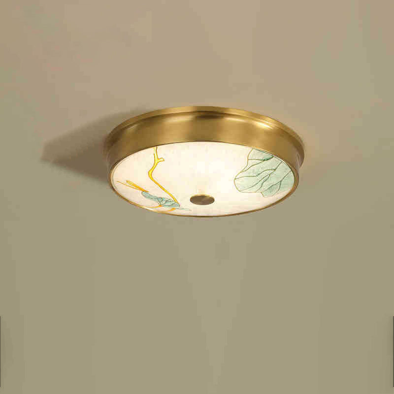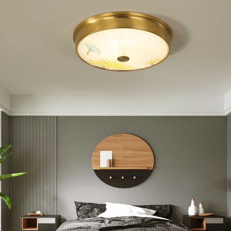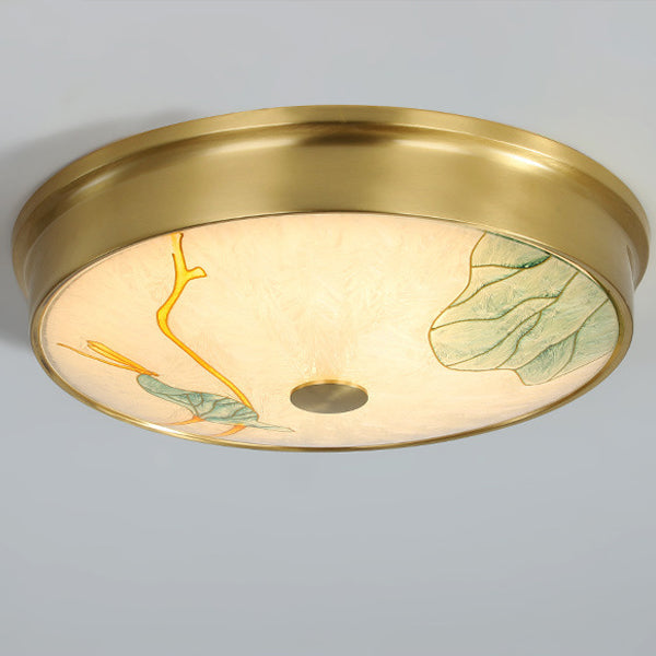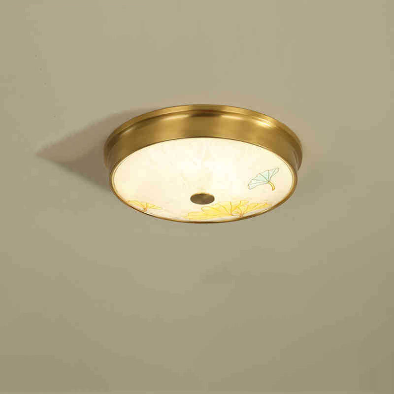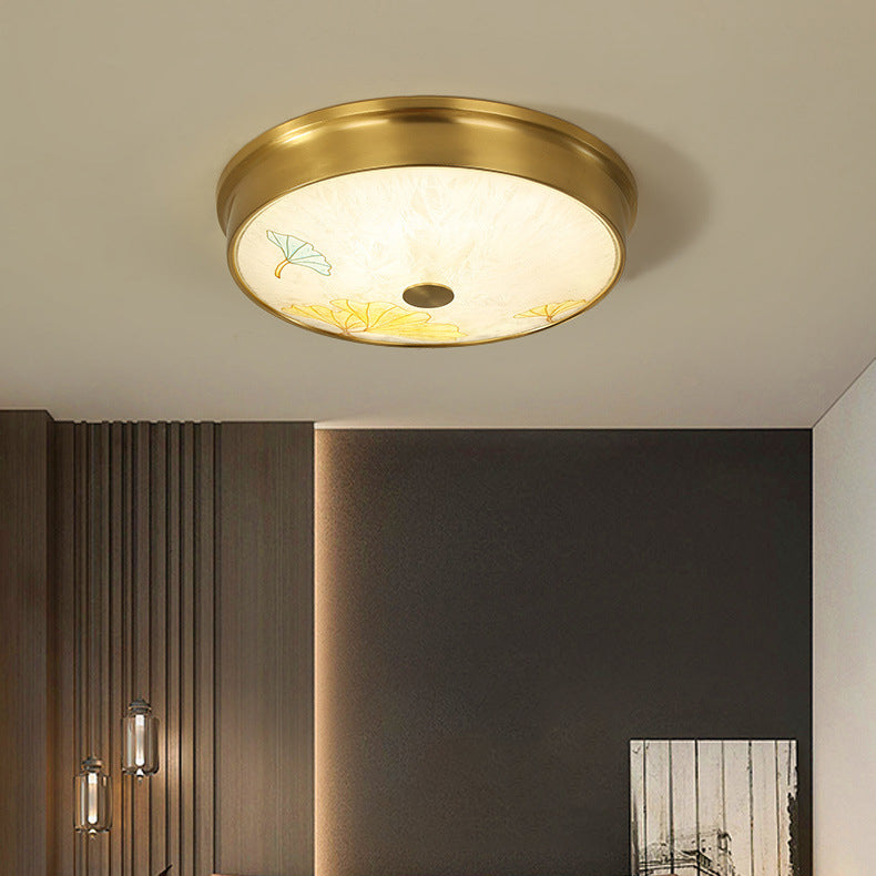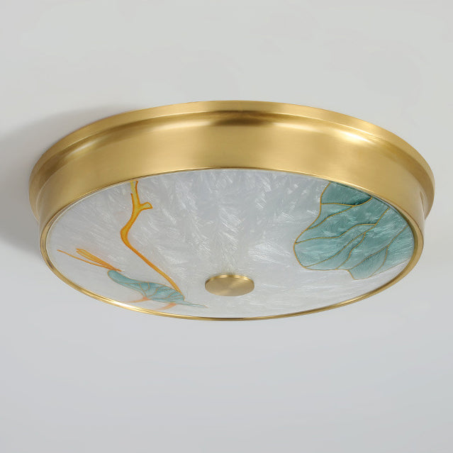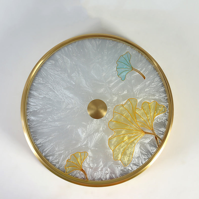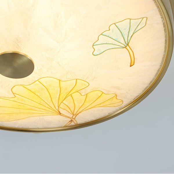 Traditional Chinese Brass Iron Glass Round Lotus Bamboo Leaf Ginkgo Biloba Painting Crackle LED Flush Mount Ceiling Light For Bedroom