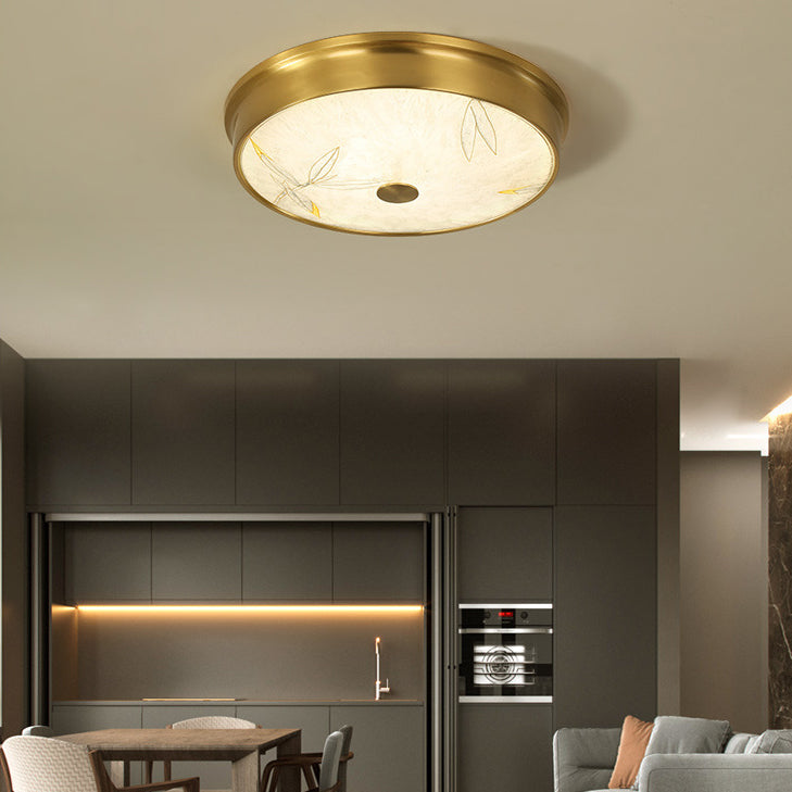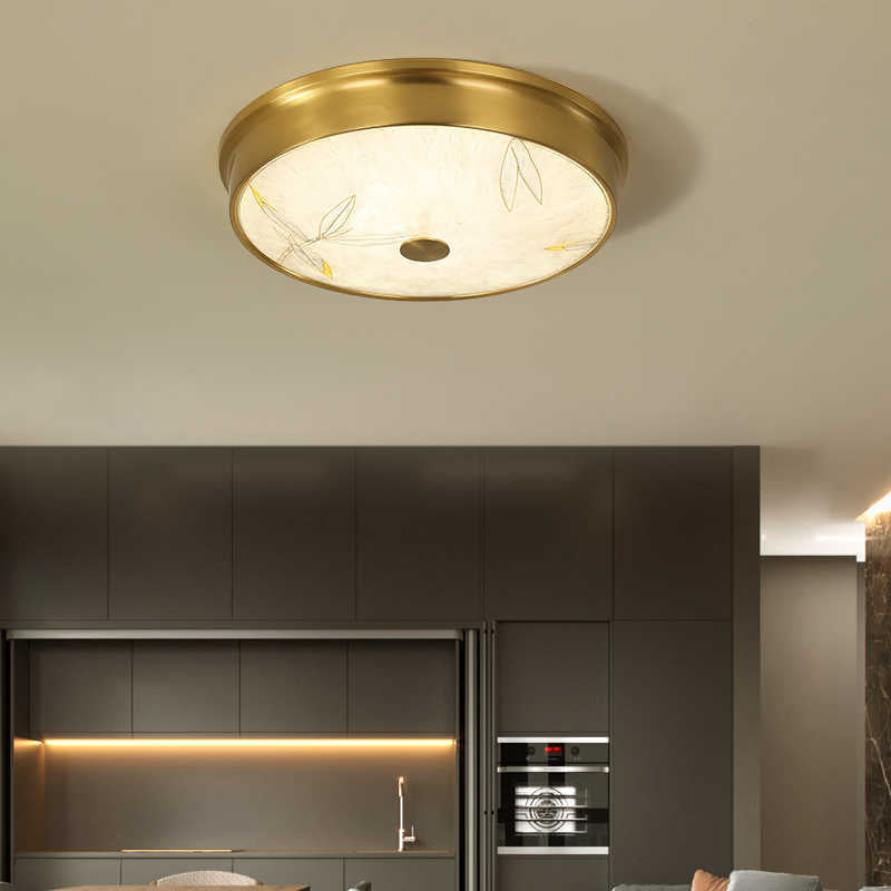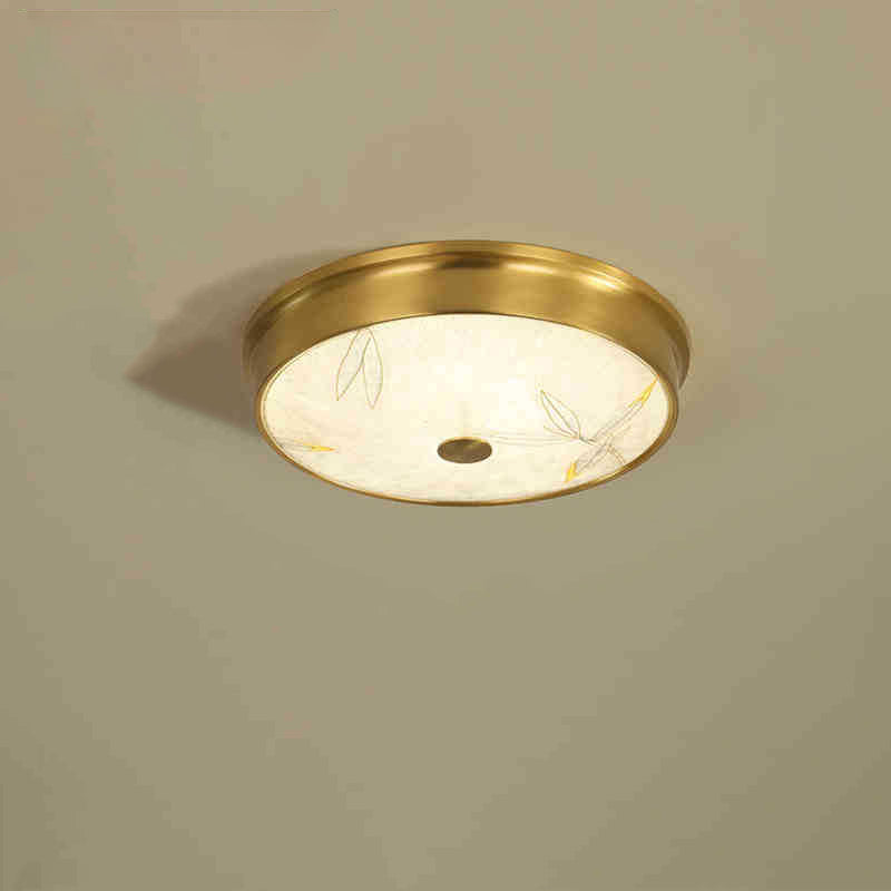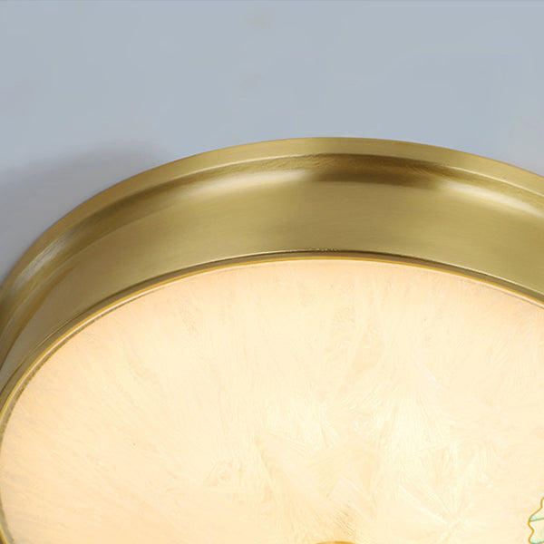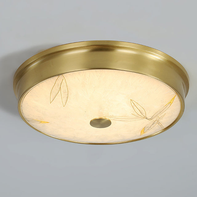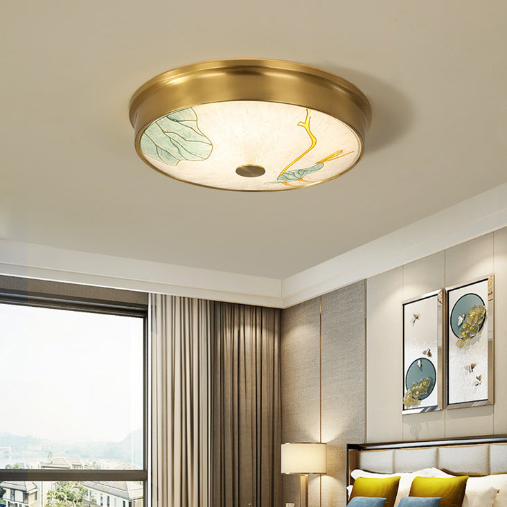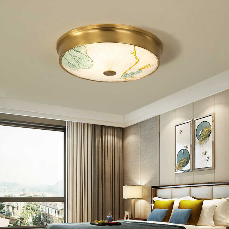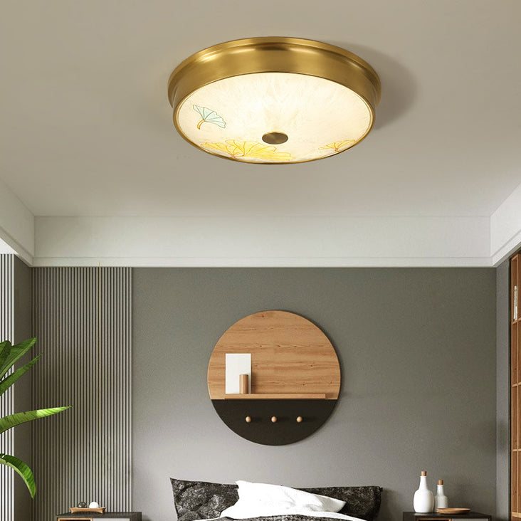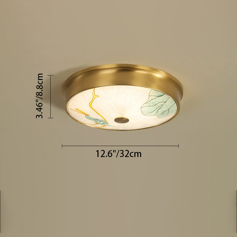 Traditional Chinese Brass Iron Glass Round Lotus Bamboo Leaf Ginkgo Biloba Painting Crackle LED Flush Mount Ceiling Light For Bedroom