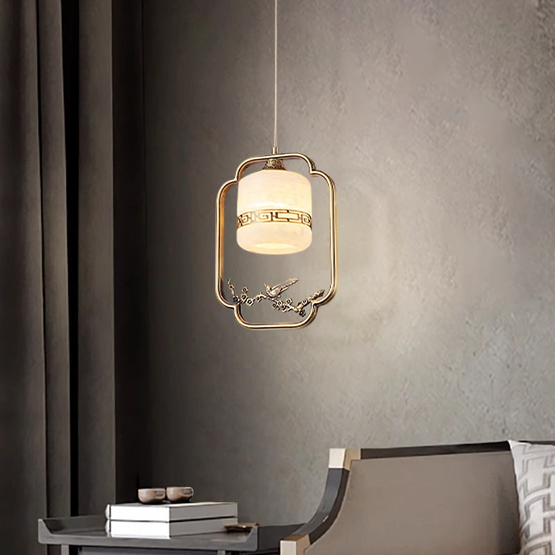 Traditional Chinese Brass Jade Marble Round Cylinder Carved Bird Flower 1-Light Pendant Light For Bedside
