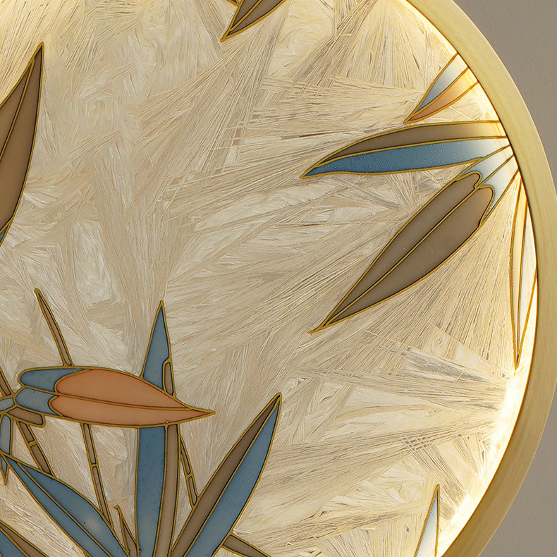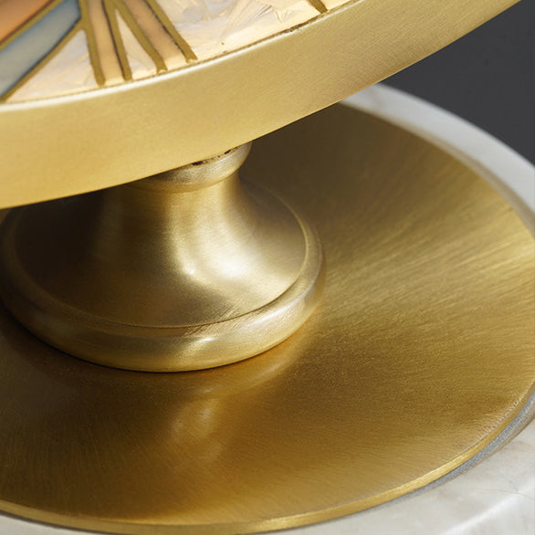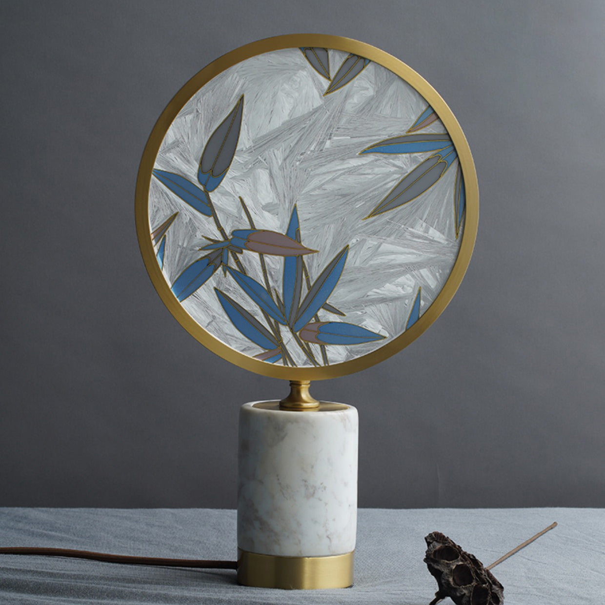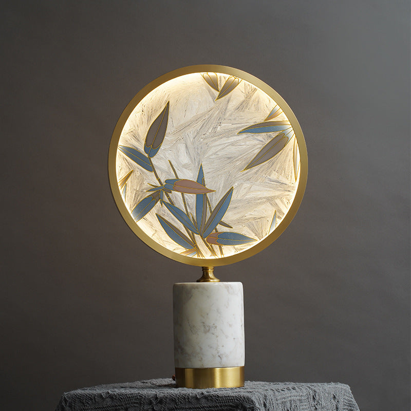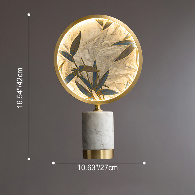 Traditional Chinese Brass Marble Glass Glaze Round Handmade Painted Bamboo Leaves LED Table Lamp For Bedside
