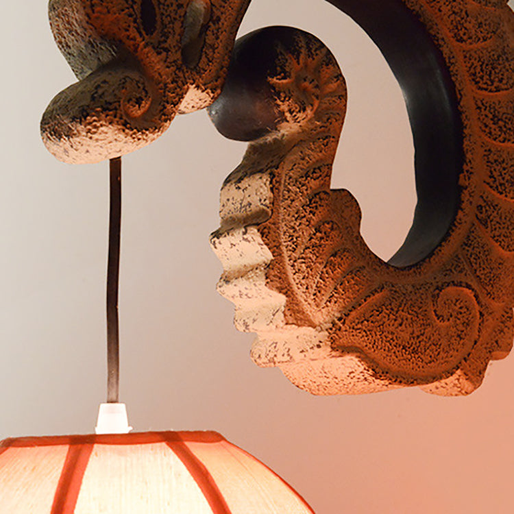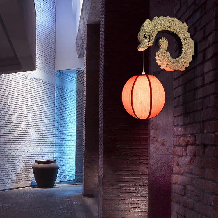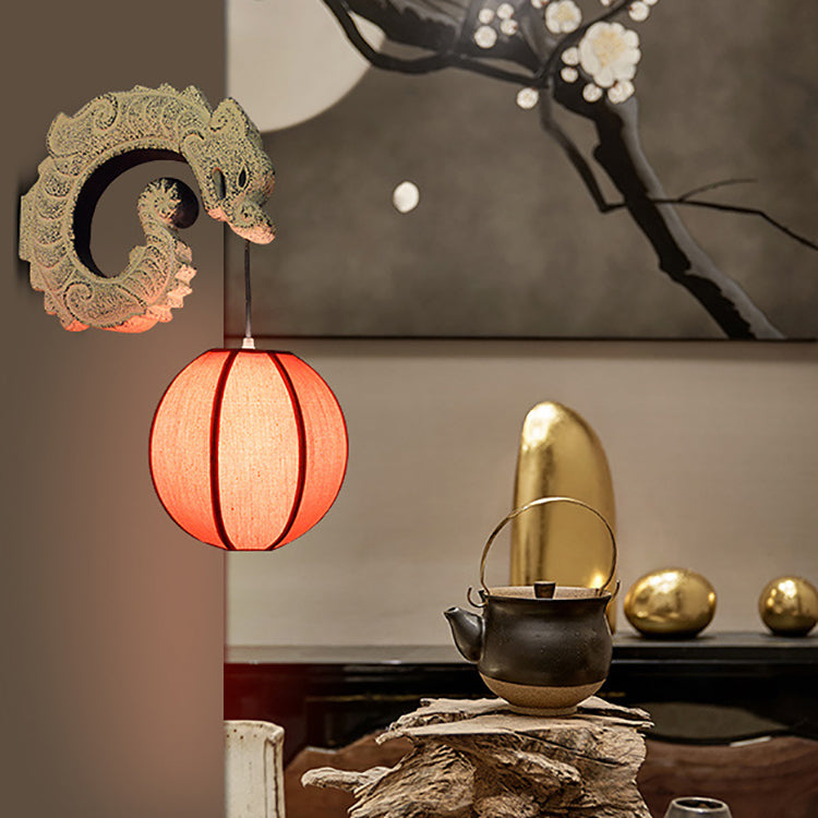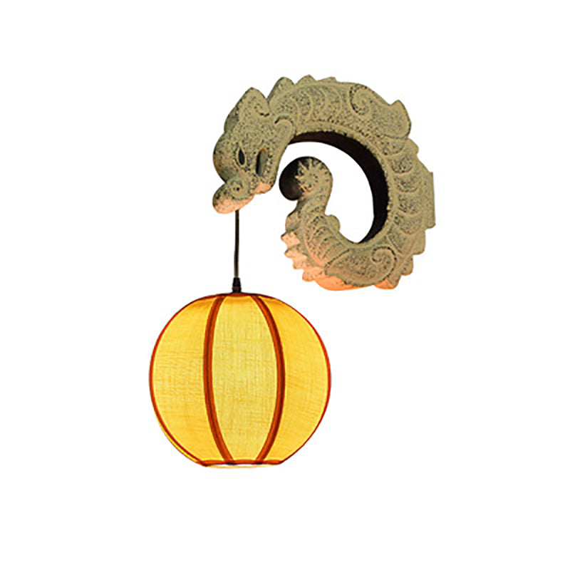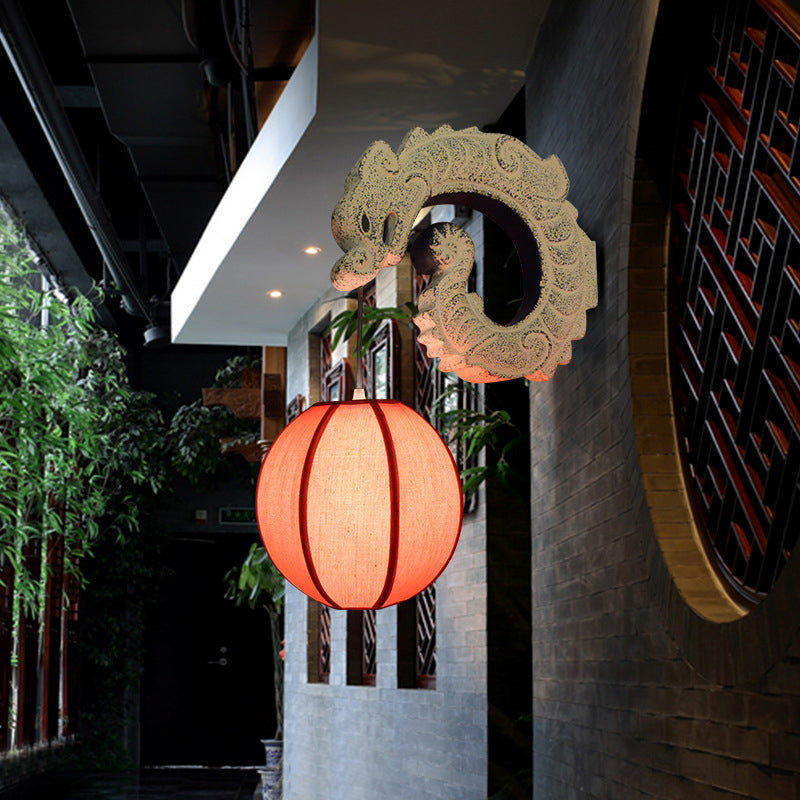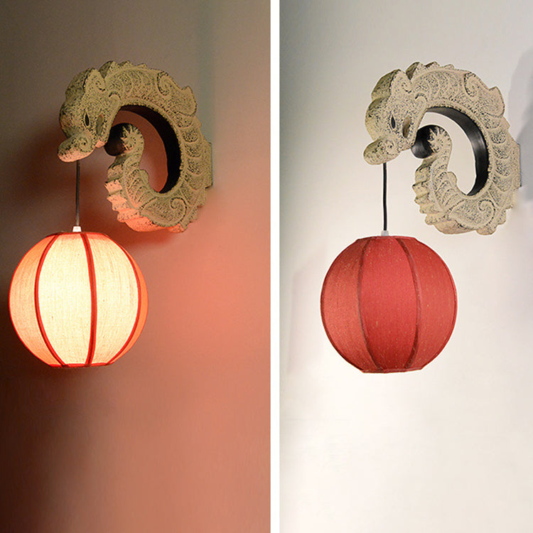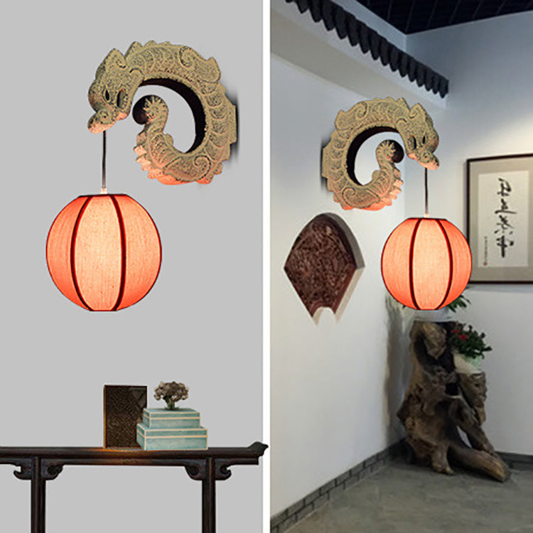 Traditional Chinese Classical Fabric Lantern Shade Resin Carved Flying Dragon Design 1-Light Wall Sconce Lamp For Living Room