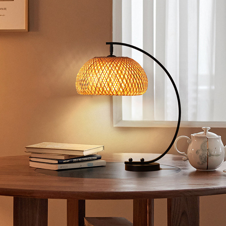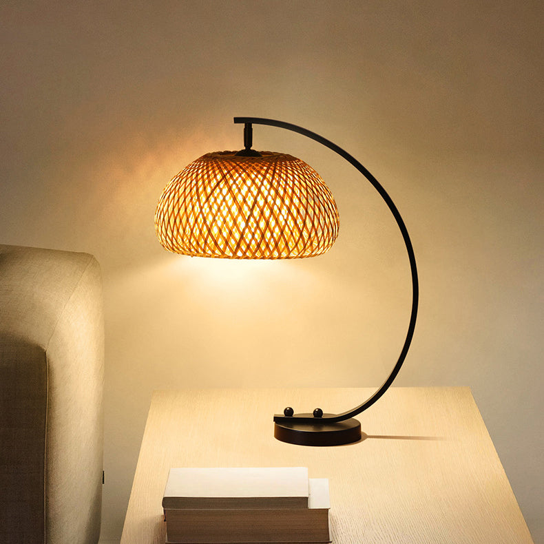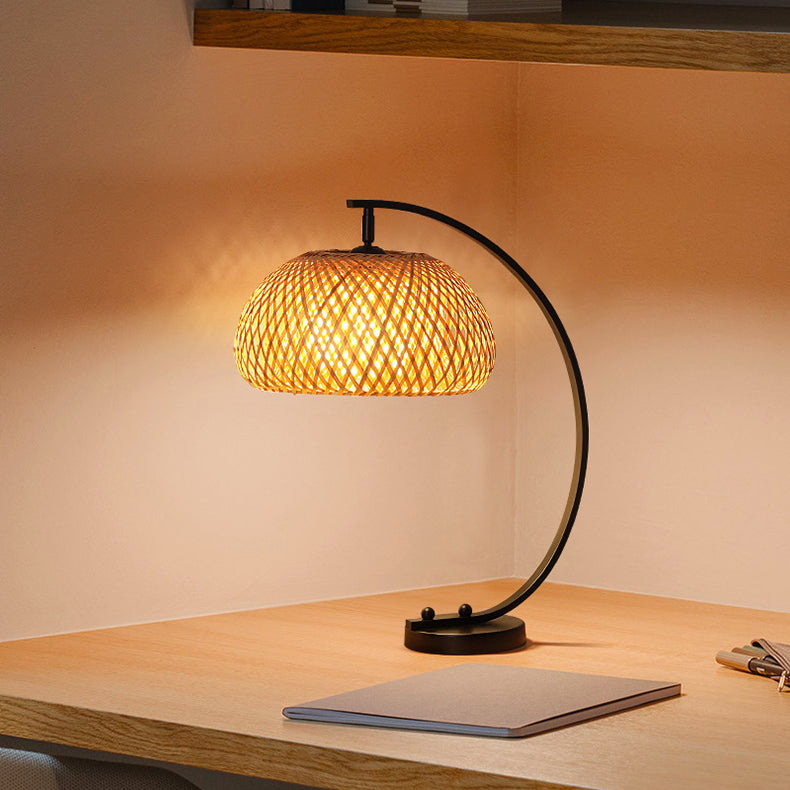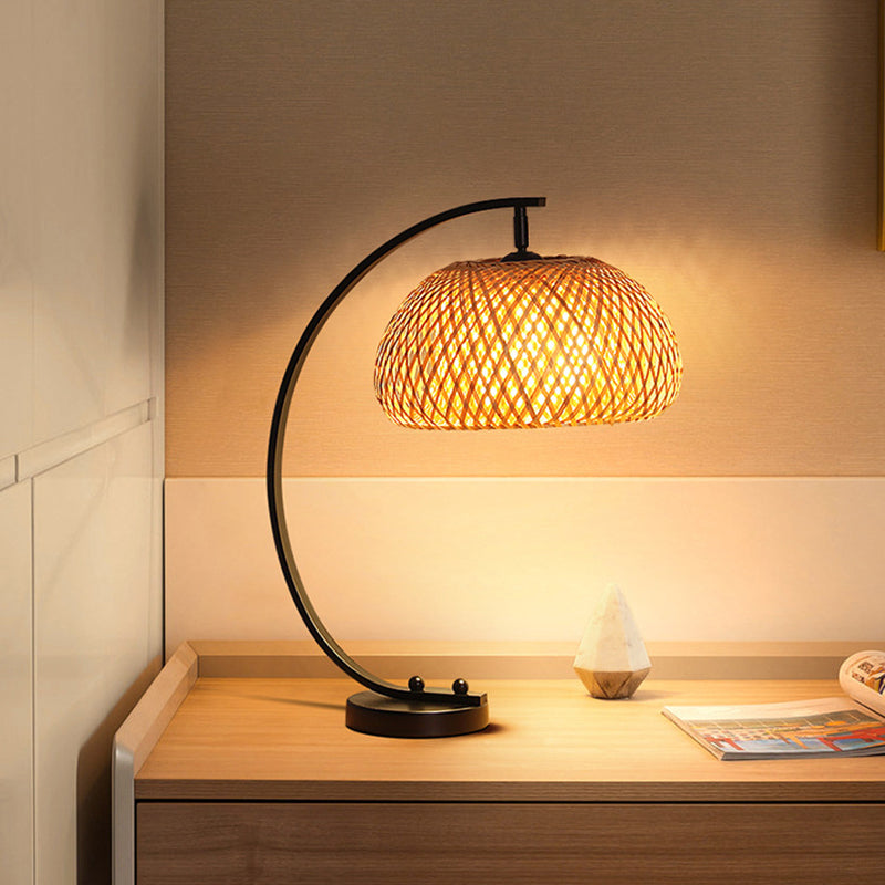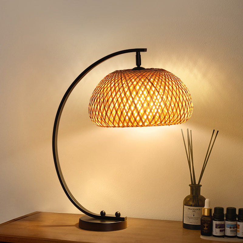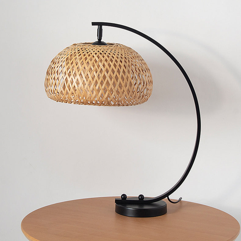 Traditional Chinese Curved Pole Round Mesh Shade Iron Bamboo 1-Light Table Lamp For Bedroom