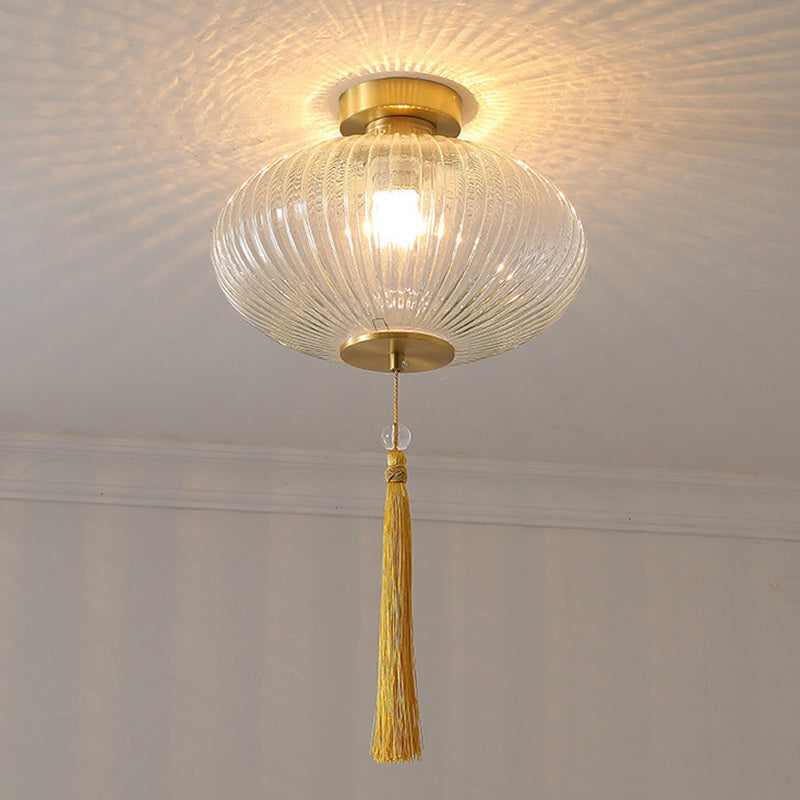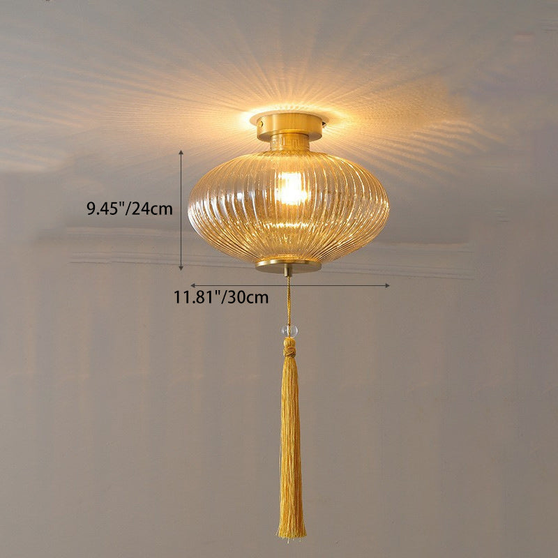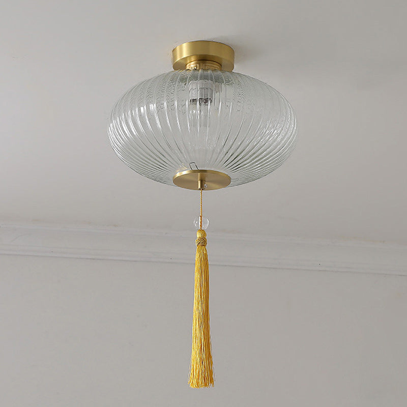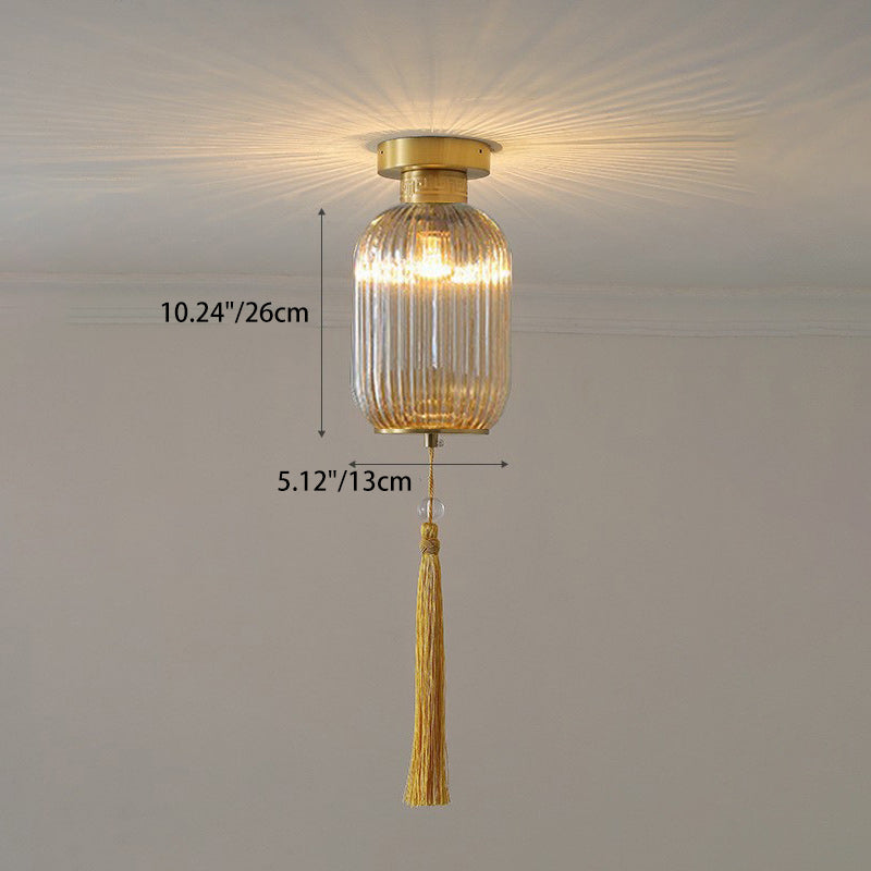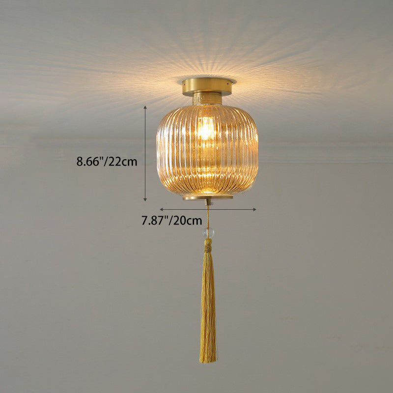 Traditional Chinese Cylinder Oval Copper Glass 1-Light Semi-Flush Mount Ceiling Light For Hallway