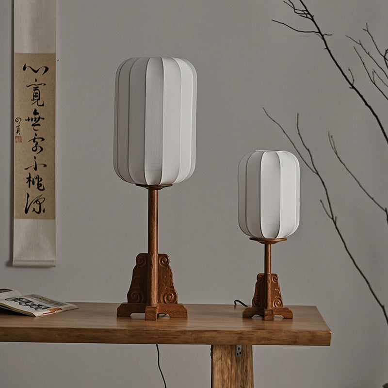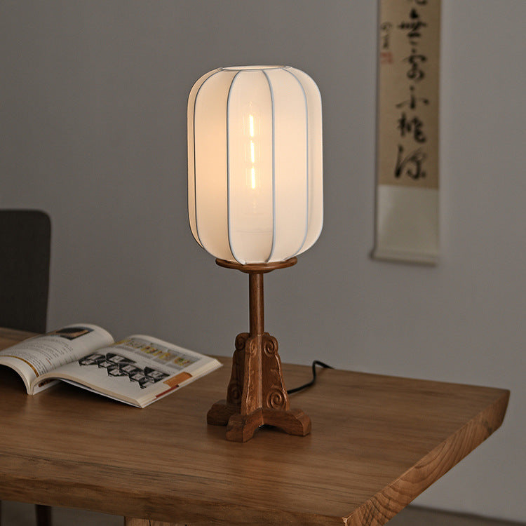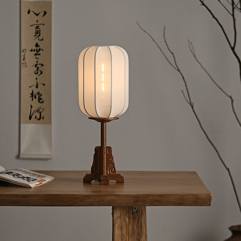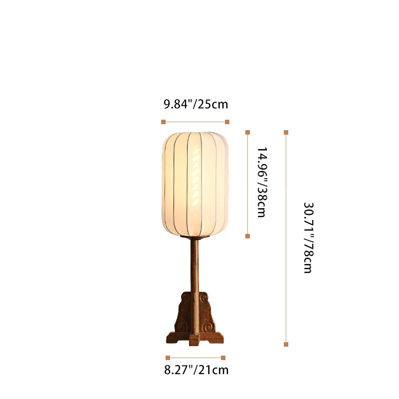 Traditional Chinese Cylindrical Wood Silk 1-Light Table Lamp For Living Room