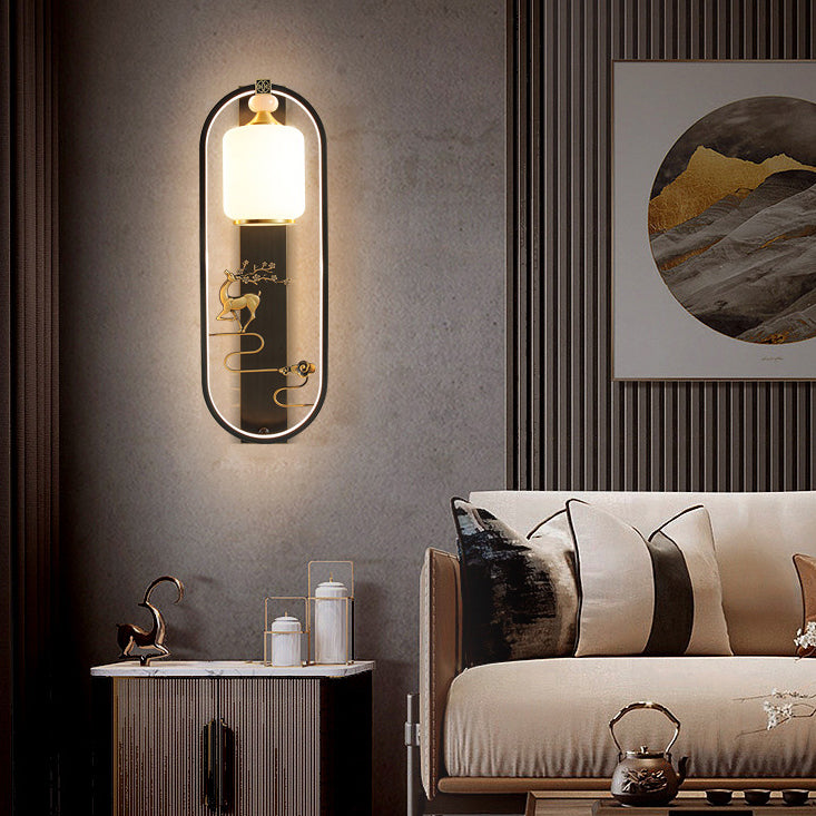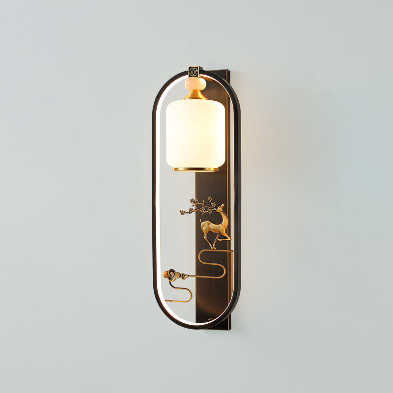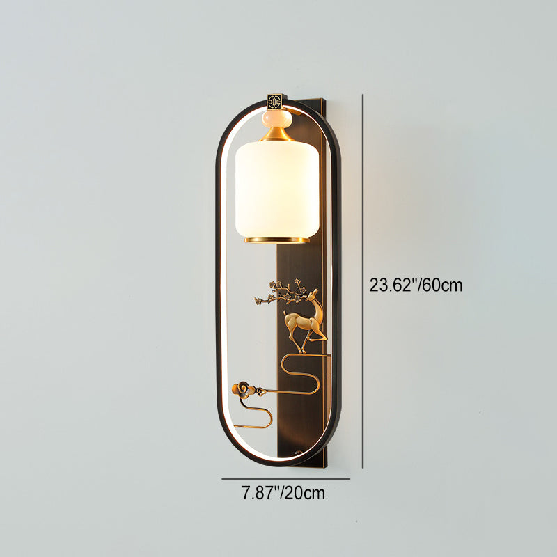 Traditional Chinese Deer Cylinder Oval Glass Jade Brass LED Wall Sconce Lamp For Living Room