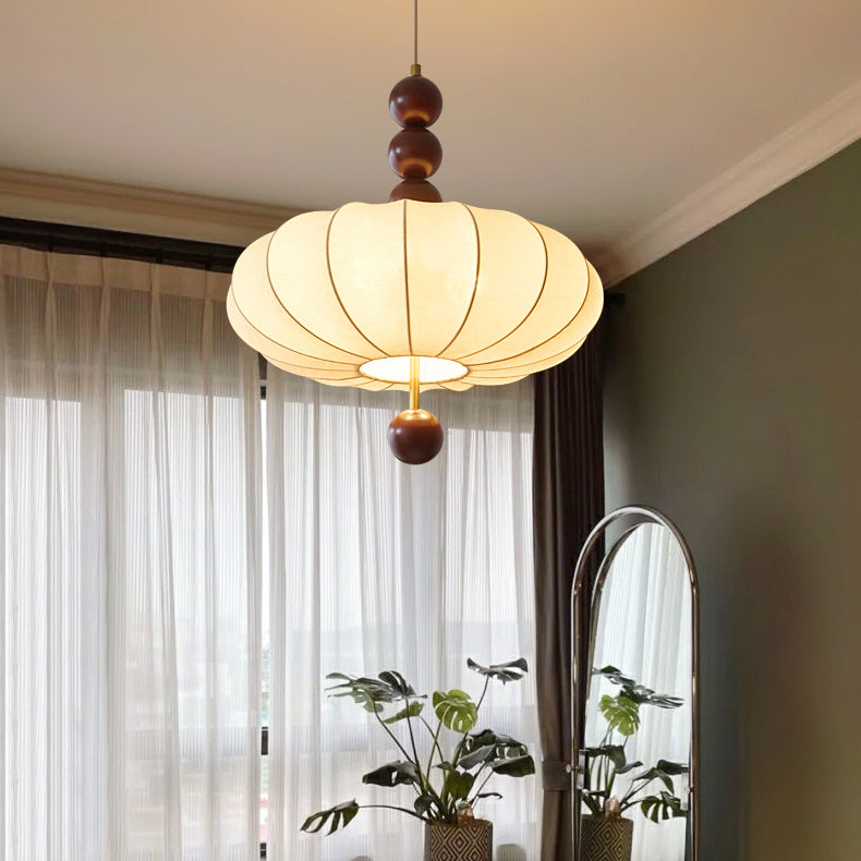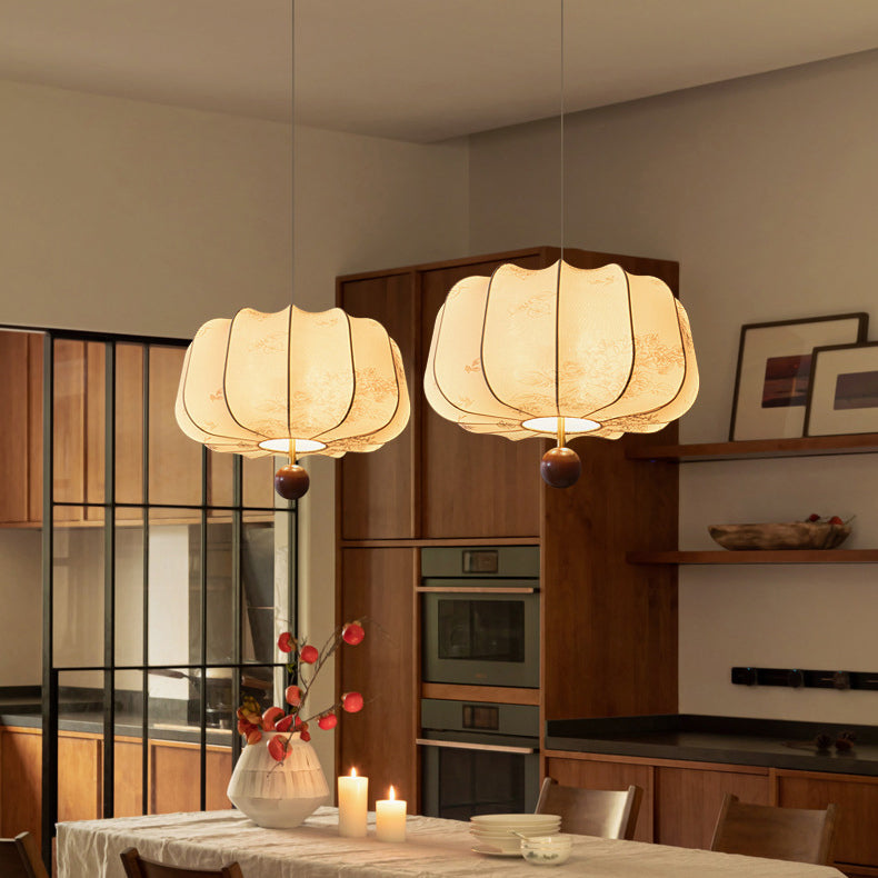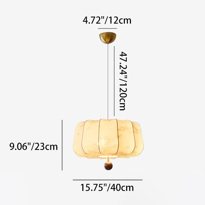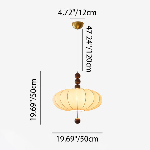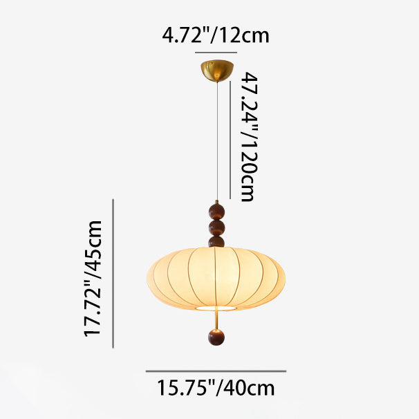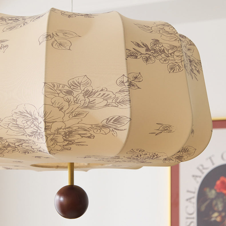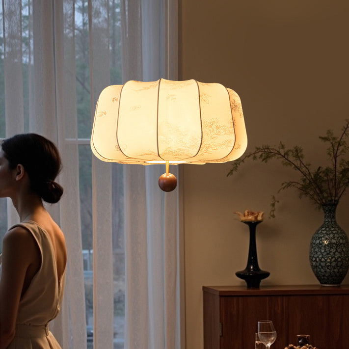 Traditional Chinese Flat Round Fabric Wood 3/4 Light Pendant Light For Bedroom