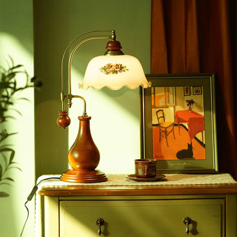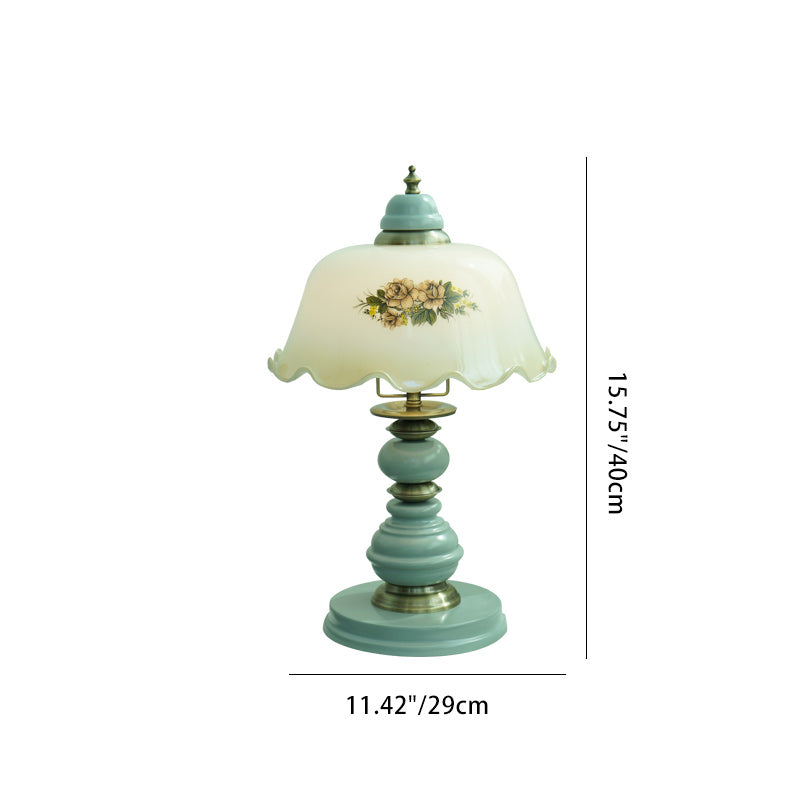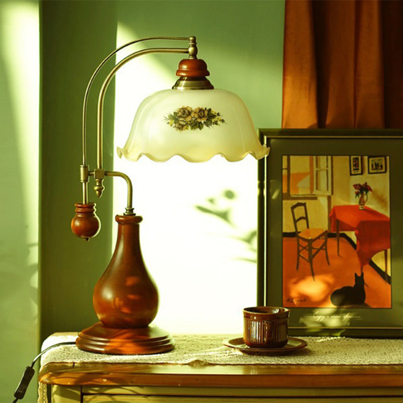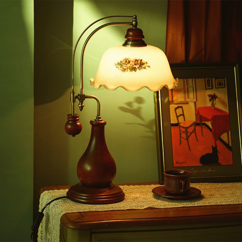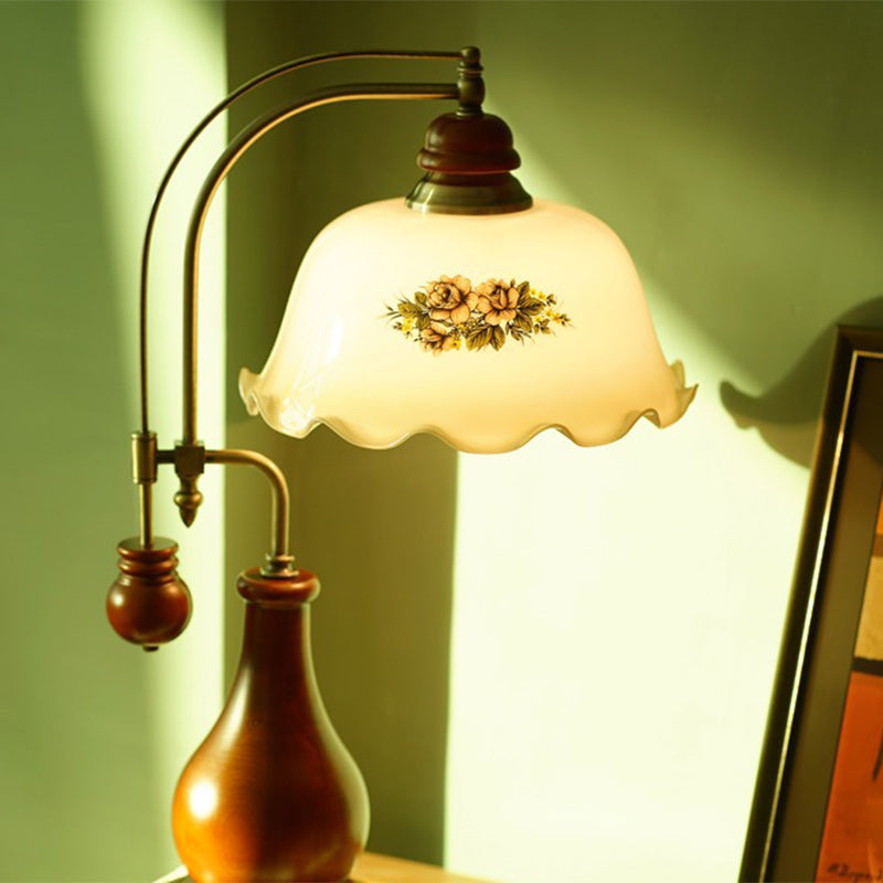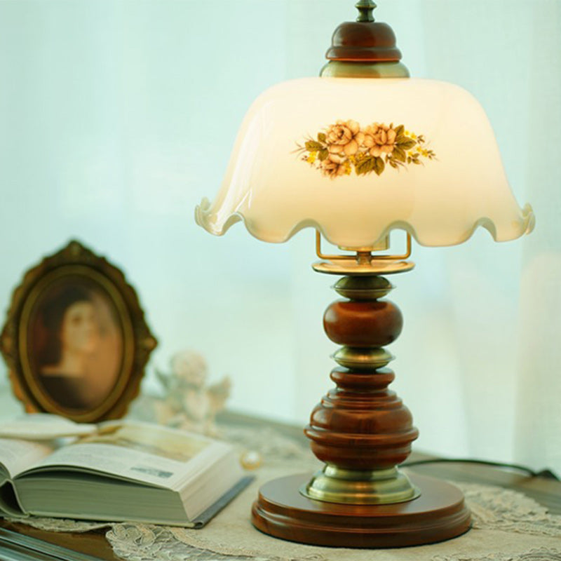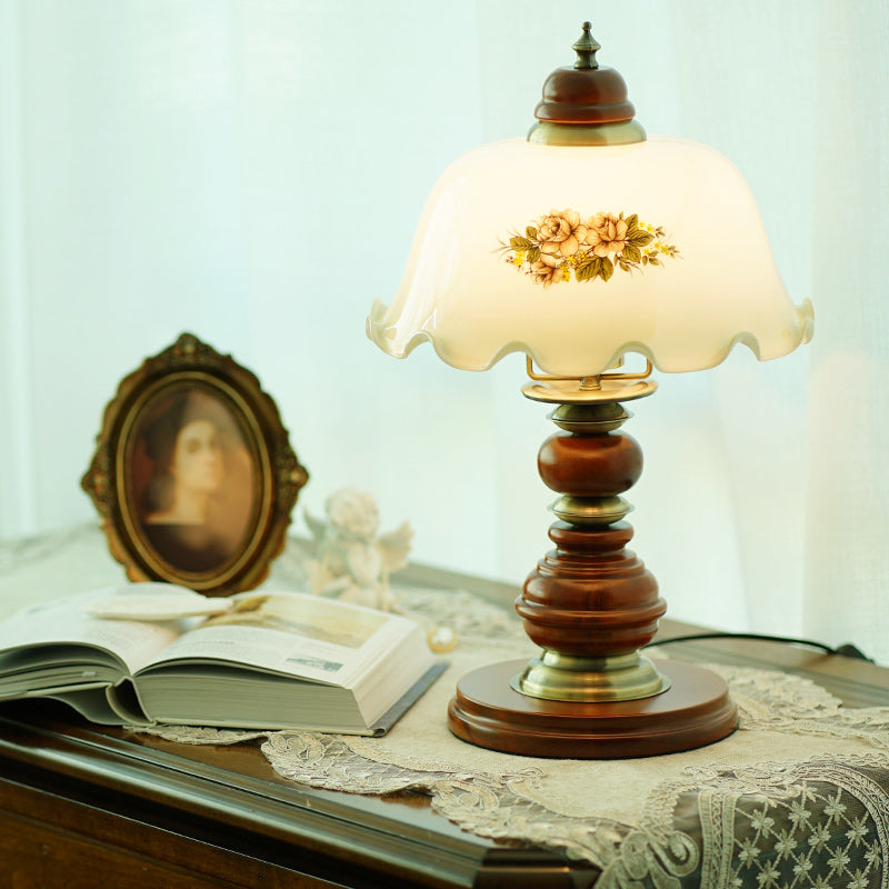 Traditional Chinese Flower Dome Glass Copper Solid Wood 1-Light Table Lamp For Bedroom