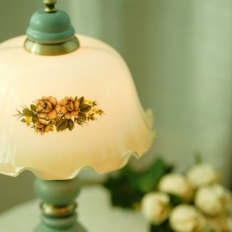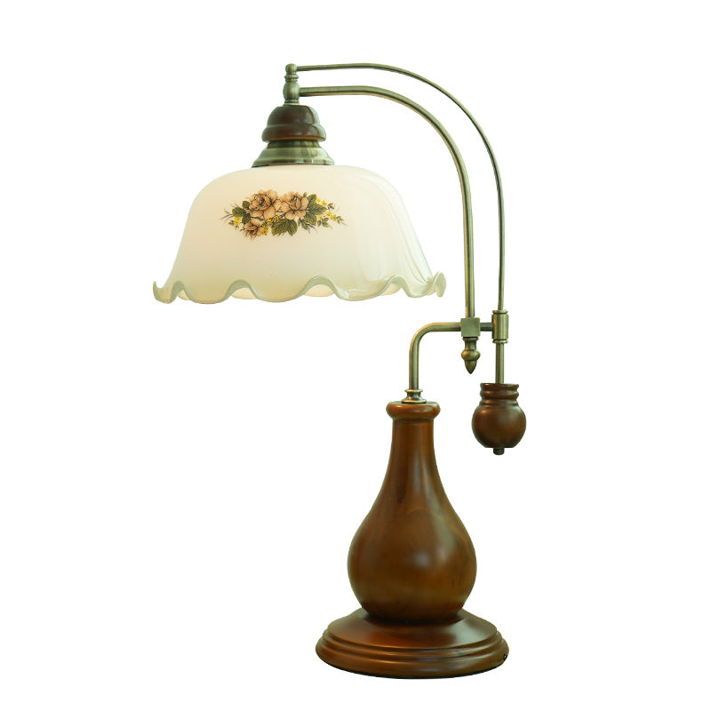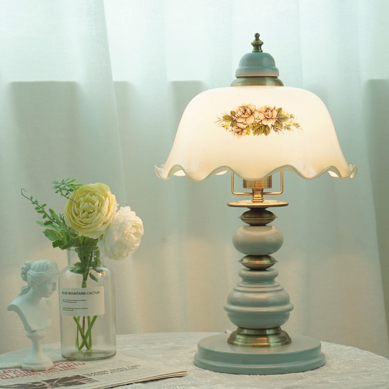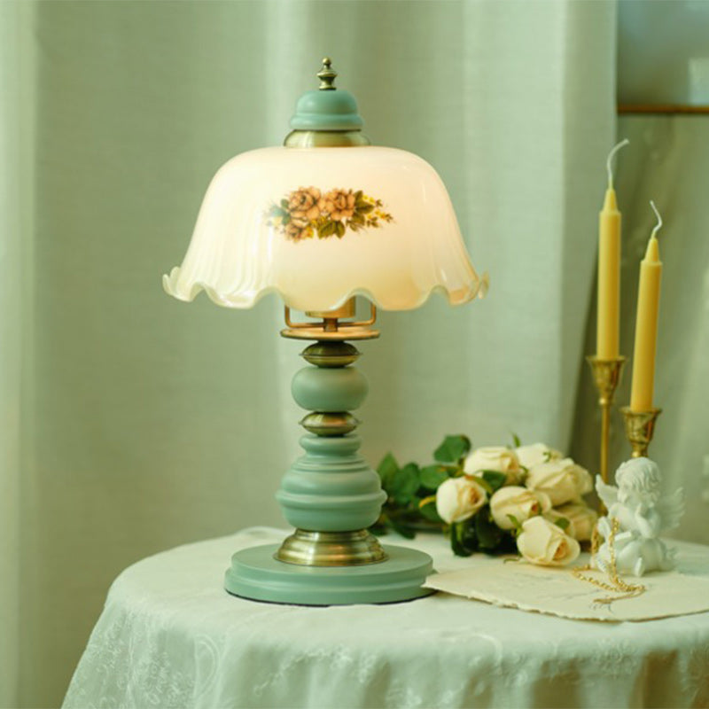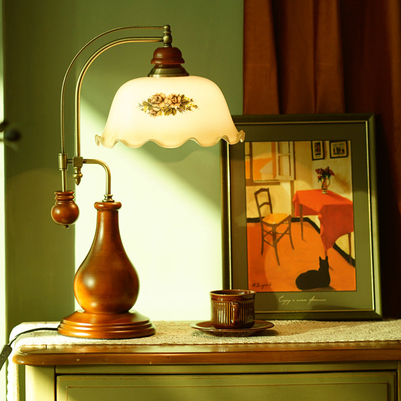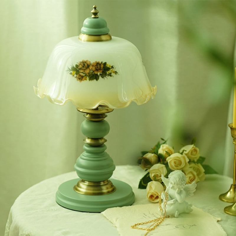 Traditional Chinese Flower Dome Glass Copper Solid Wood 1-Light Table Lamp For Bedroom