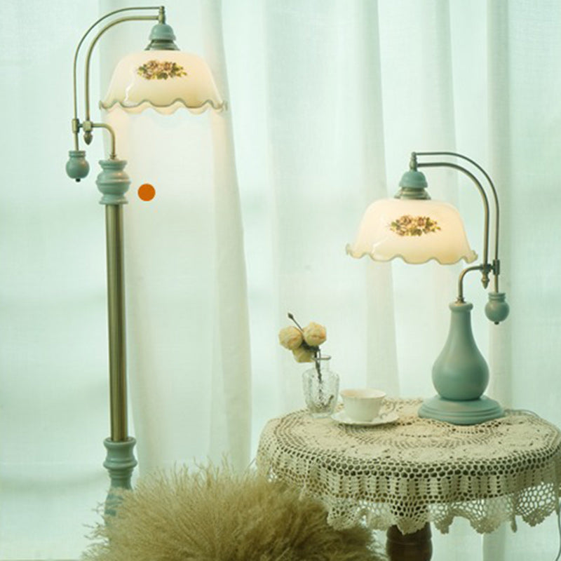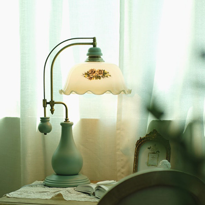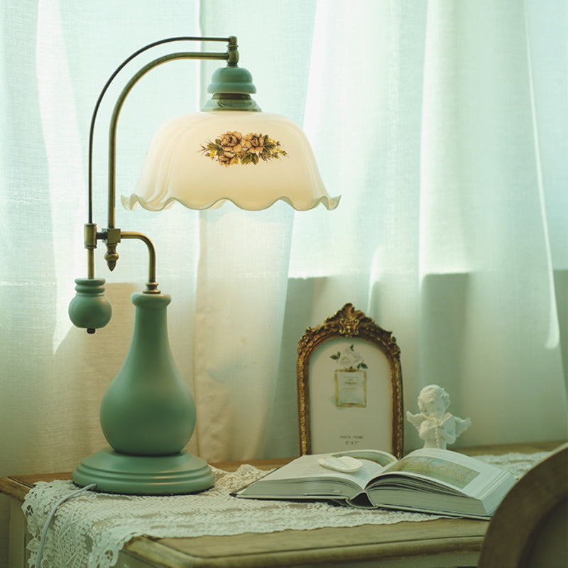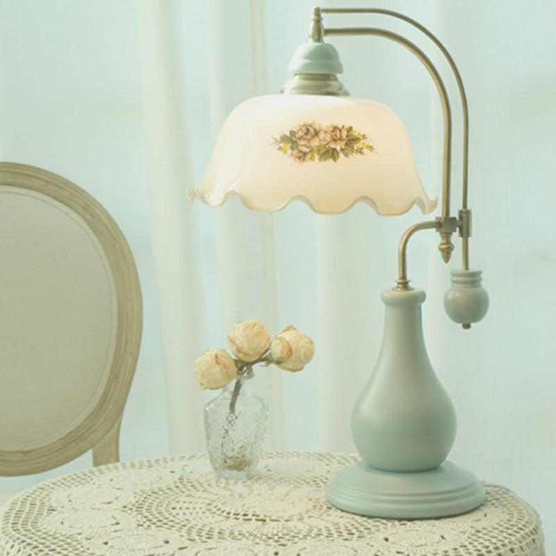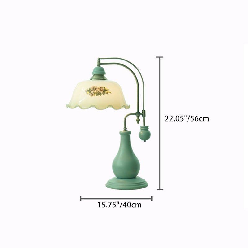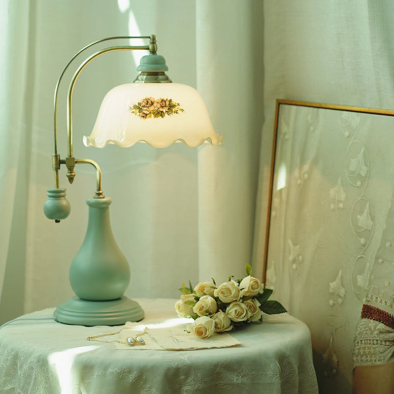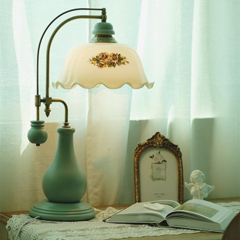 Traditional Chinese Flower Dome Glass Copper Solid Wood 1-Light Table Lamp For Bedroom