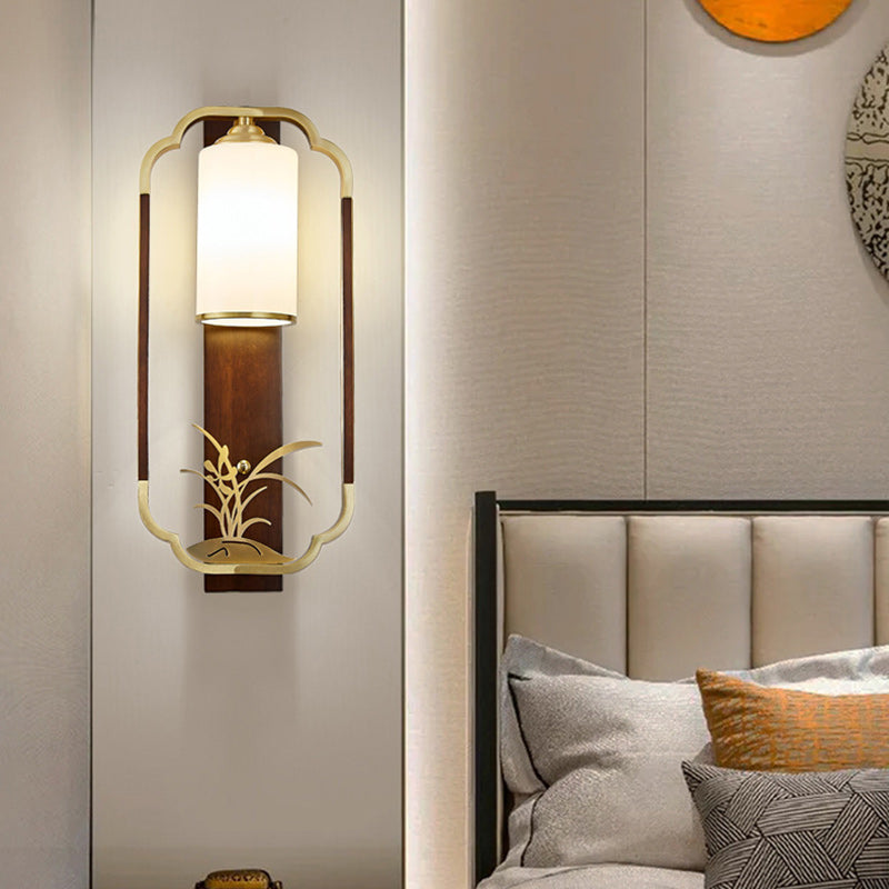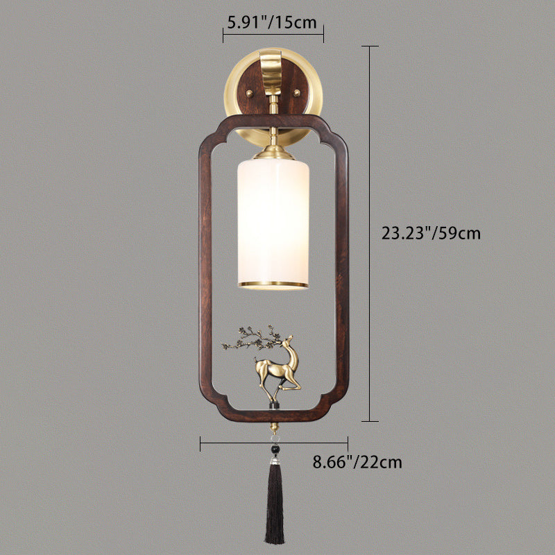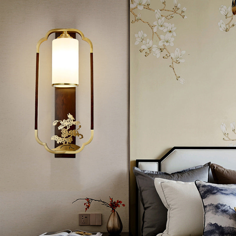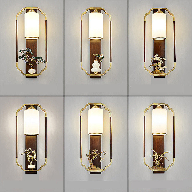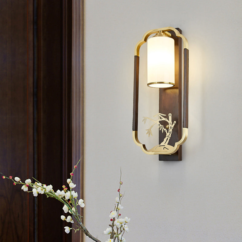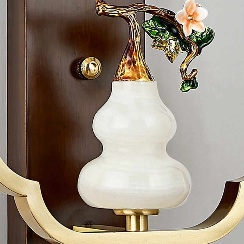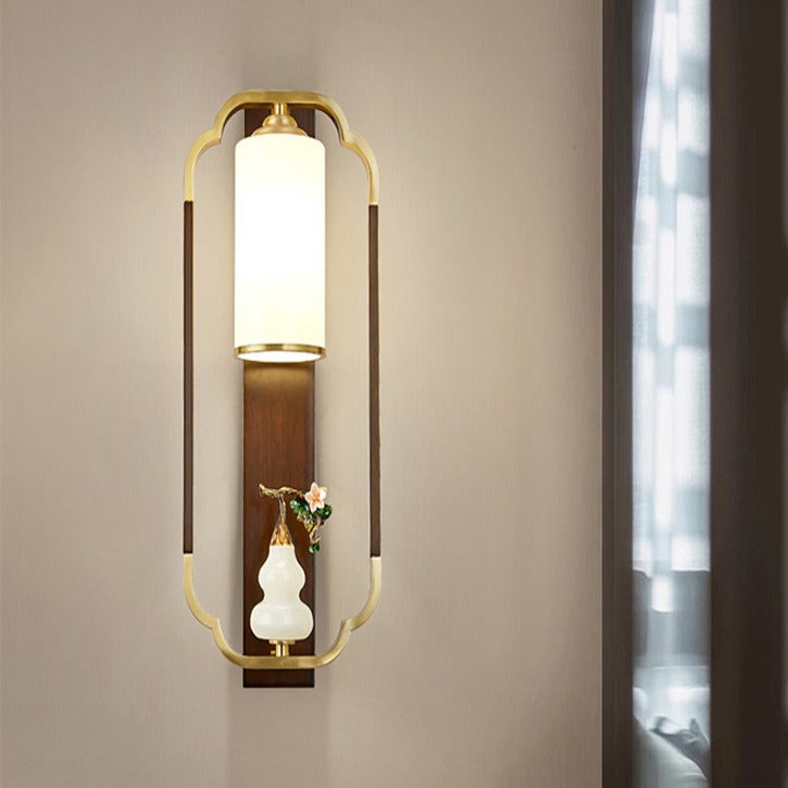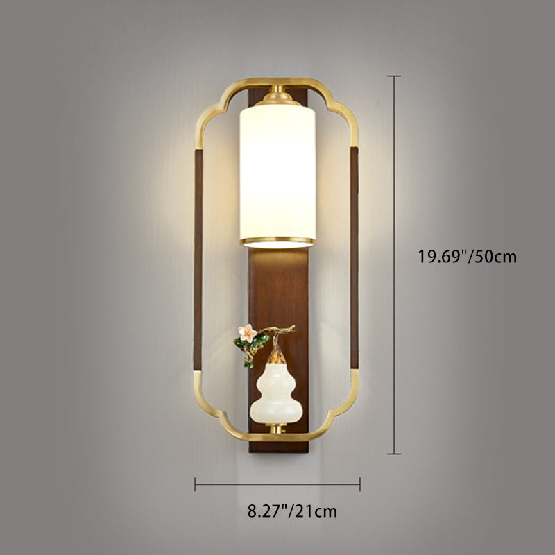 Traditional Chinese Gourd Rectangle Walnut Copper Glass 1-Light Wall Sconce Lamp For Bedroom