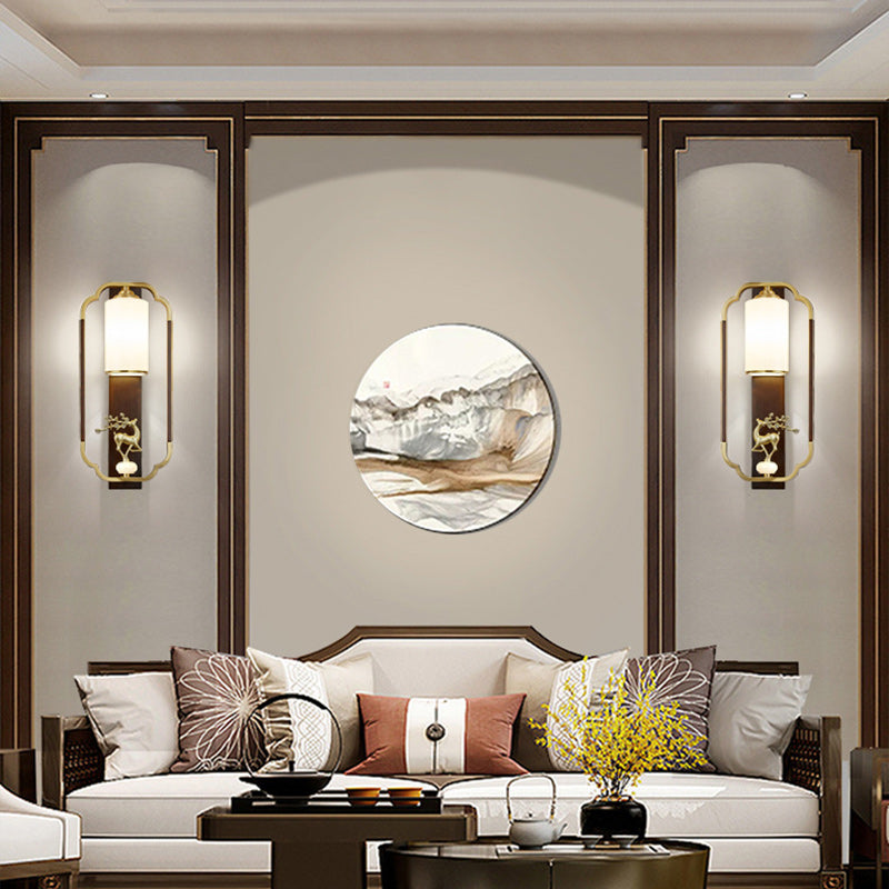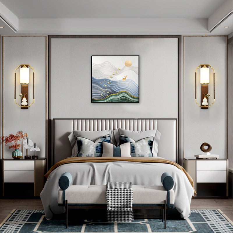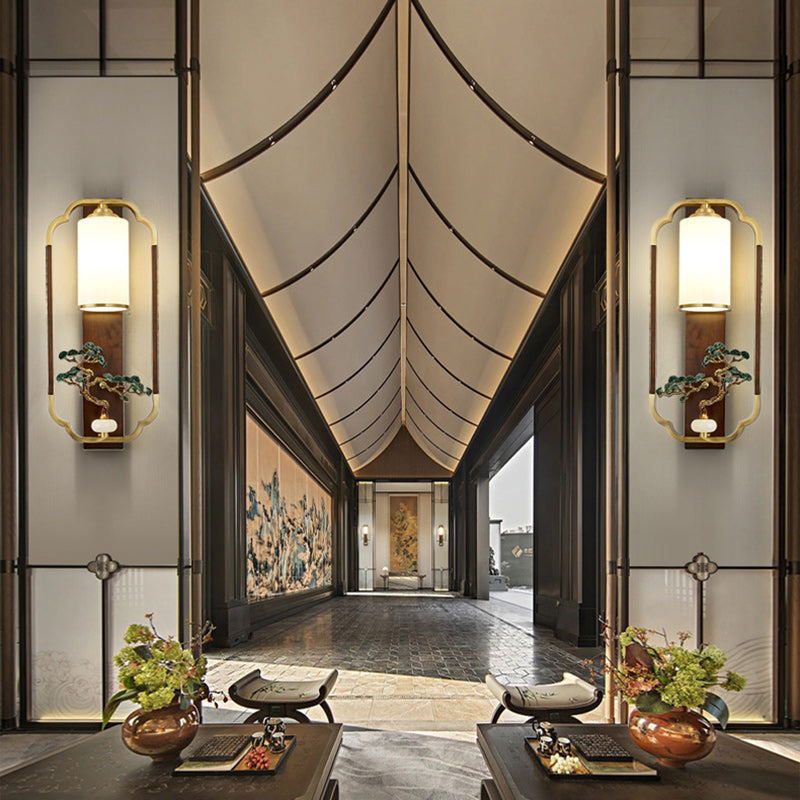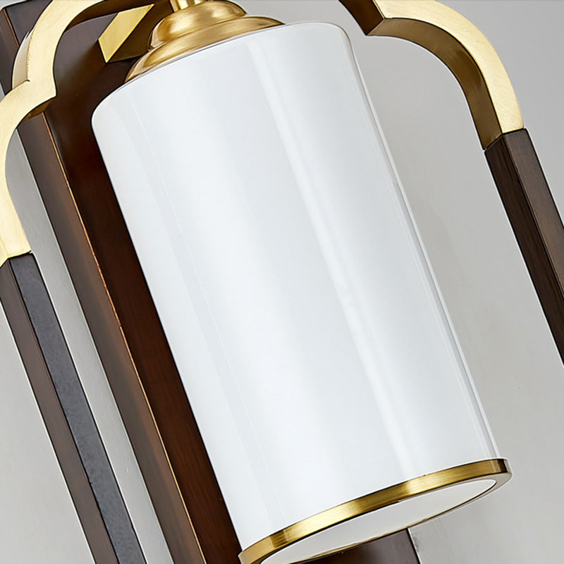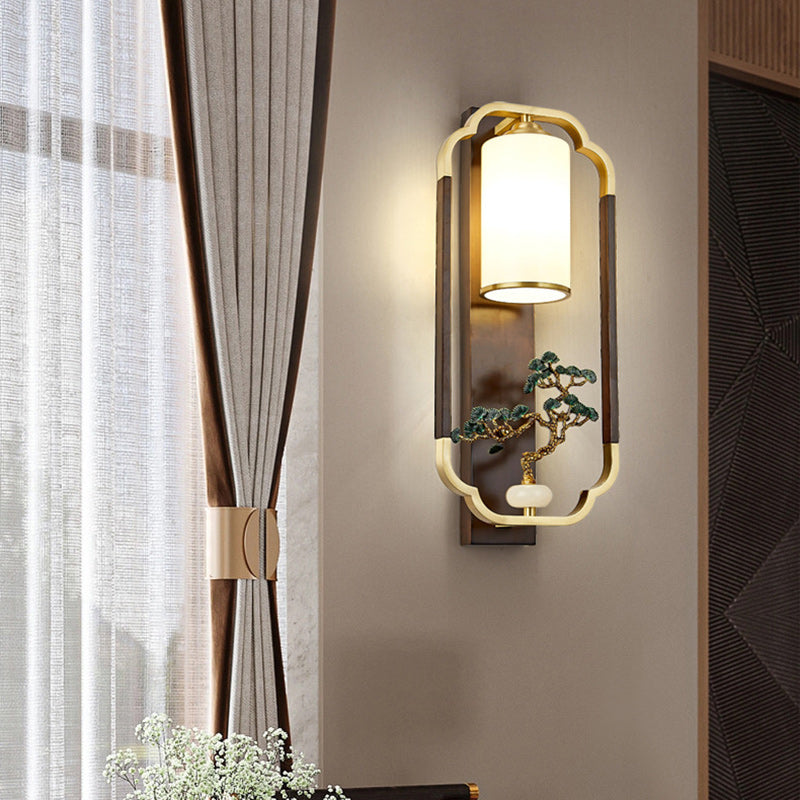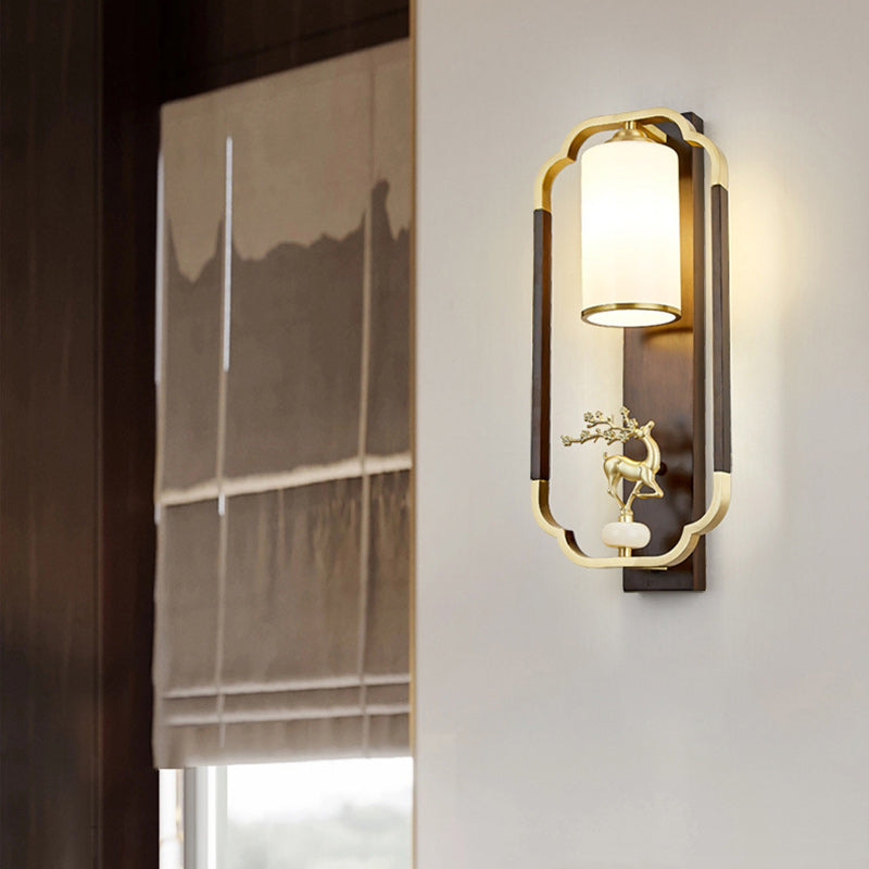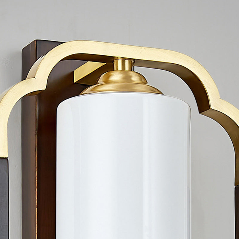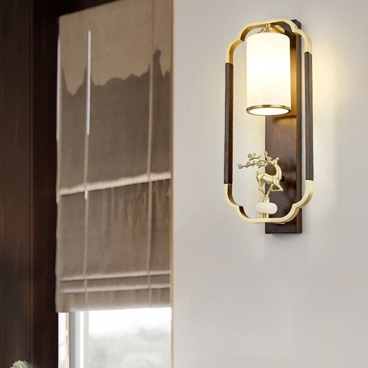 Traditional Chinese Gourd Rectangle Walnut Copper Glass 1-Light Wall Sconce Lamp For Bedroom