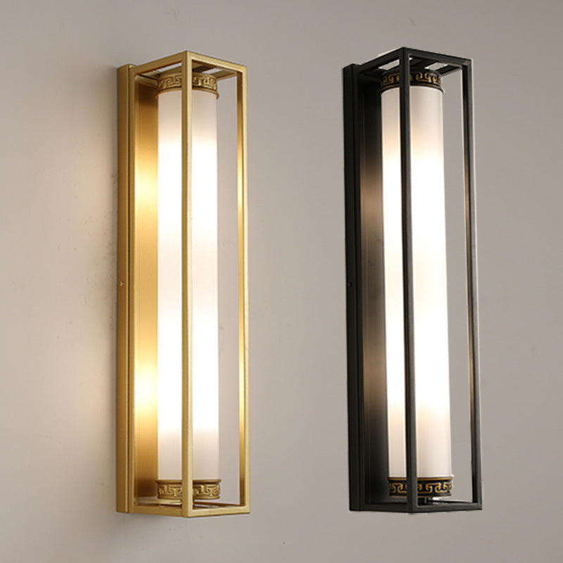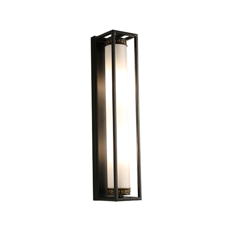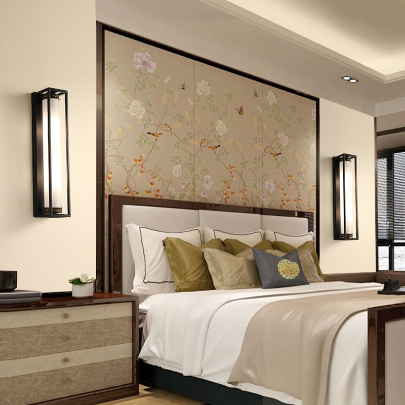 Traditional Chinese Iron Glass Rectangular Cylinder 2-Light Wall Sconce Lamp For Living Room