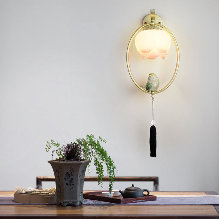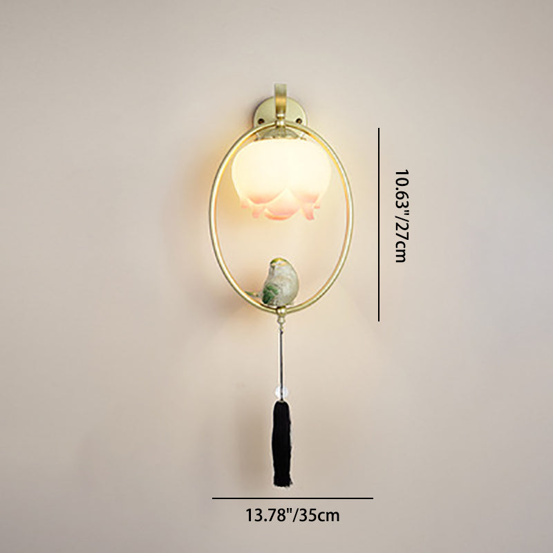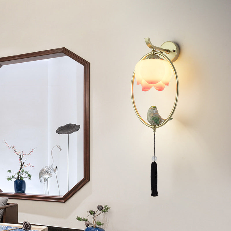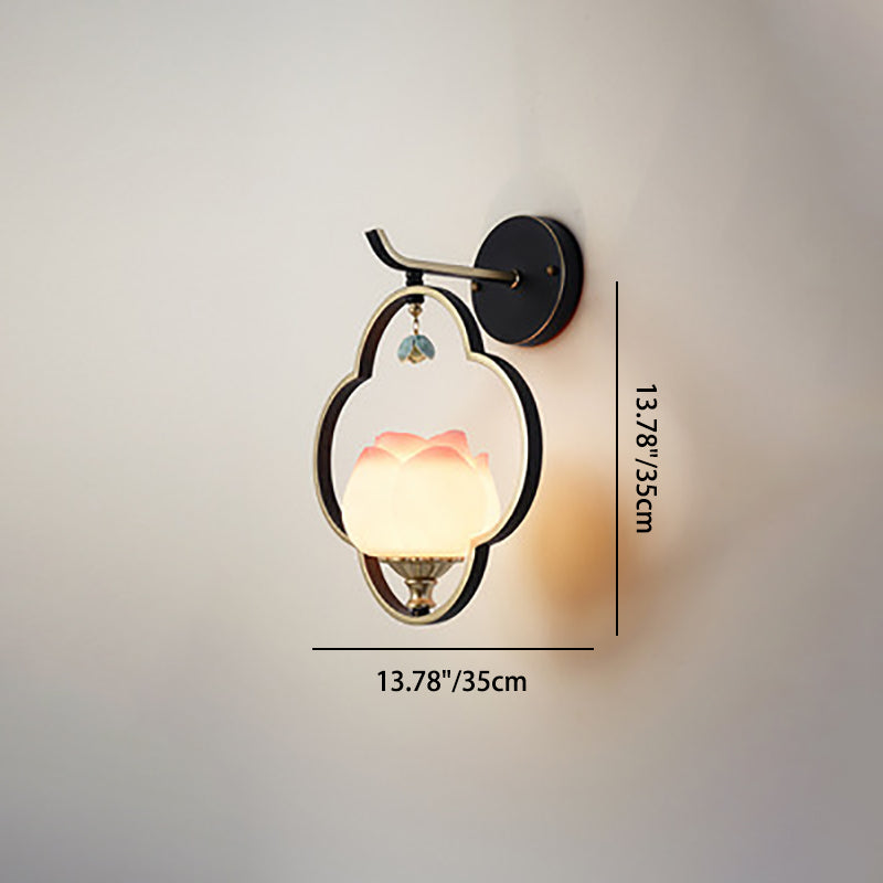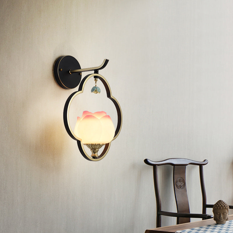 Traditional Chinese Iron Resin Lotus Flower Elliptical Irregular Shape 1-Light Wall Sconce Lamp For Dining Room